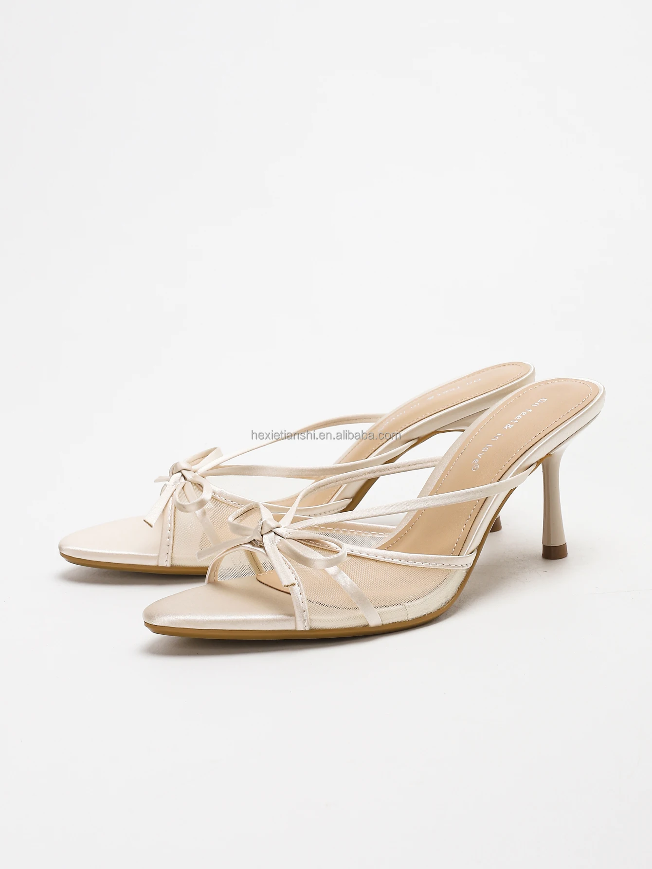 4302A-66 Summer Fashionable Women's High-Heeled Mule Slippers Breathable Lace Bow Decor Open Toe Wedding and Outdoor Sandals