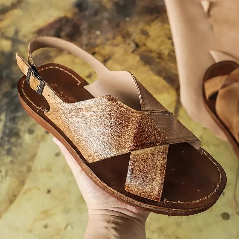 2026 Summer Style Leather Men Handmade Sandals Crossed-strap Design Shoes