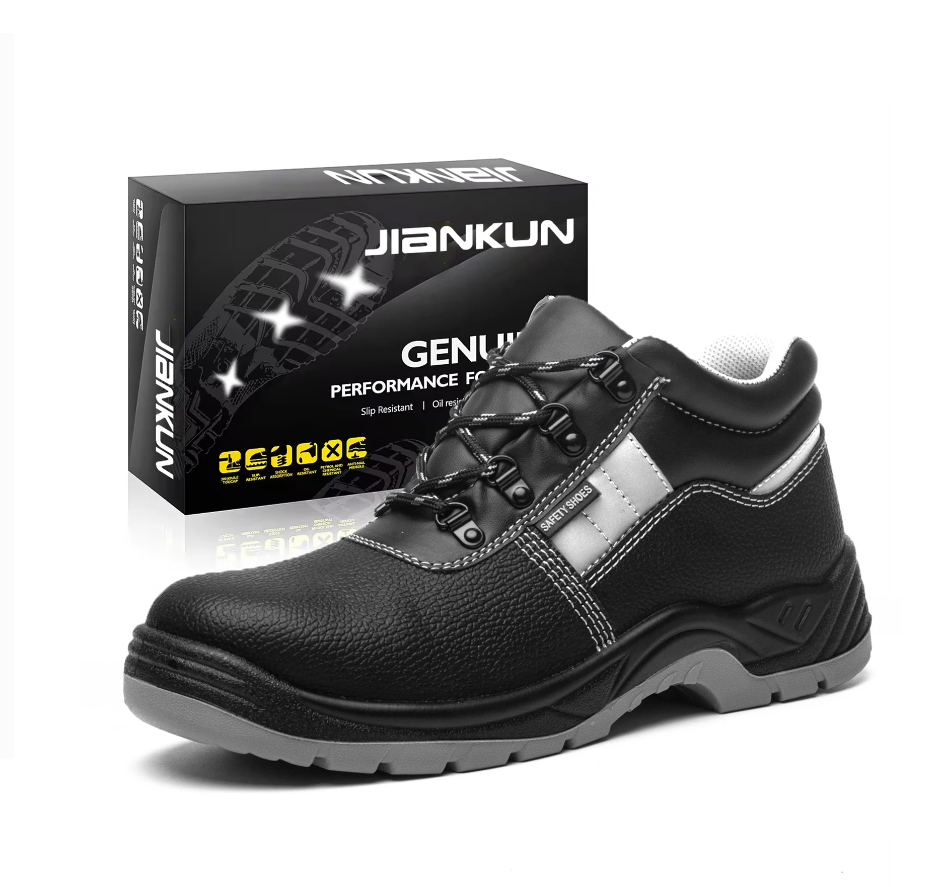 JIANKUN CE Certificate Black Steel Toe Embossed Leather Outsole PU-PU Cheap Price Work Safety Shoes with Reflective Strip