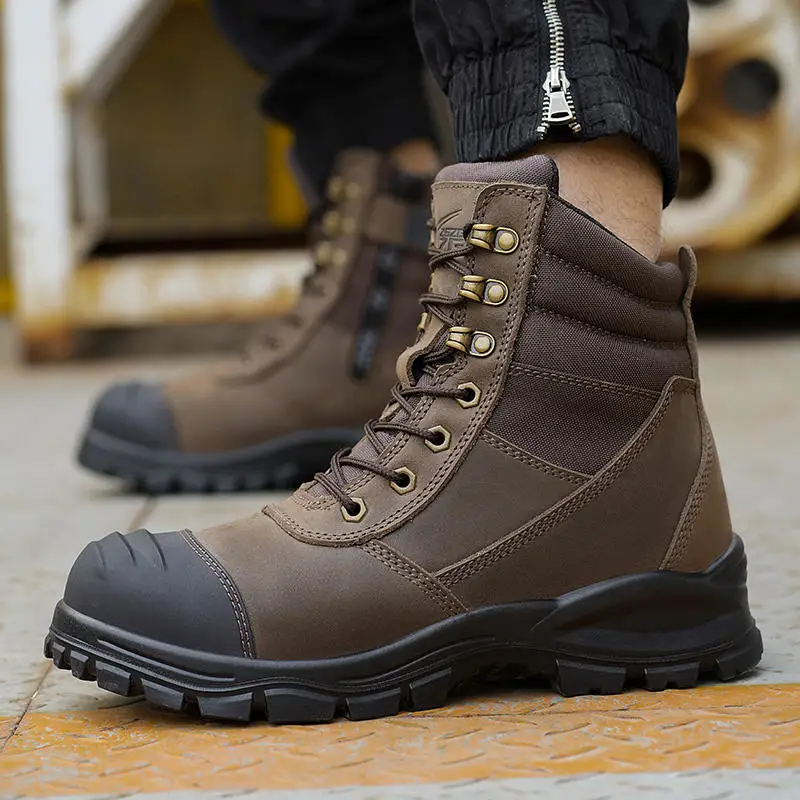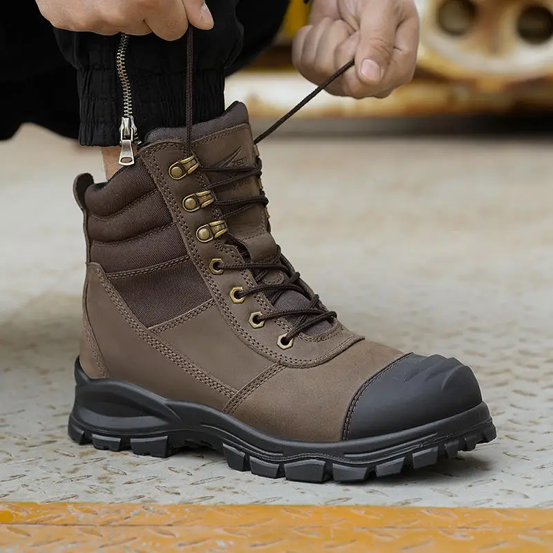 JIANKUN Factory Direct to Sell Crazy Horse Leather Working Worker Shoes High Ankle Brown Work Safety Boots for Men