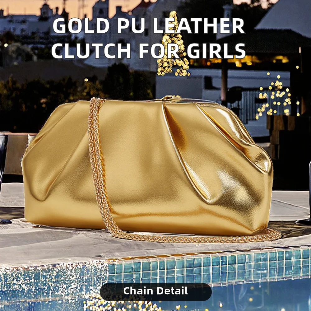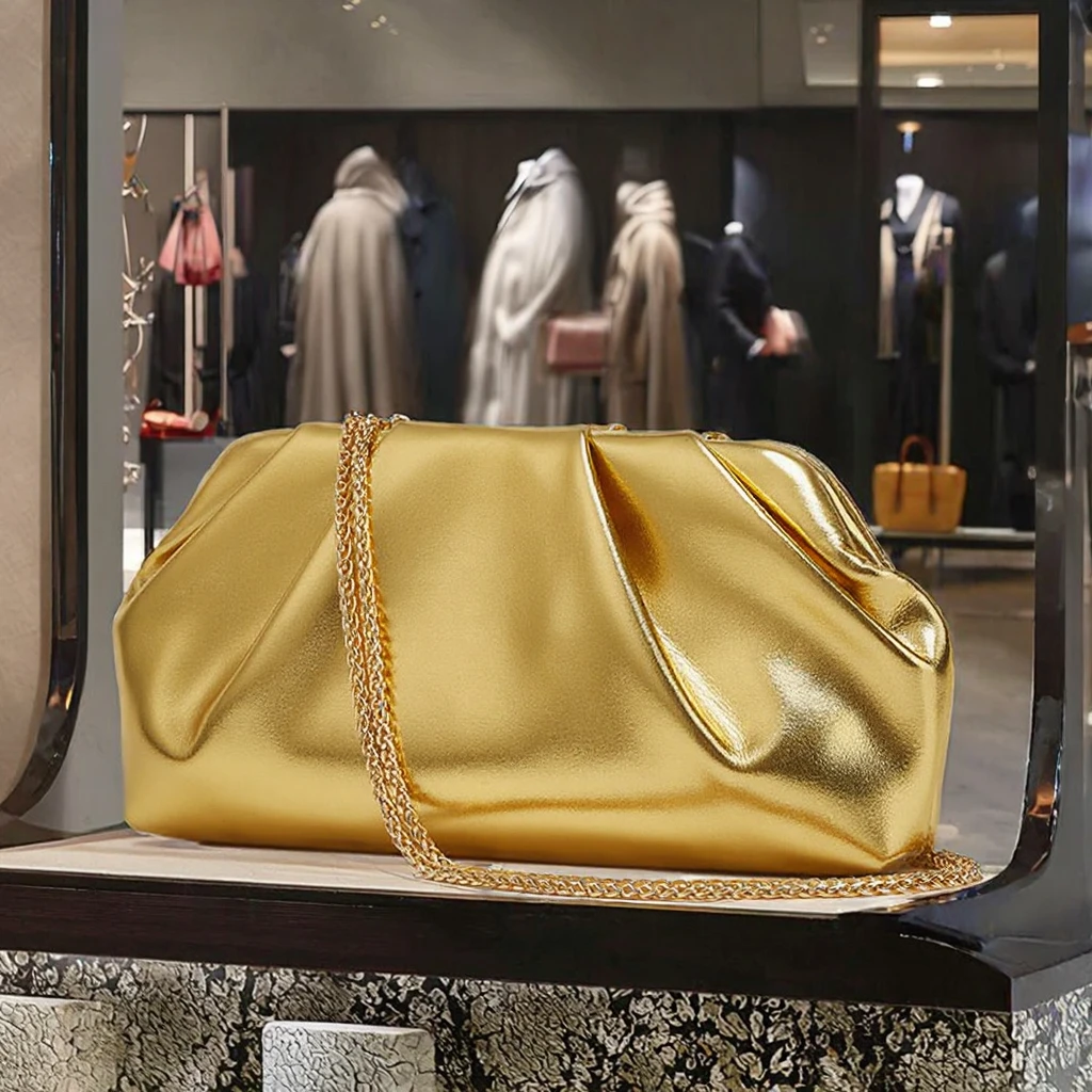 Wholesale Luxury Women's Gold PU Leather Clutch Bag with Chain Shoulder Strap Fashionable Wrinkled Cloud Design for Girls