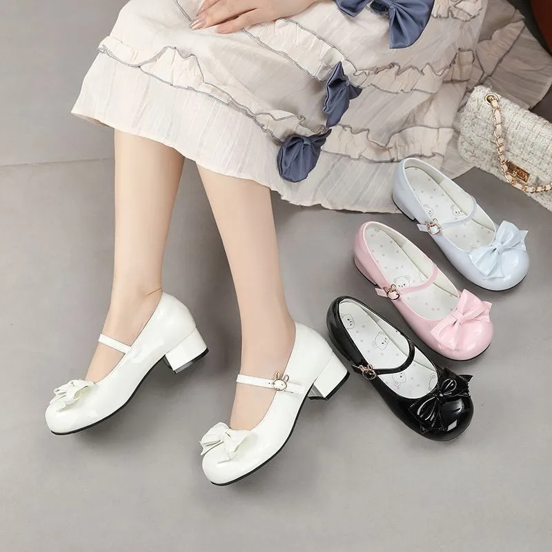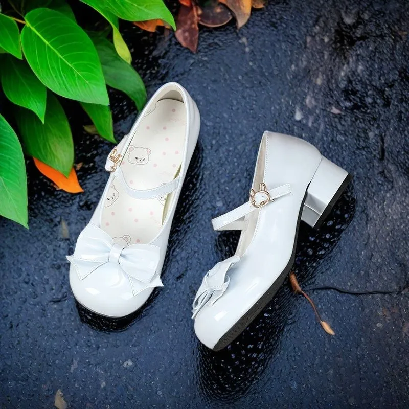 Ladies Lolita Shoes Low-Heeled Round-Toed Pumps Single Strap Bow-Tied Mary Jane Style Height Increasing Button for Summer
