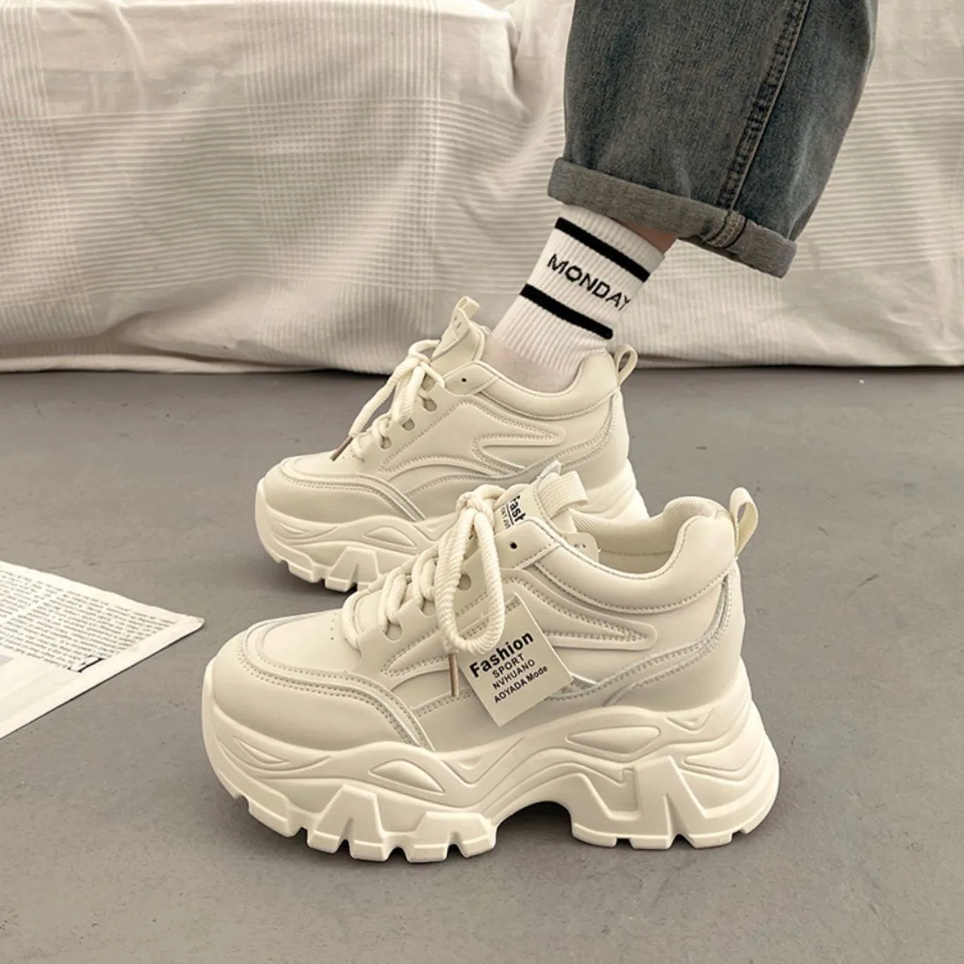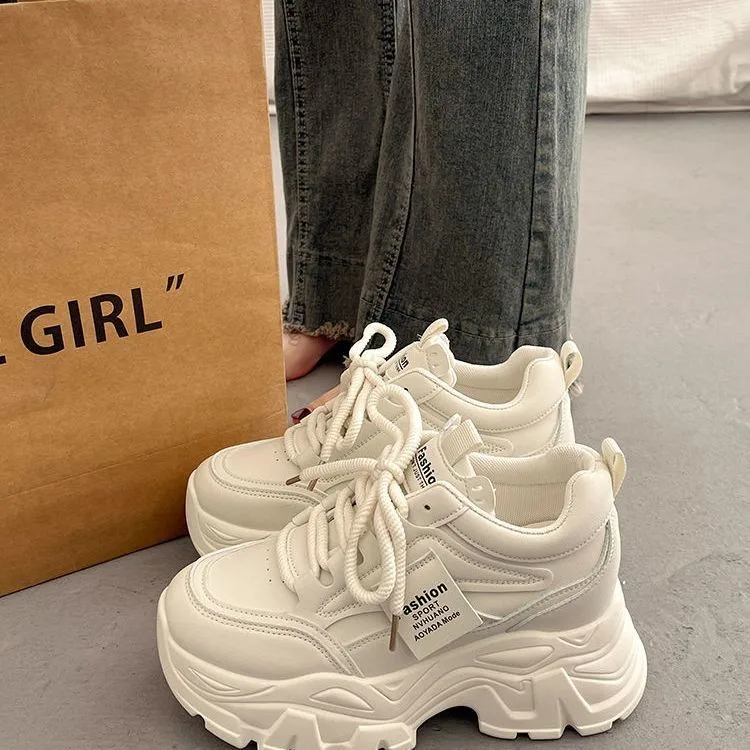 Women's White Lace-Up Platform Sneakers PU Upper Rubber Outsole Embroidery All Seasons Chunky Height Increasing Design