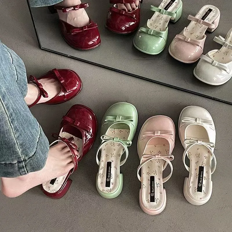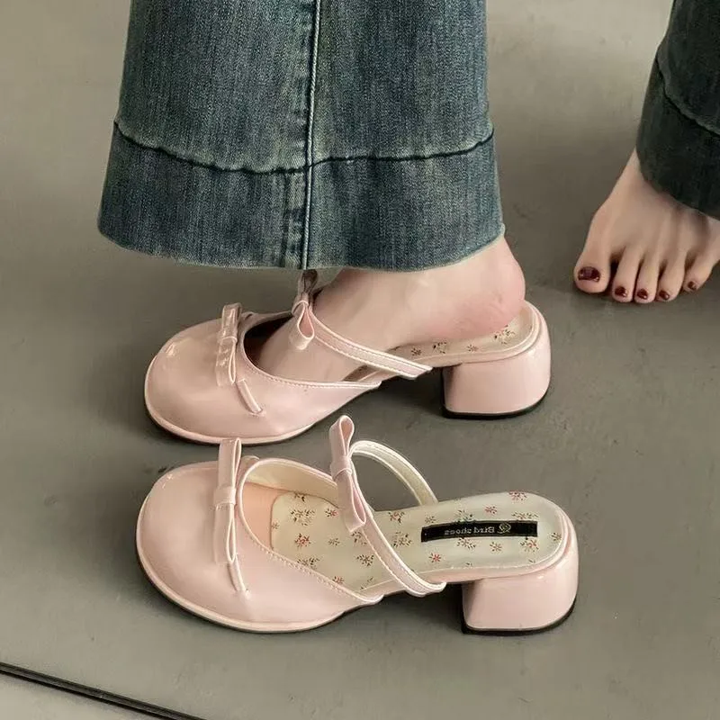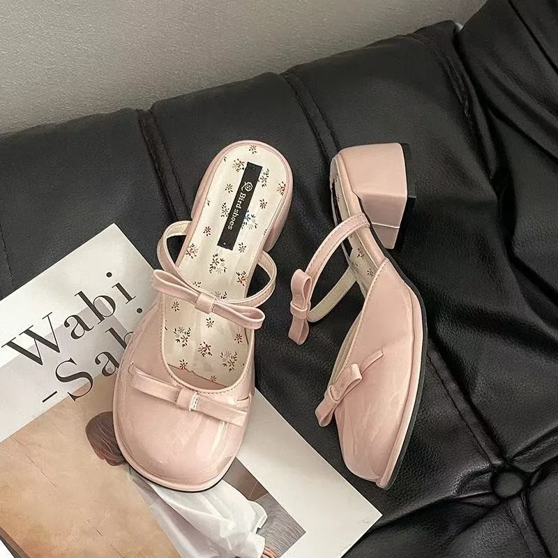 2026 New Summer Bowknot High Heel Women's Fashion Striped Open Toe Outdoor Beach Slippers High Top Slip-On Closure Trendy