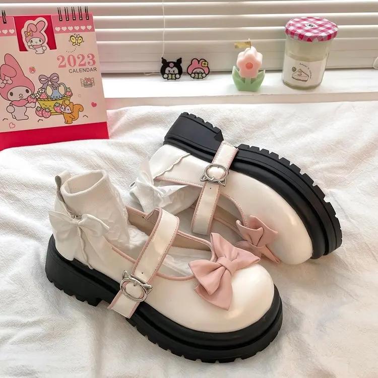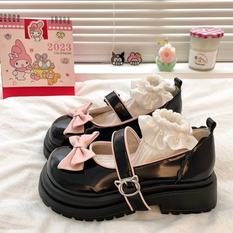 2026 Spring Women's All-Match Academy Style Skirt with JK Small Leather Shoes Sweet Bow Platform Heel Single-Layer Pumps