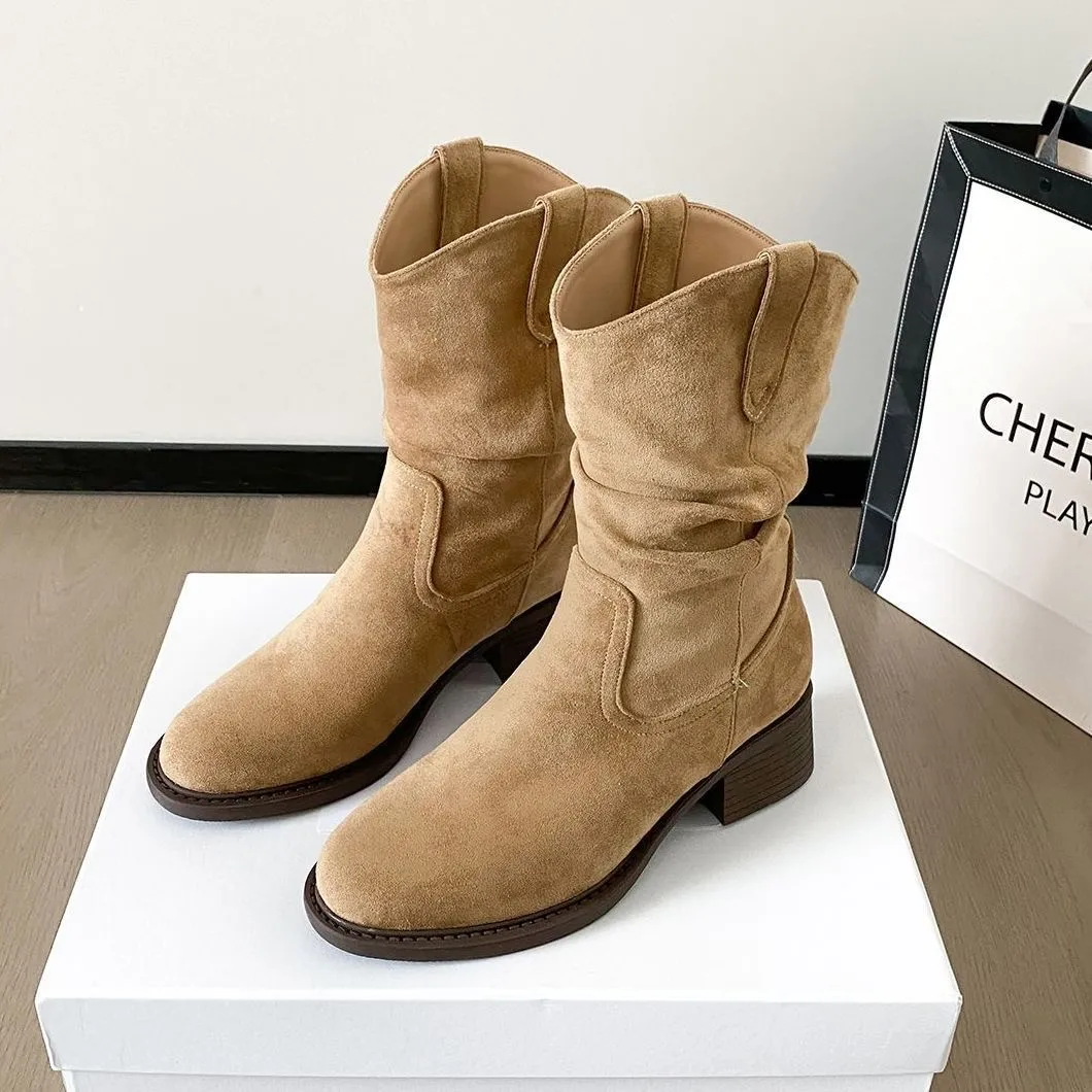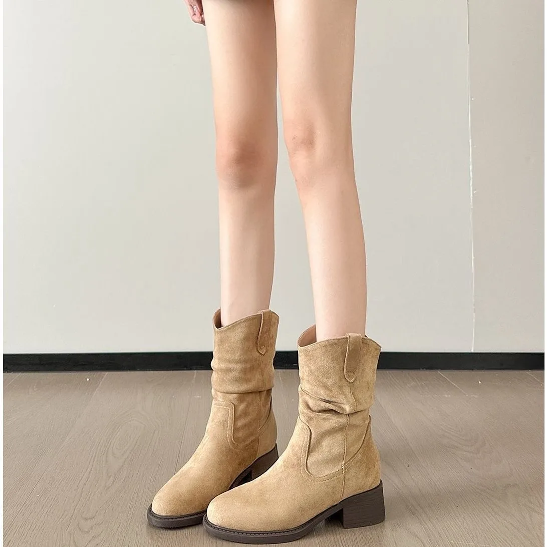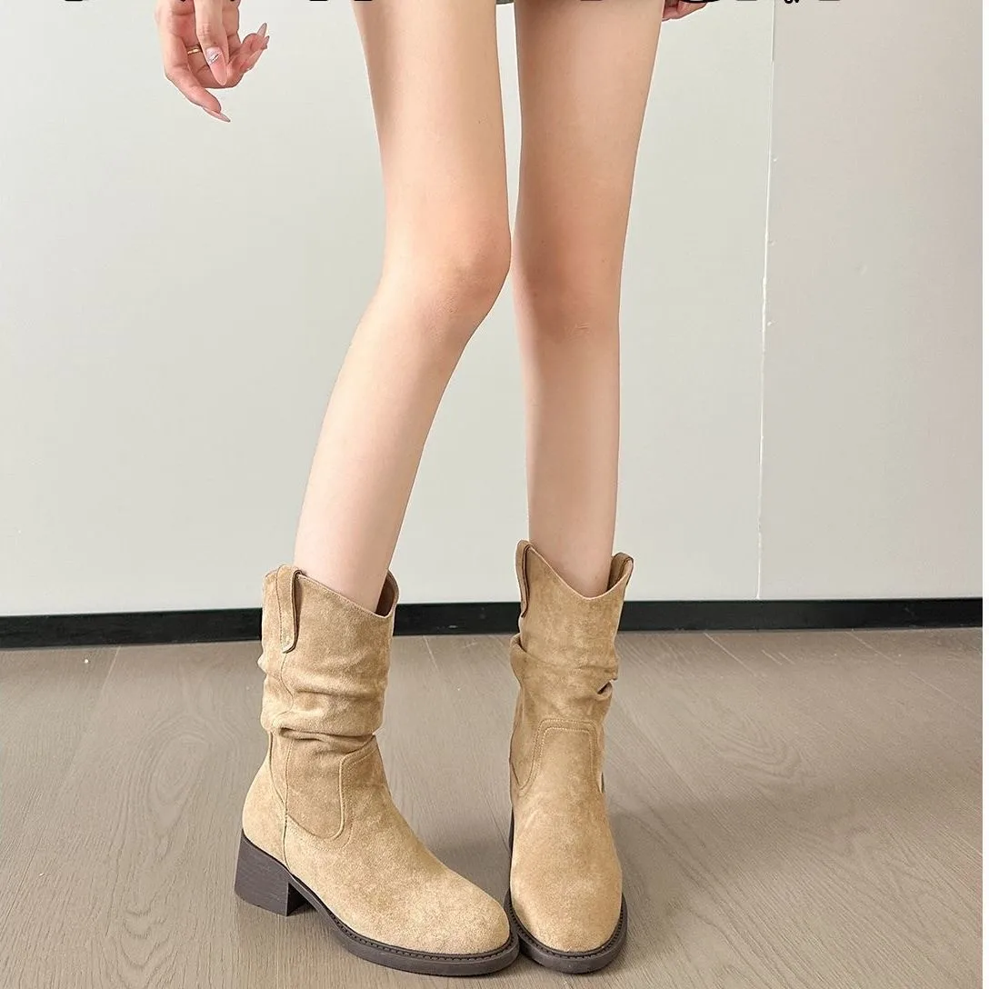 Women's Retro Western Cowboy Bunch Boots Pleated Large Shaft Slip-On Breathable Height Increasing Winter Classic Korean