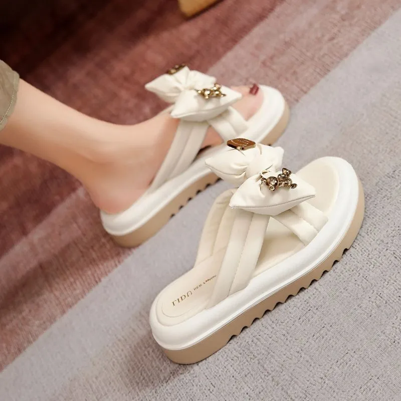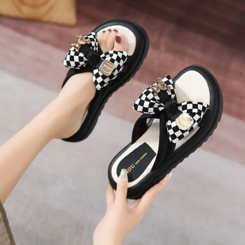 Summer Women's Fashion Midsole Platform Korean Style Printed Bow Lightweight Soft Quick-Drying Anti-Slip Rubber Outsole