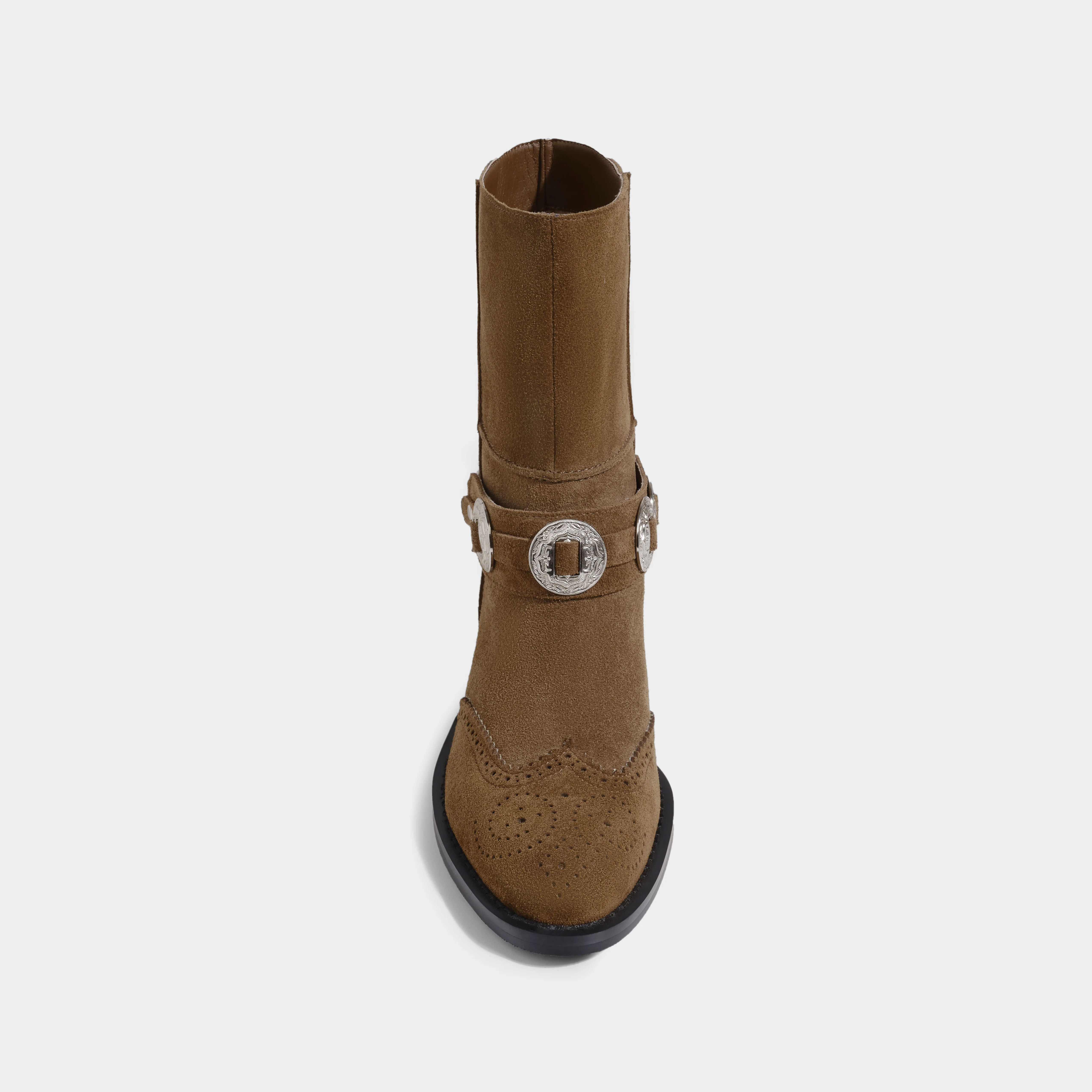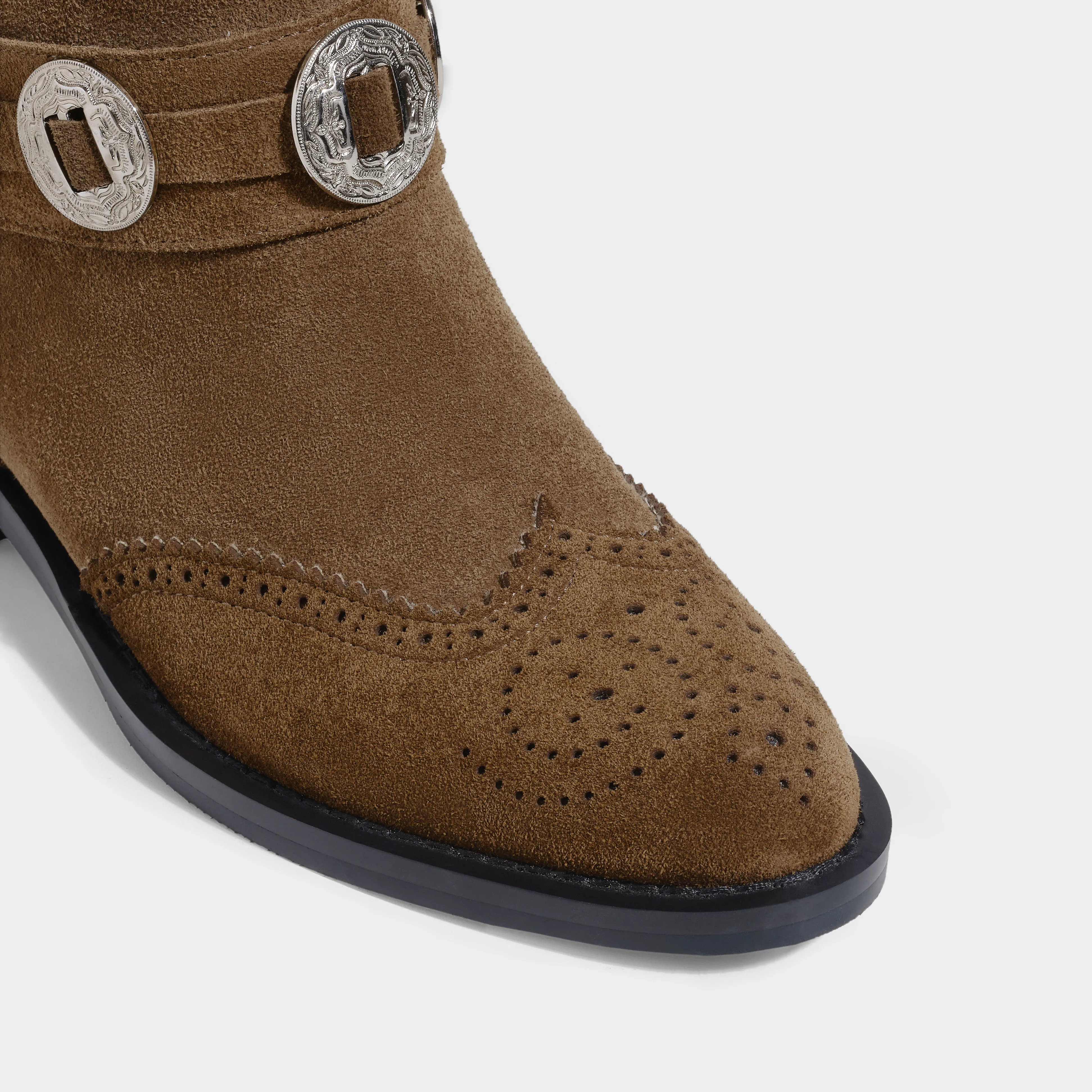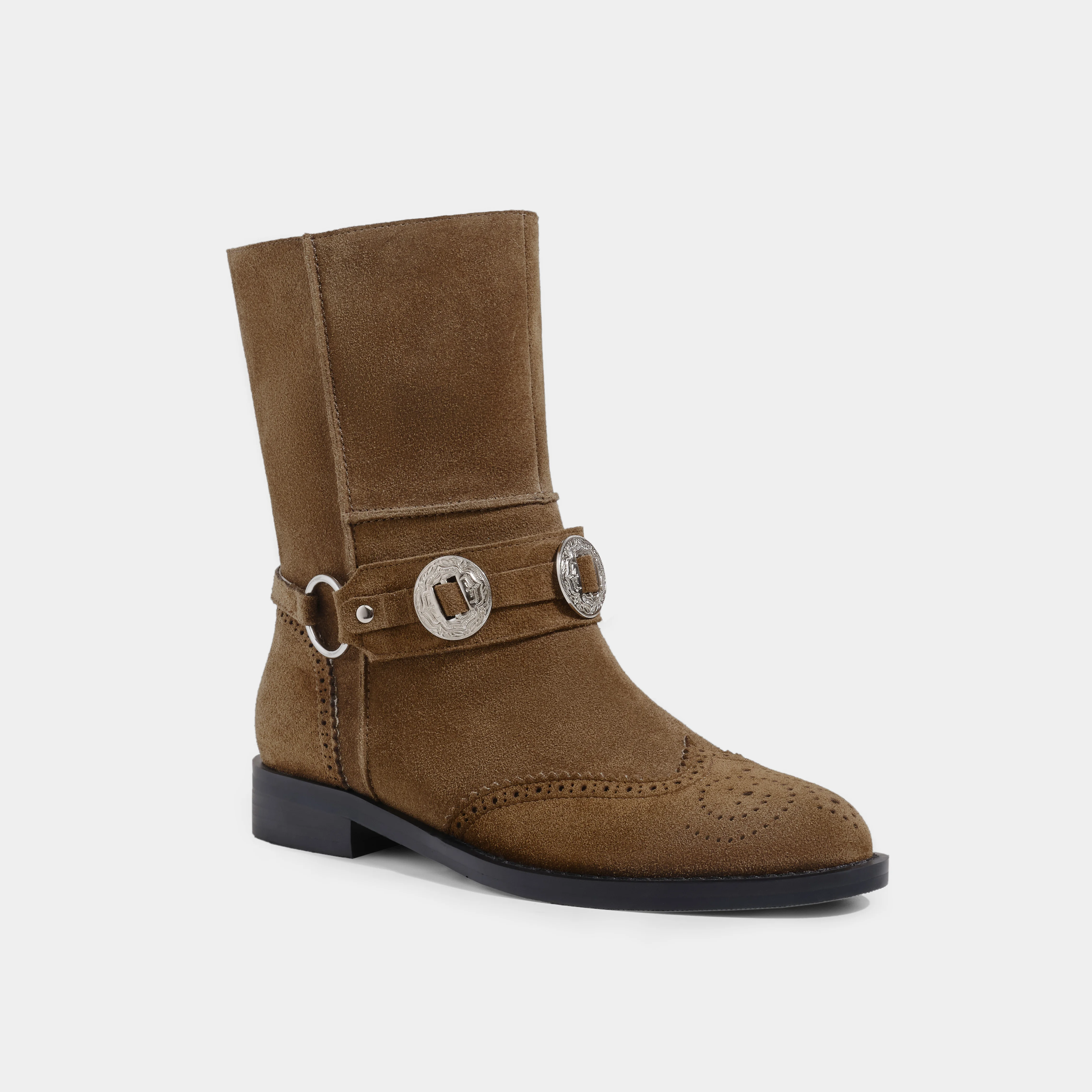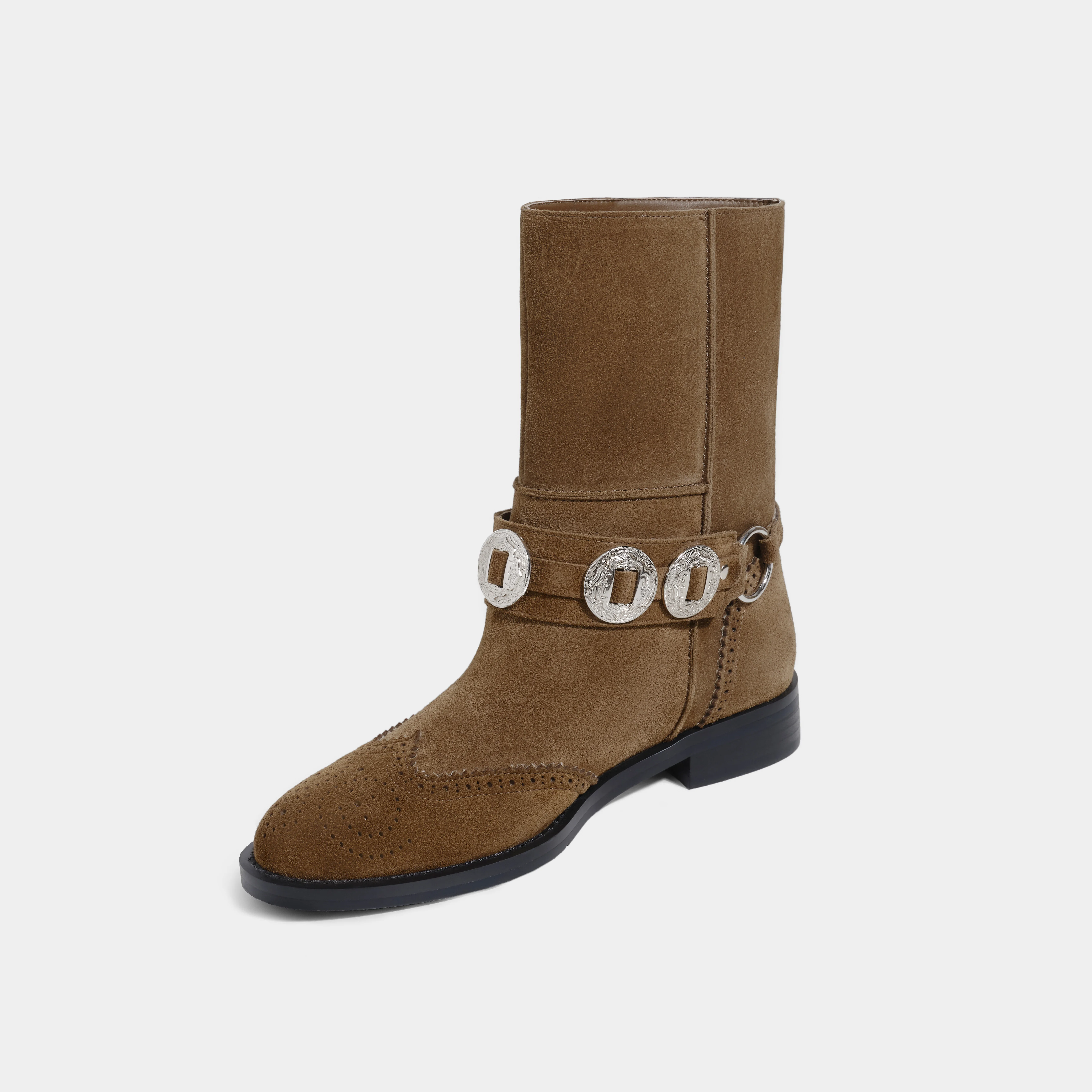 Vintage Preppy Romanesque Ankle Boots Stylish Faux Suede Flat Design Embossed Buckles Comfortable Autumn Fashion Western Bootie
