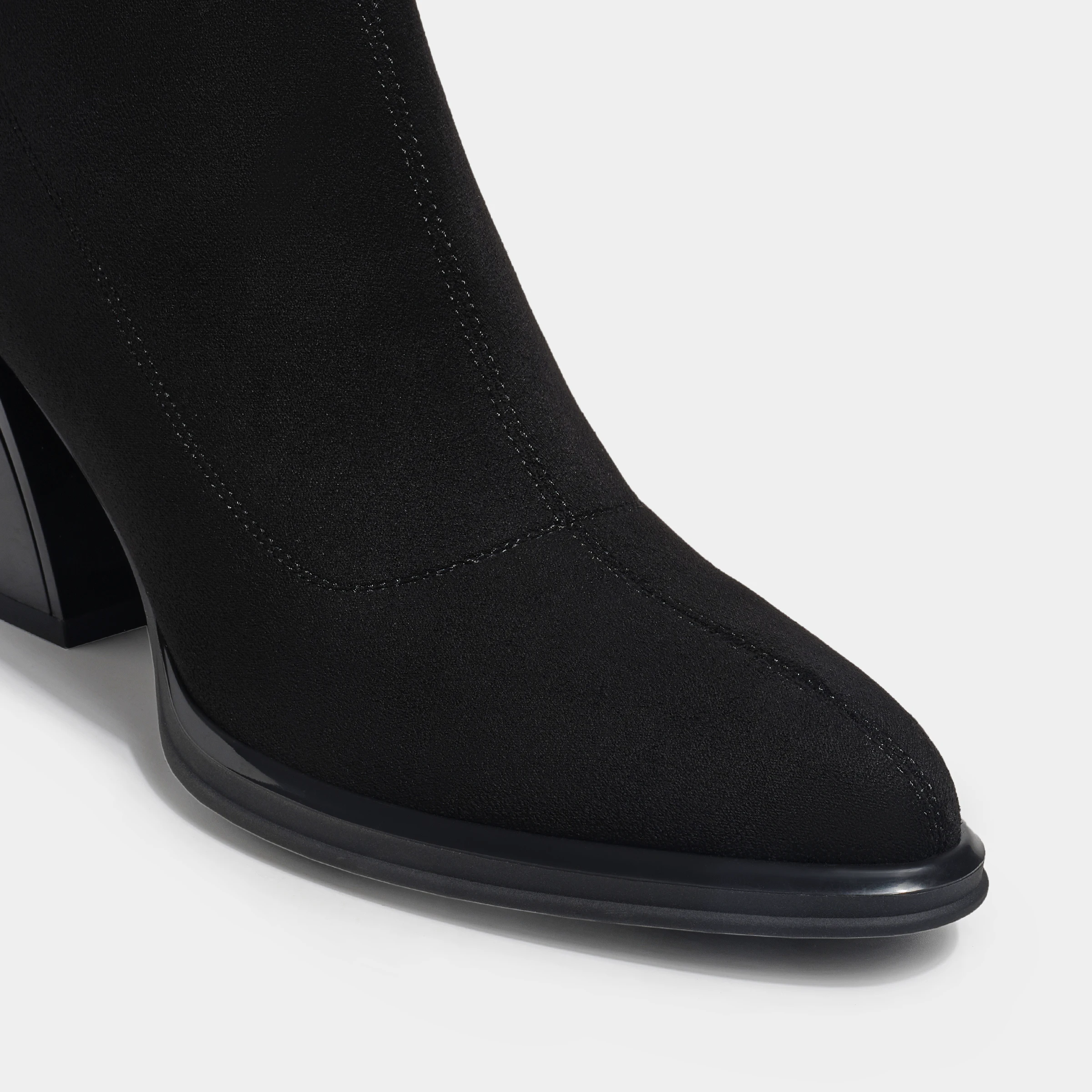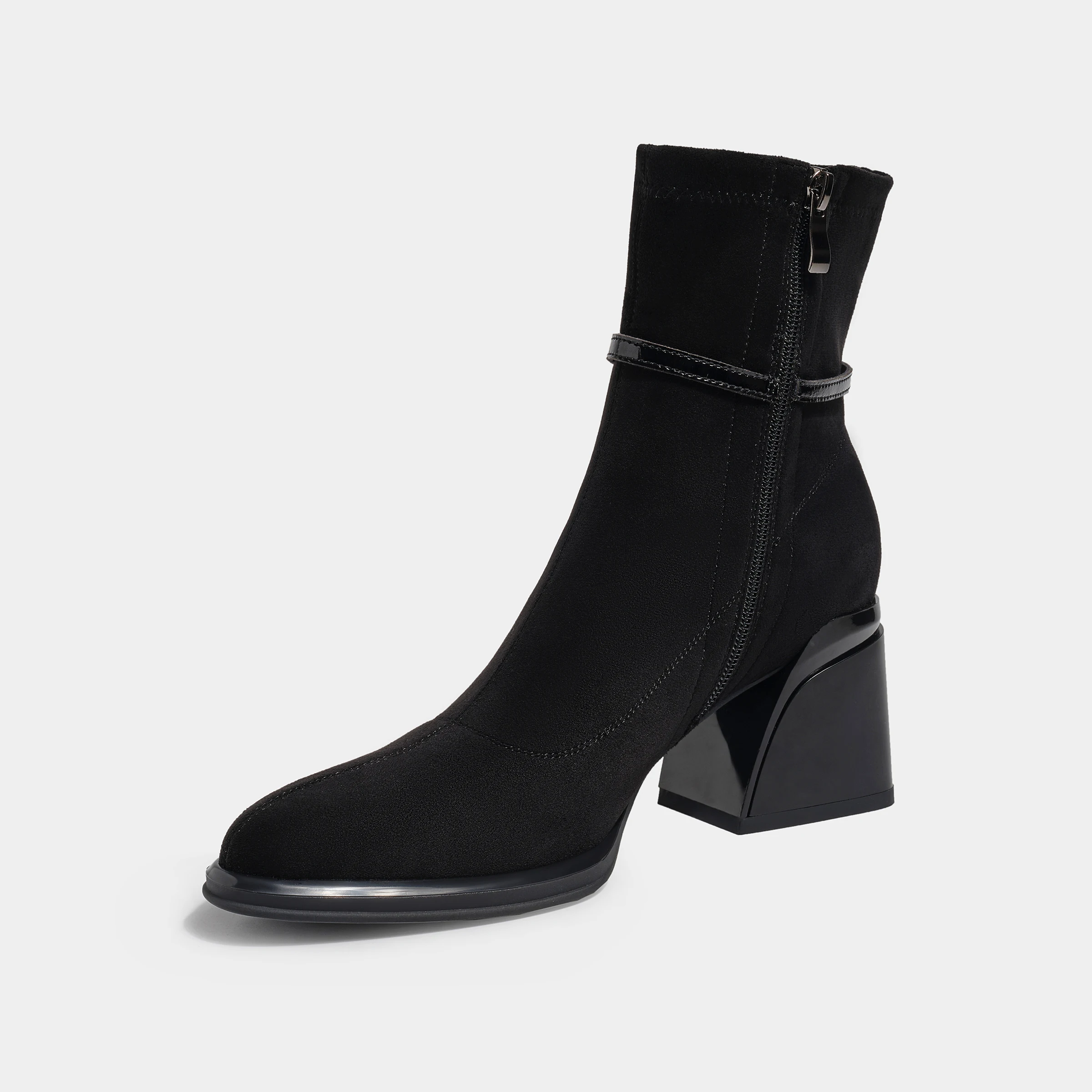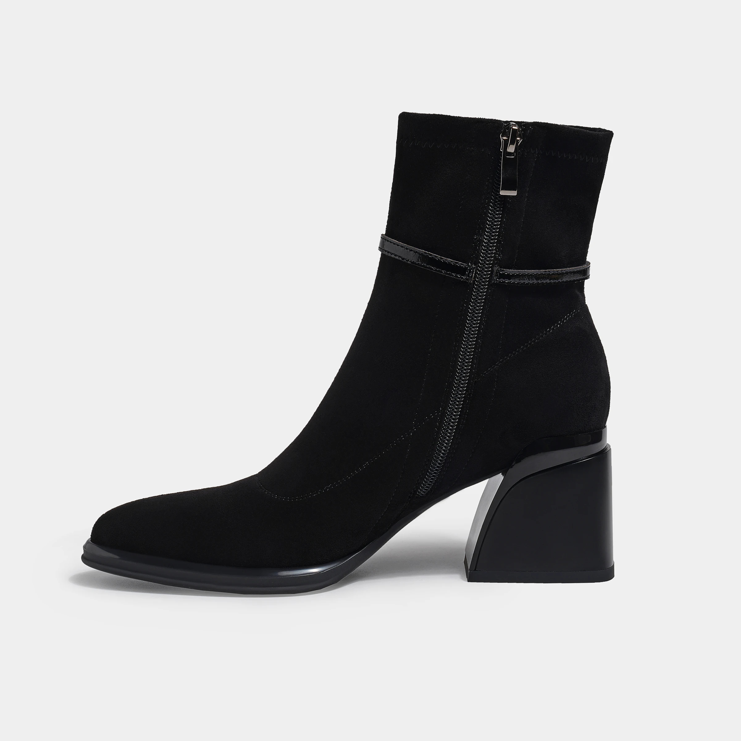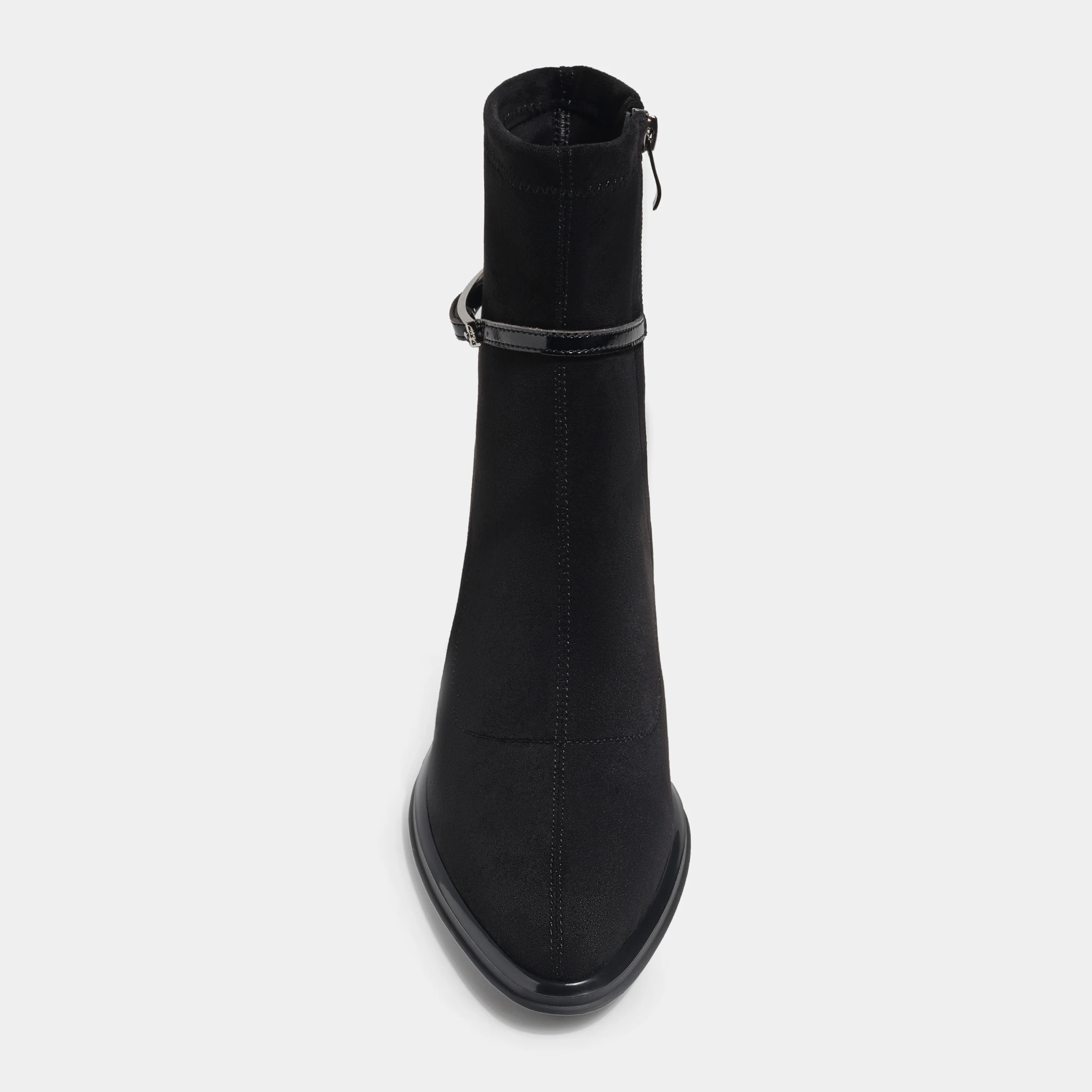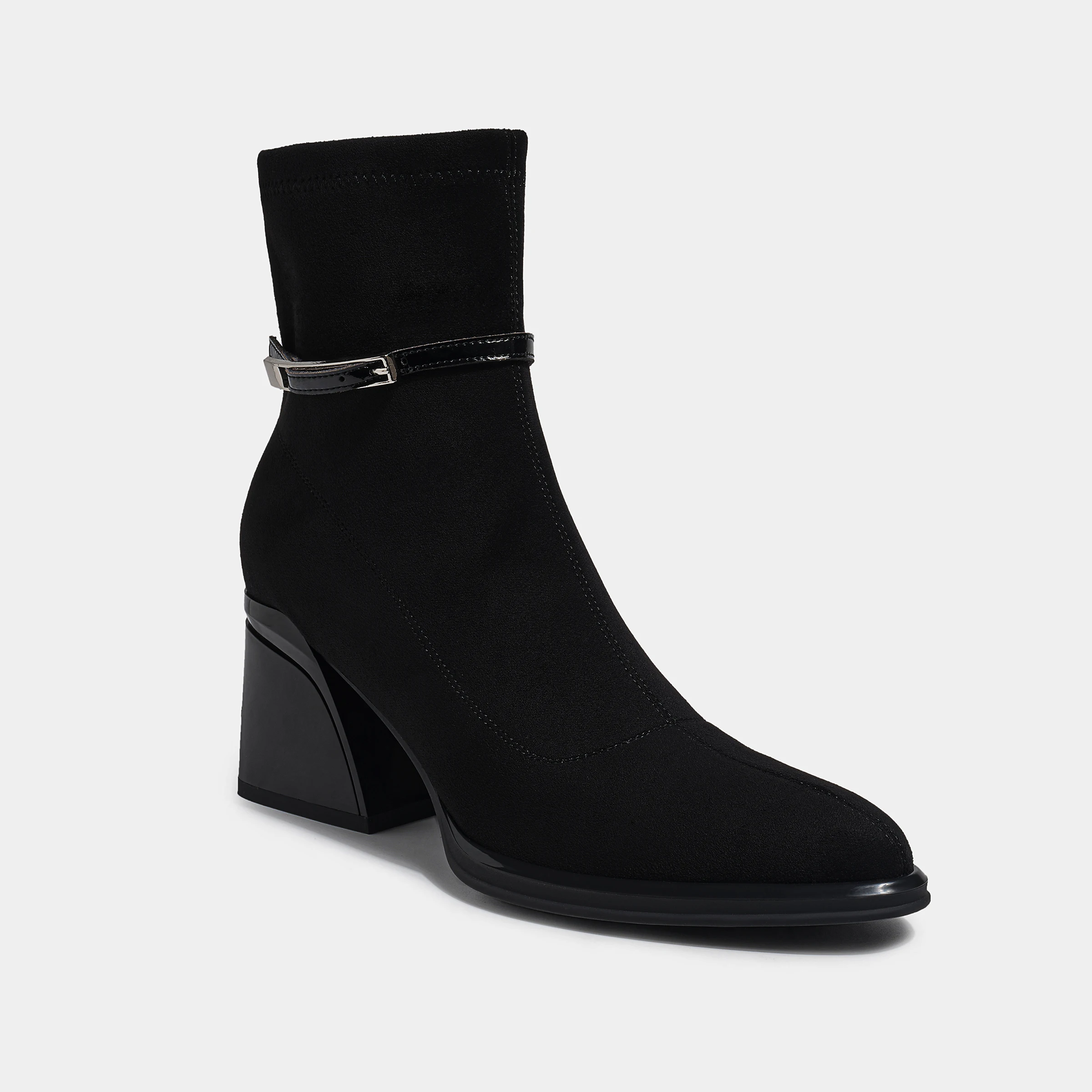 Chic Black Suede Block Heel Ankle Boots Korean Style Buckle Strap Pointed Toe Height Increasing