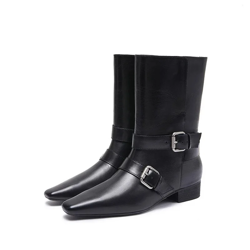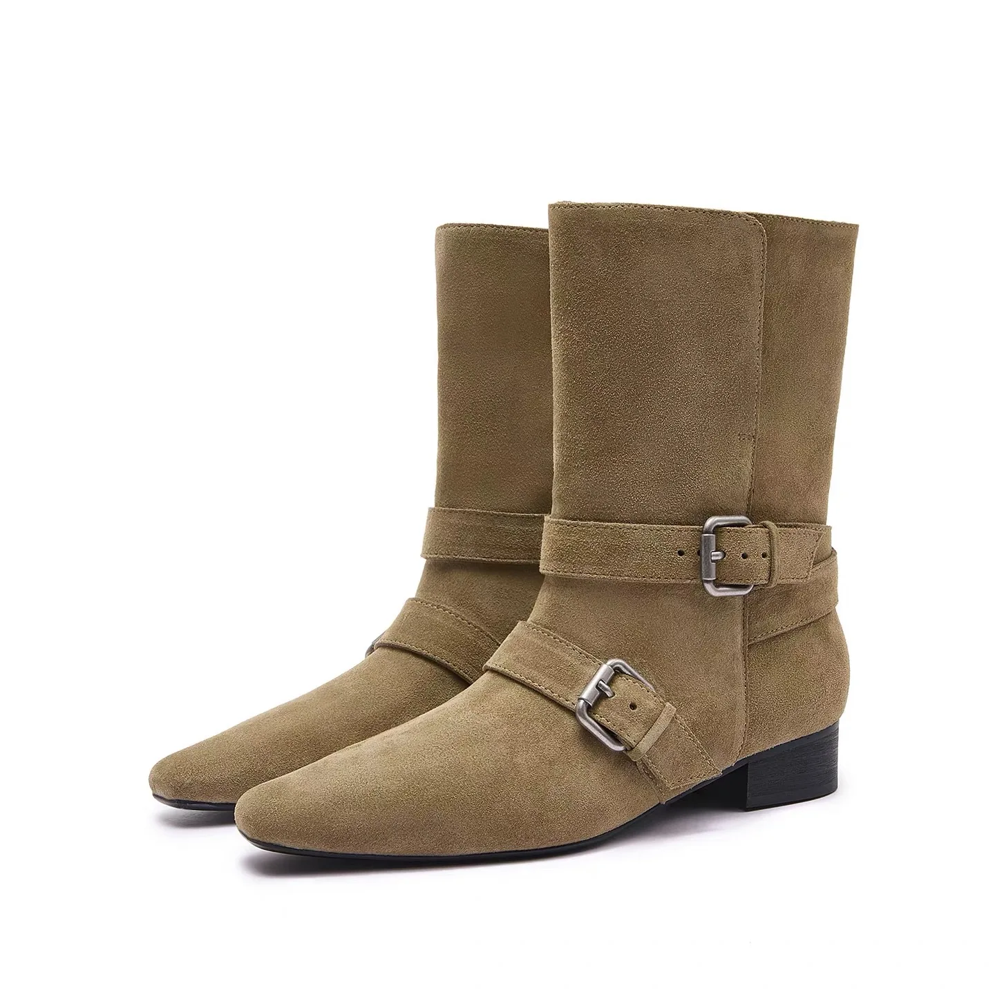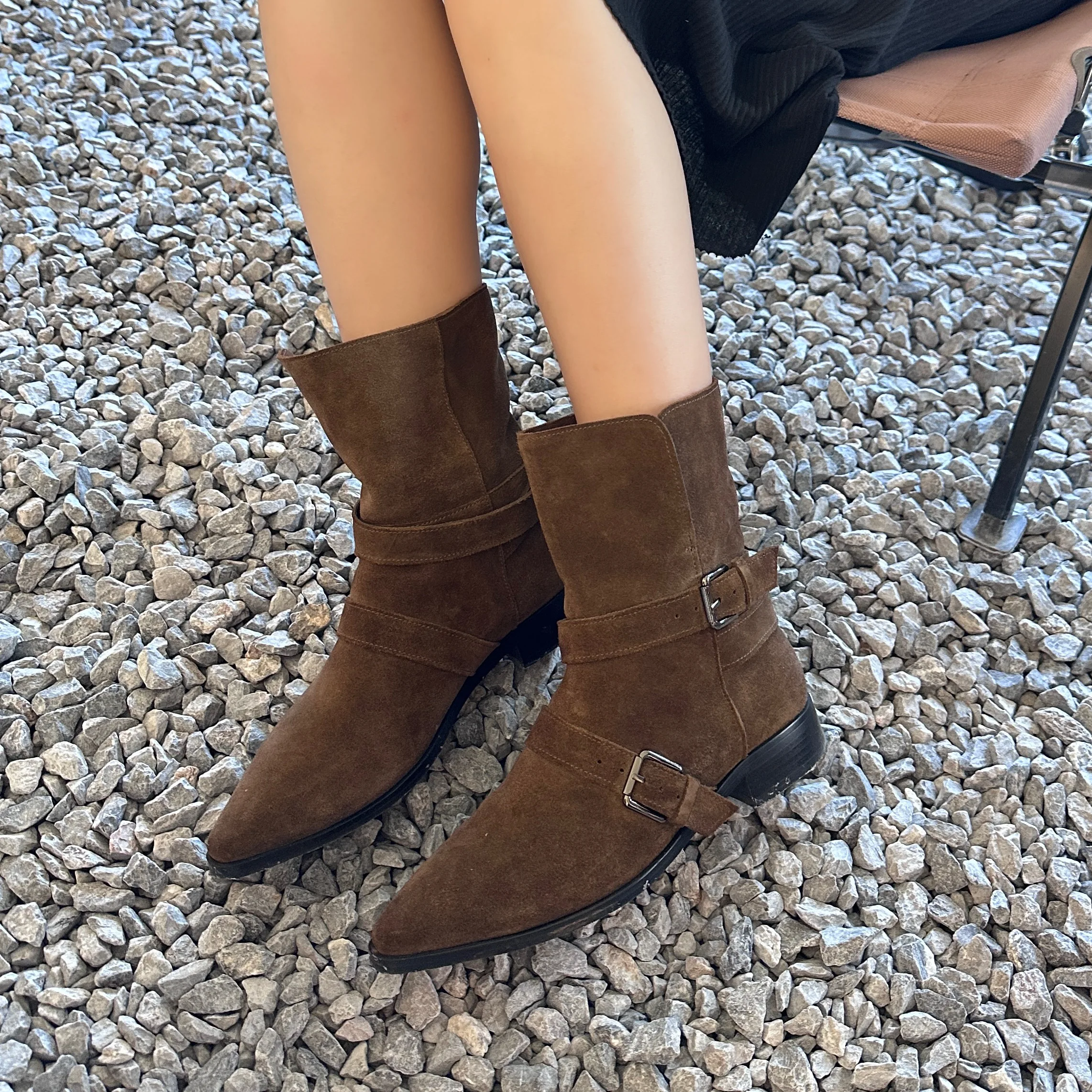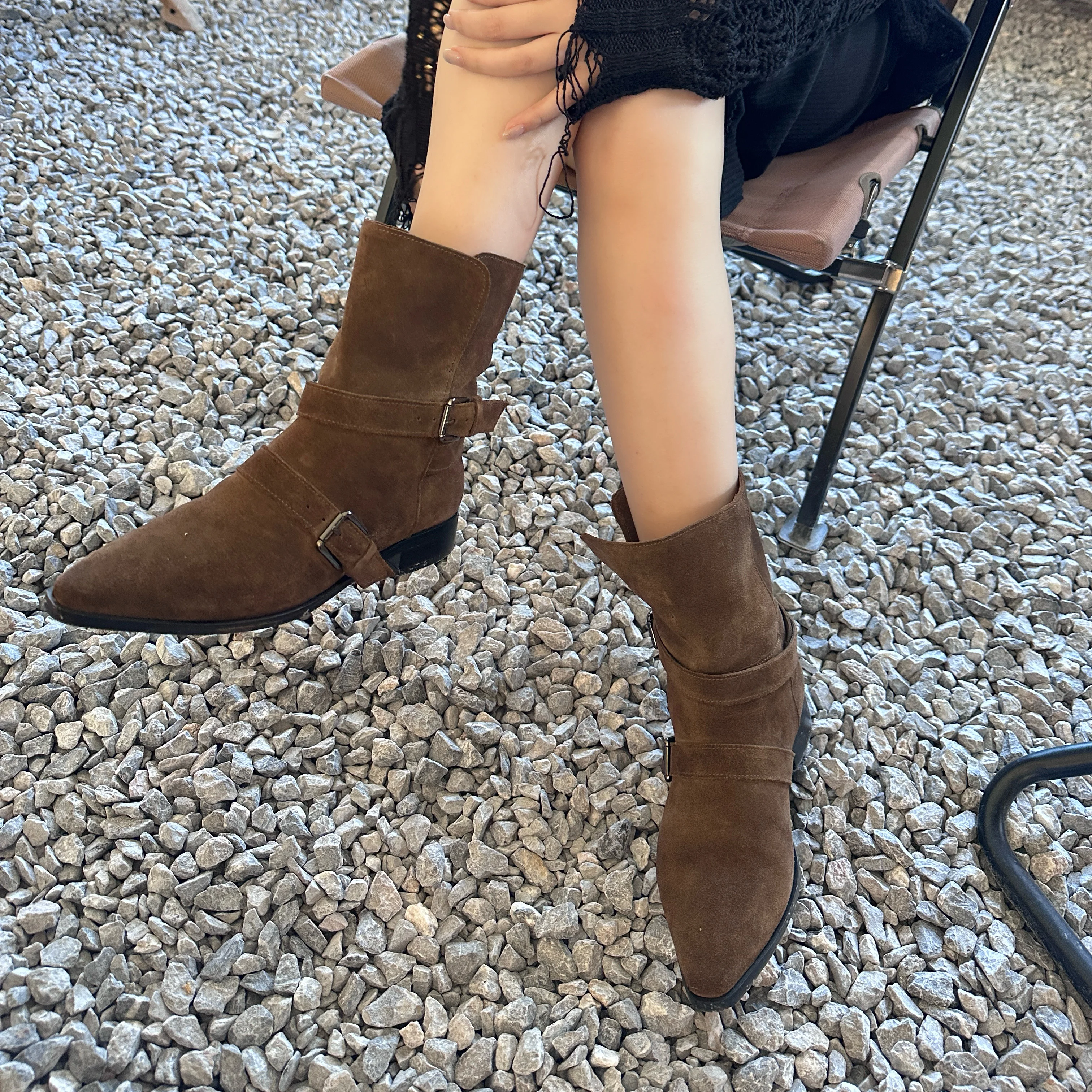 Autumn Winter Classic Work Comfort Retro Chunky Heel Ankle Boots Korean Fashion Pointed Toe Cow Suede Material Metal Buckles