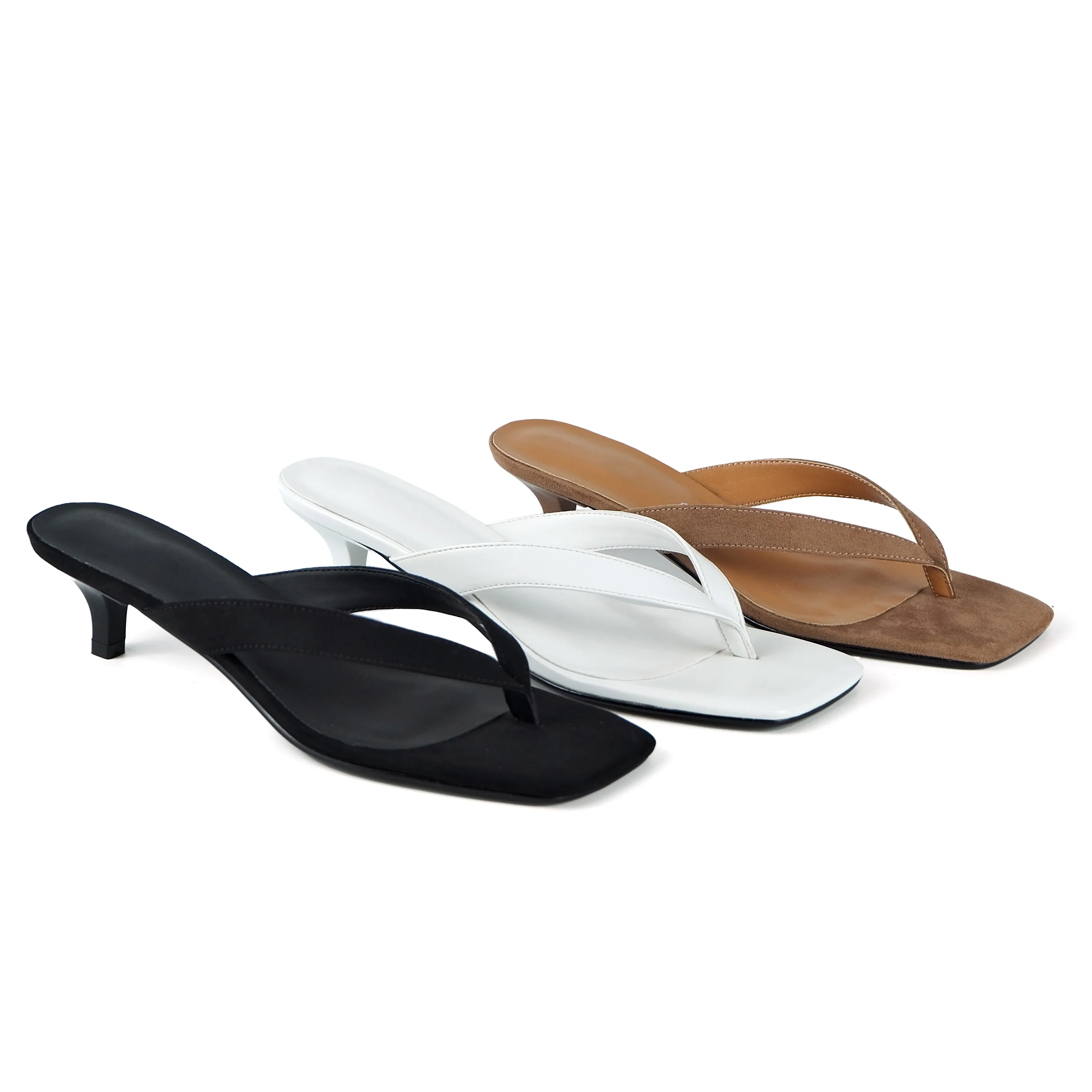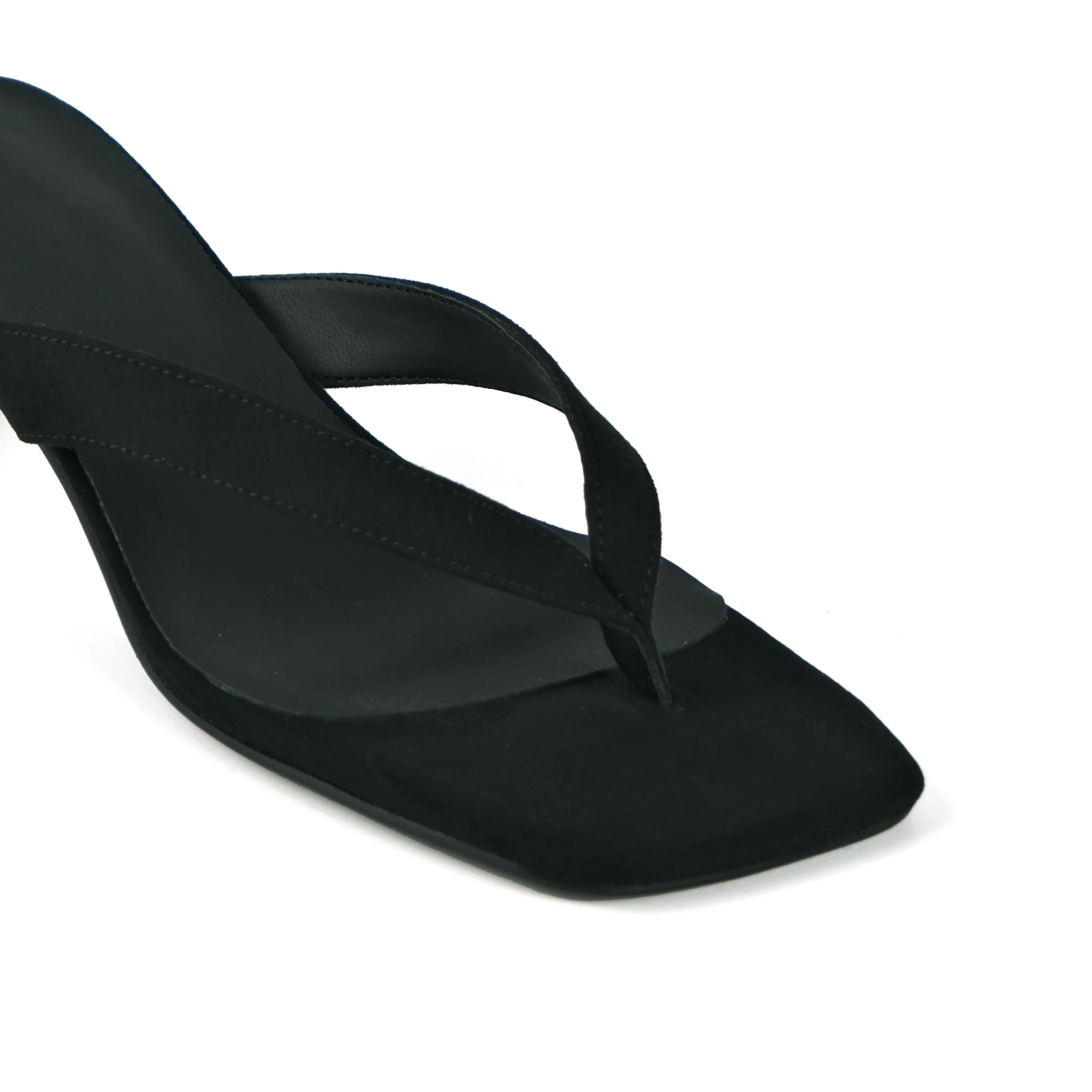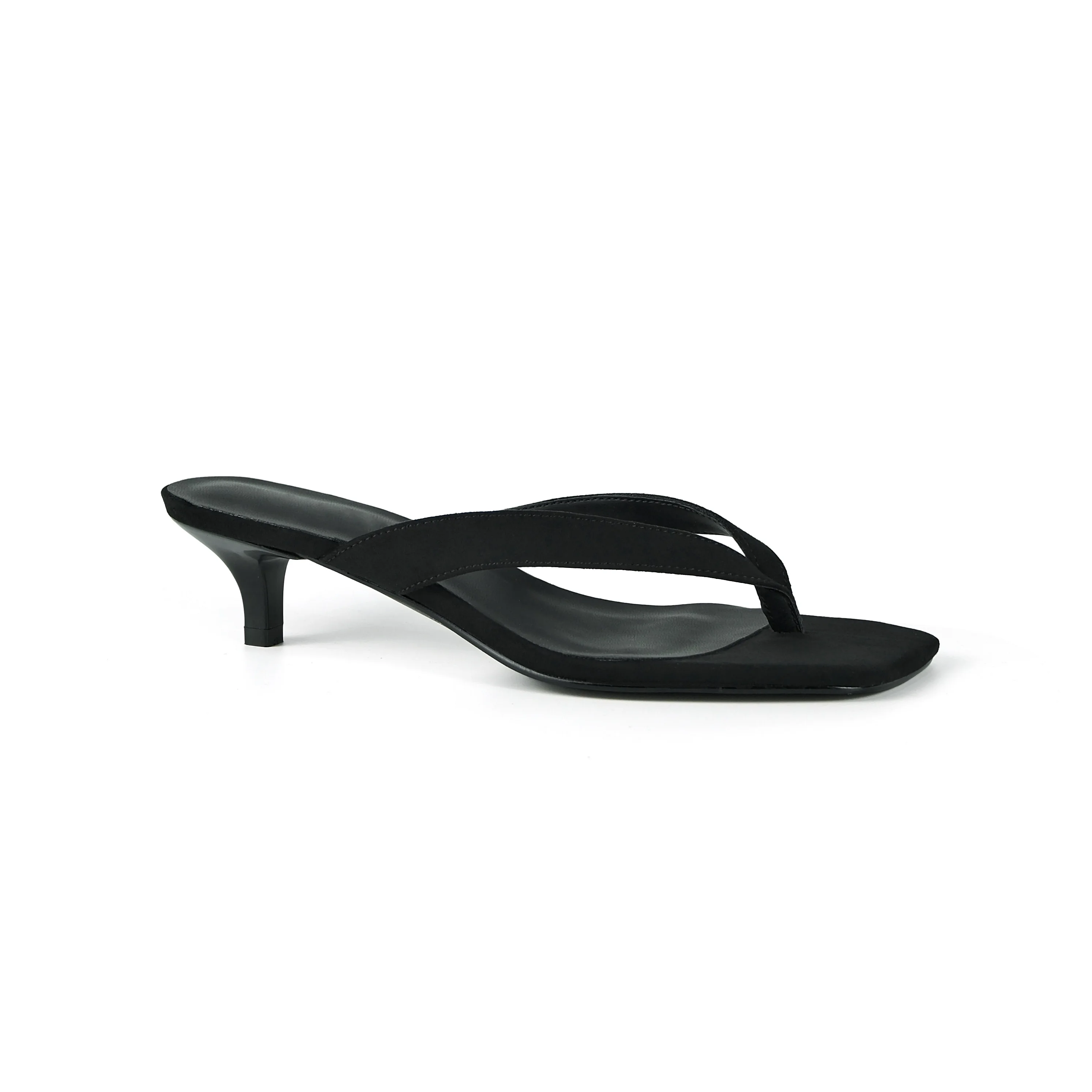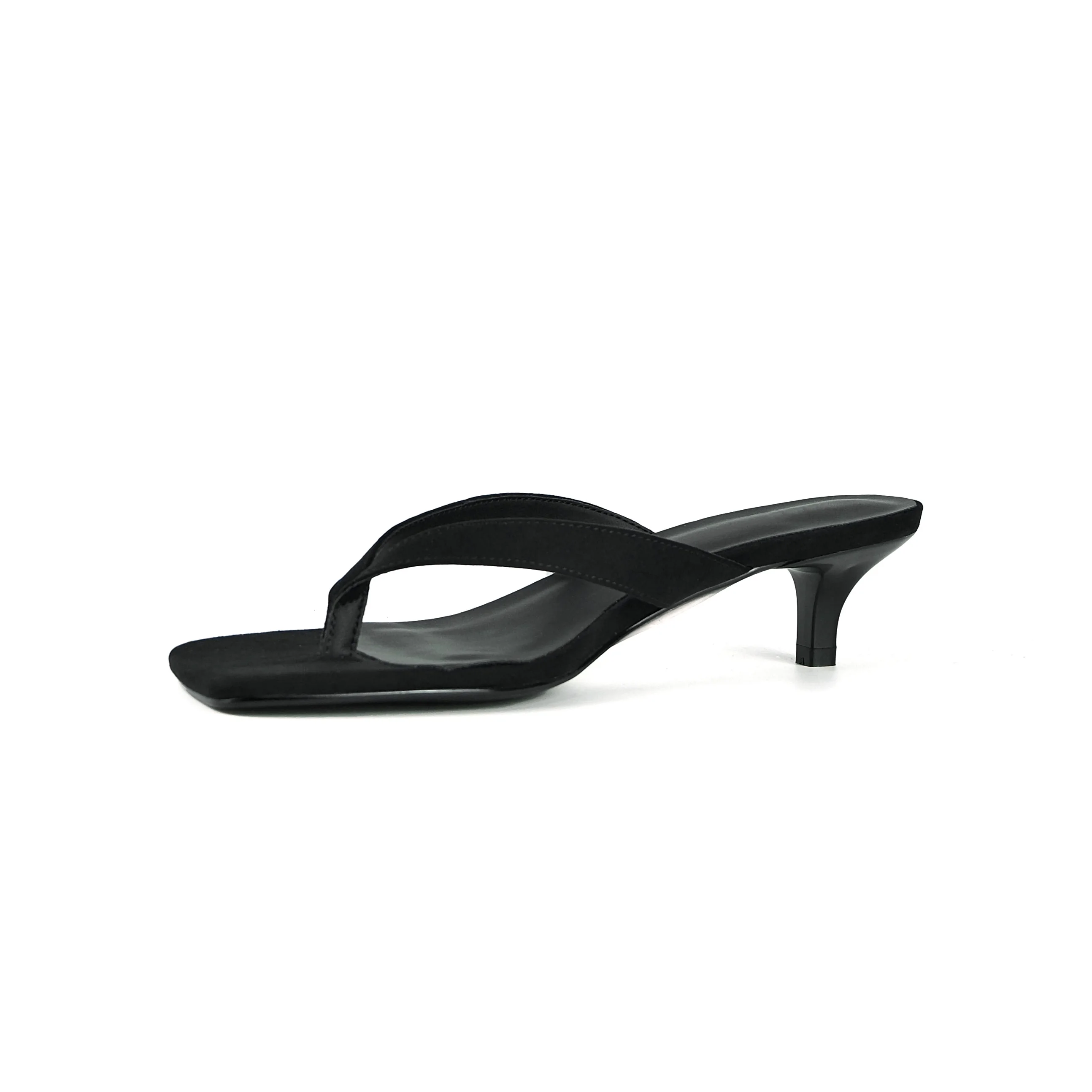 Women's Black Suede Thong Kitten Heel Mules-Square Toe Comfort Sandals 5cm for Office & Casual