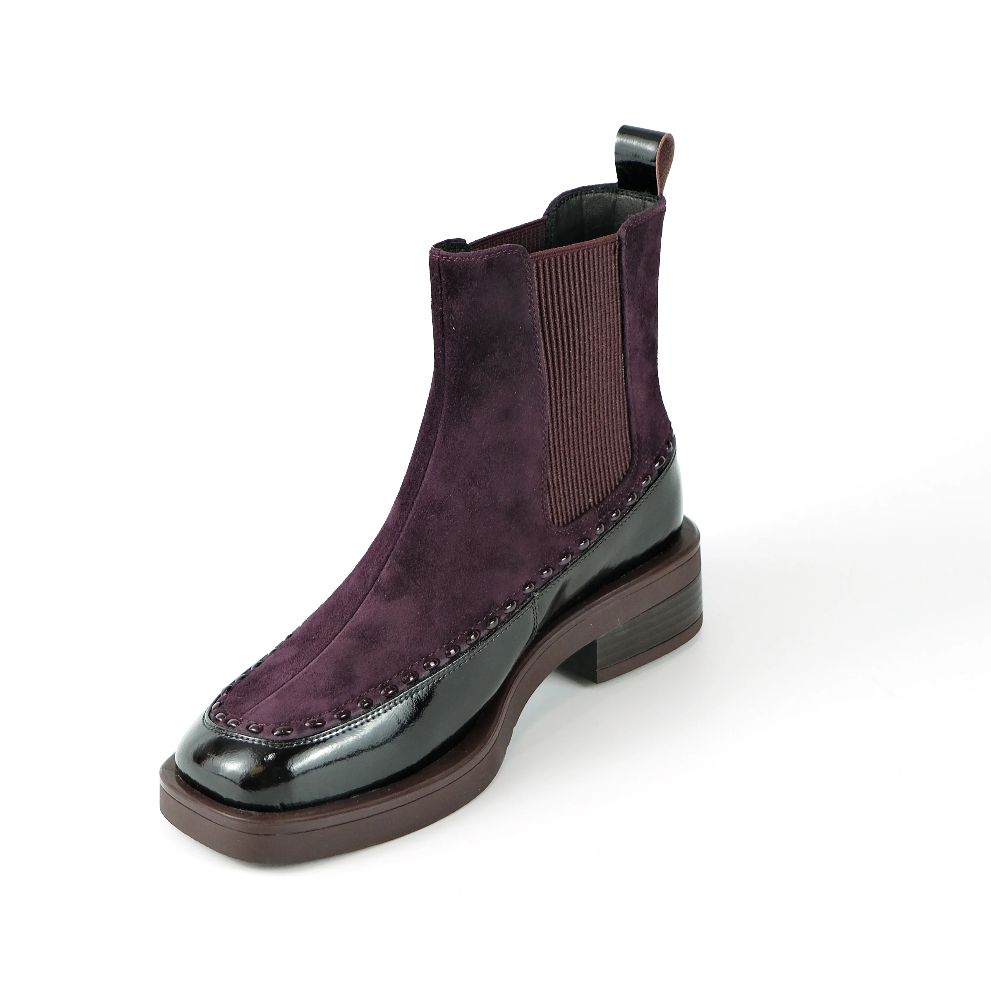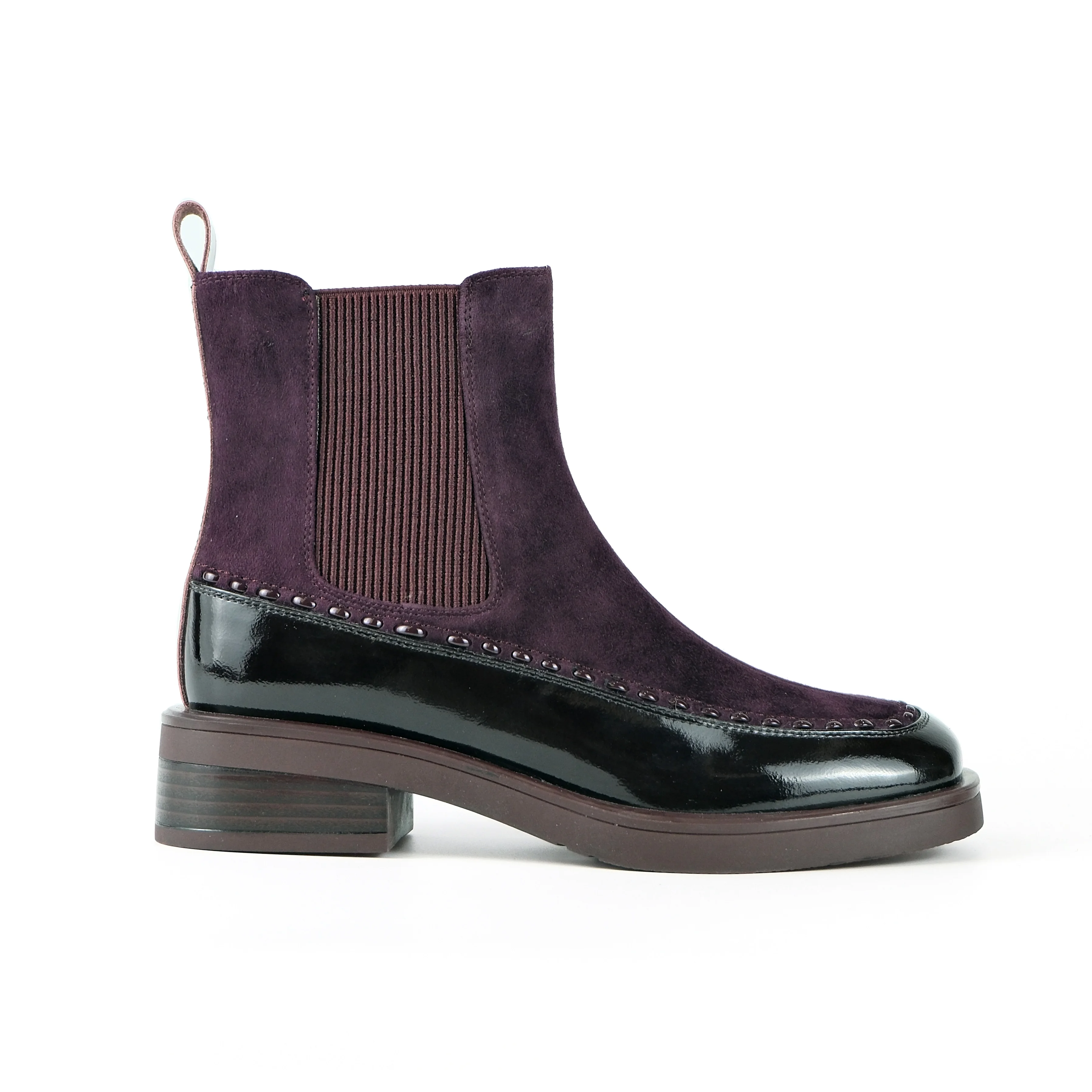 Women's Burgundy Suede Boots - Action Leather Trim Studded Low Block Heel Casual Dress Footwear 2026 Autumn