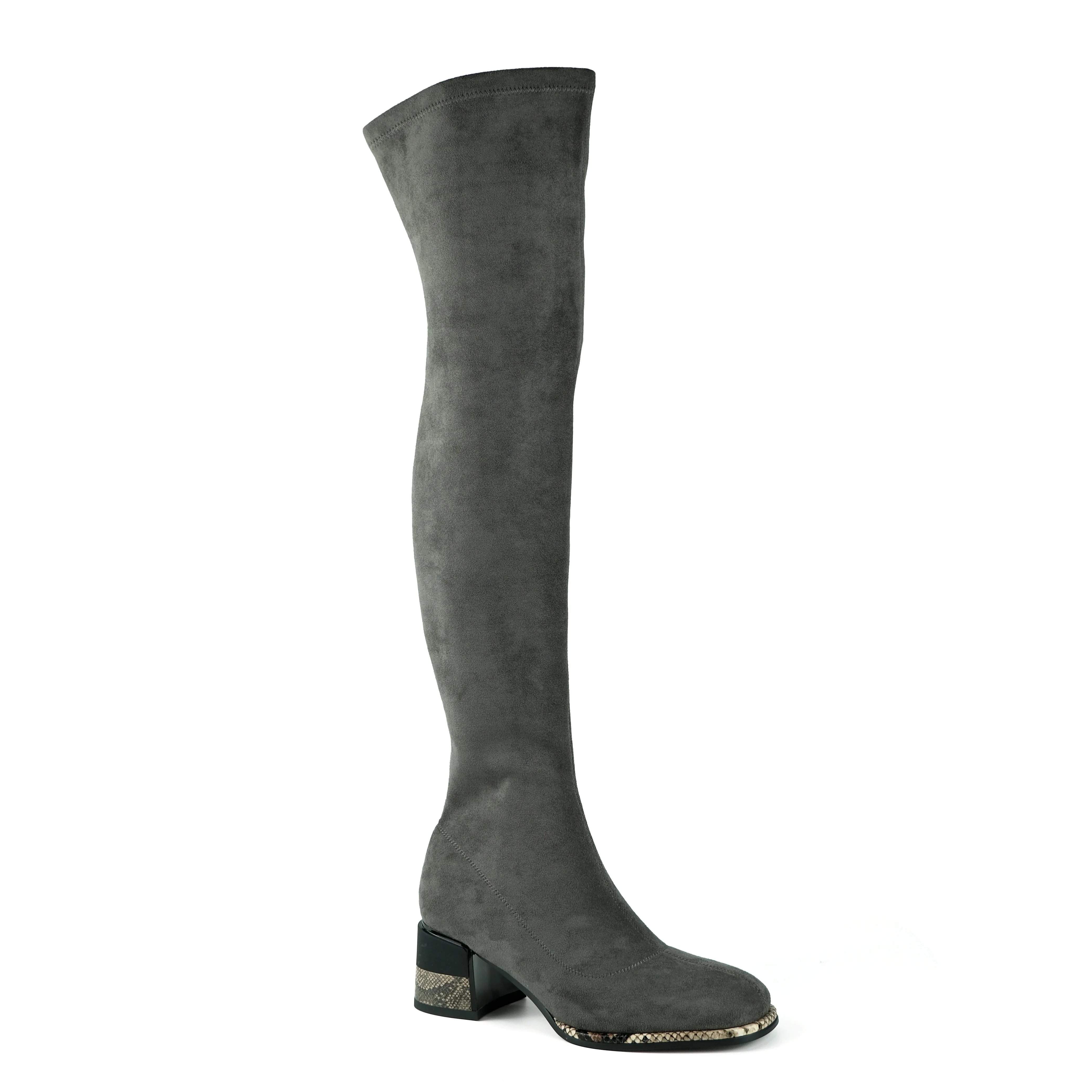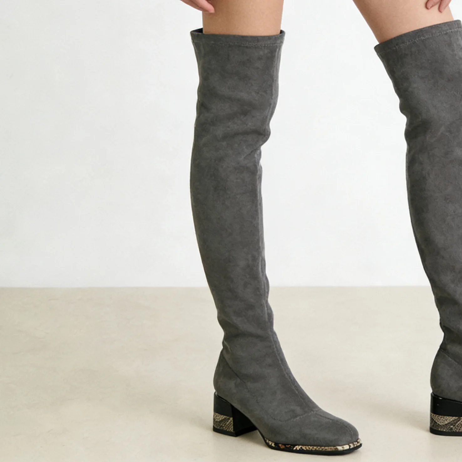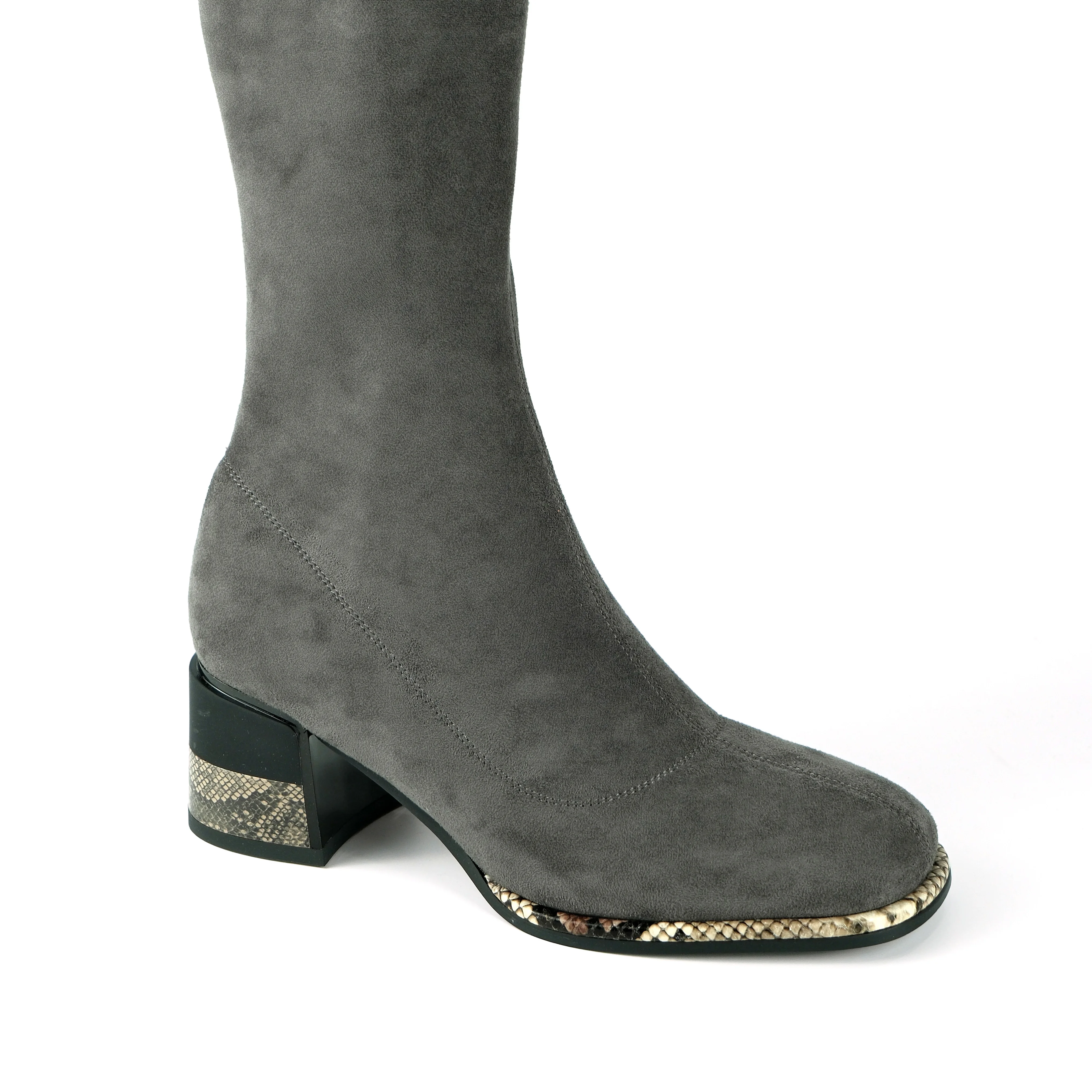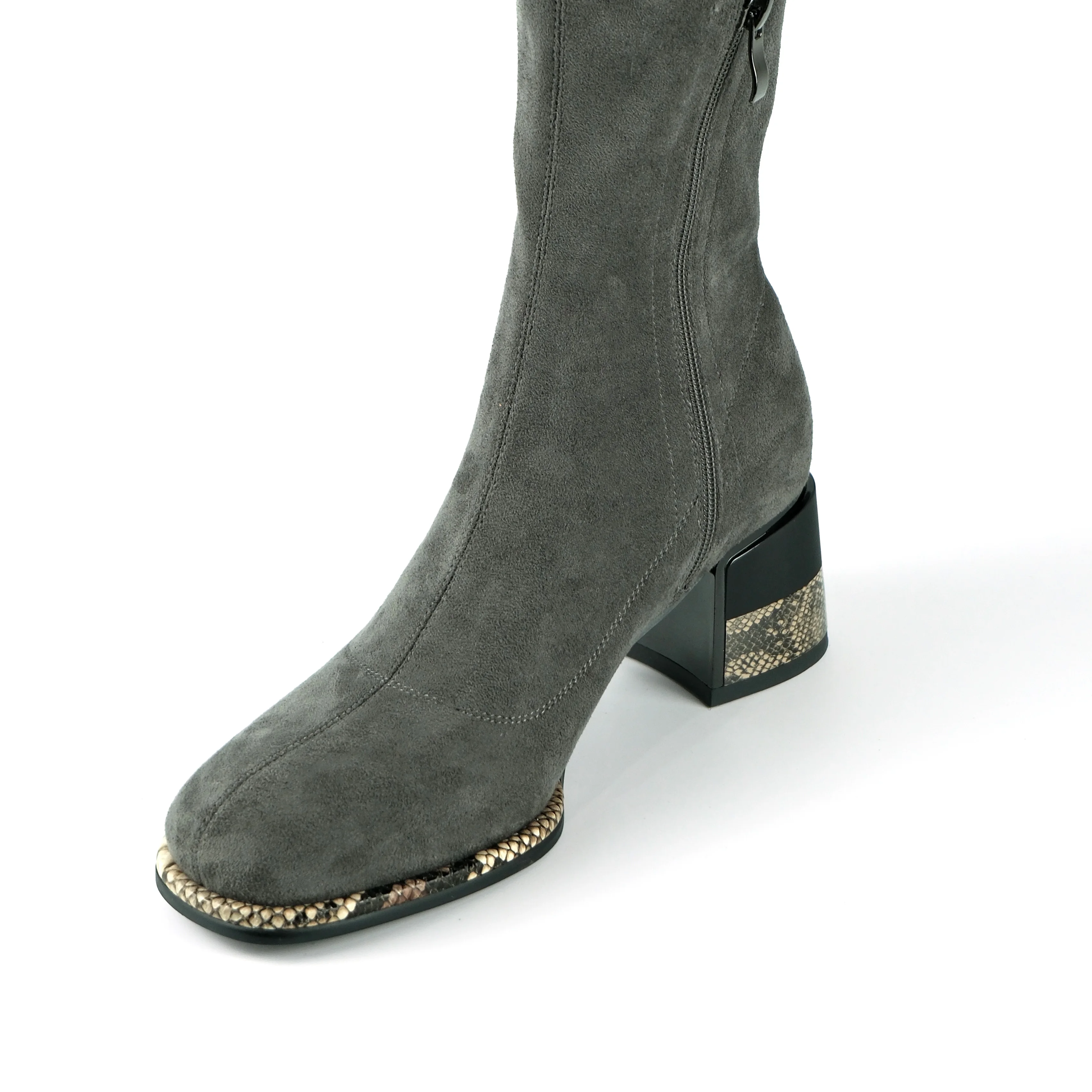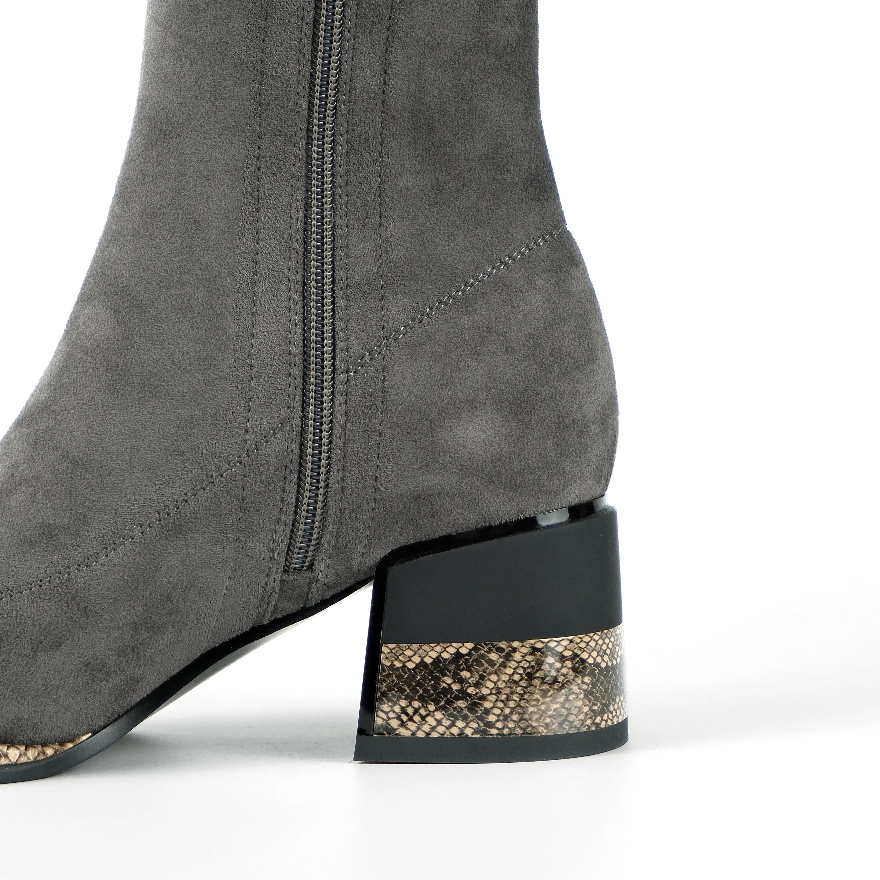 Women's Gray Faux Suede Over-the-knee Boots - Snake-Print Trim Block Heel Zipper Casual Dress Footwear 2026 Autumn