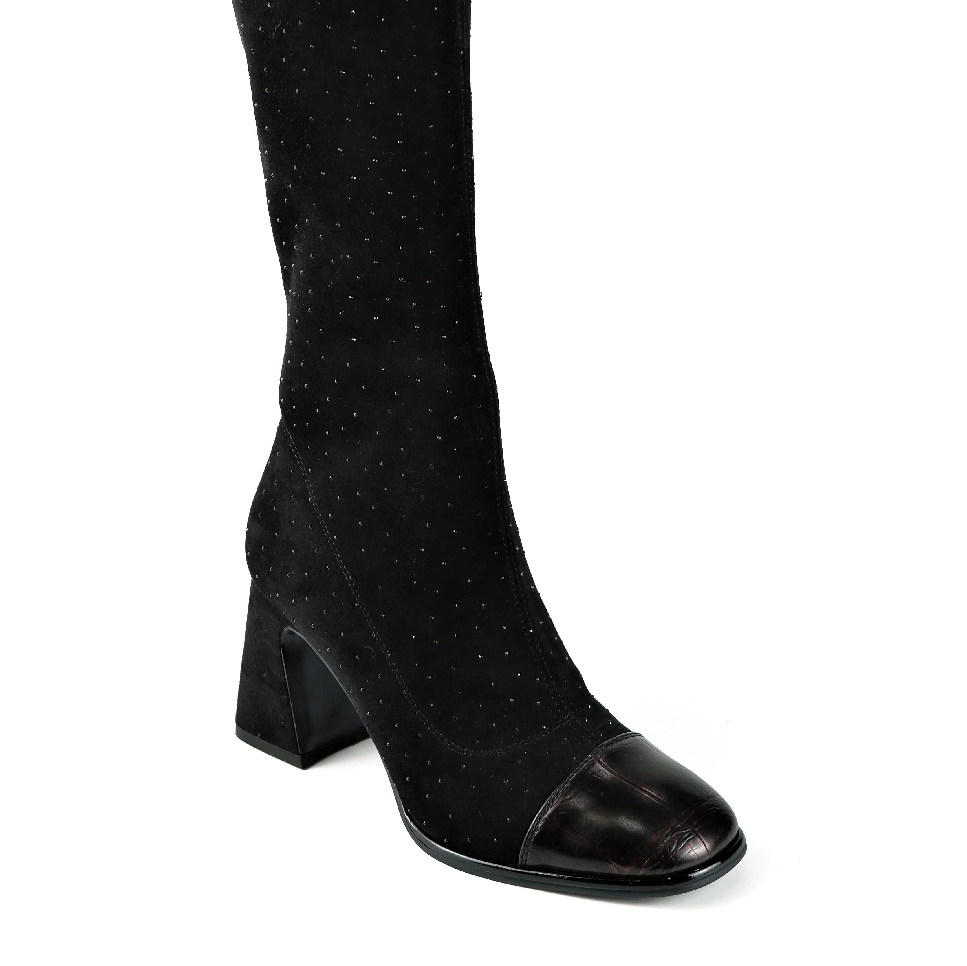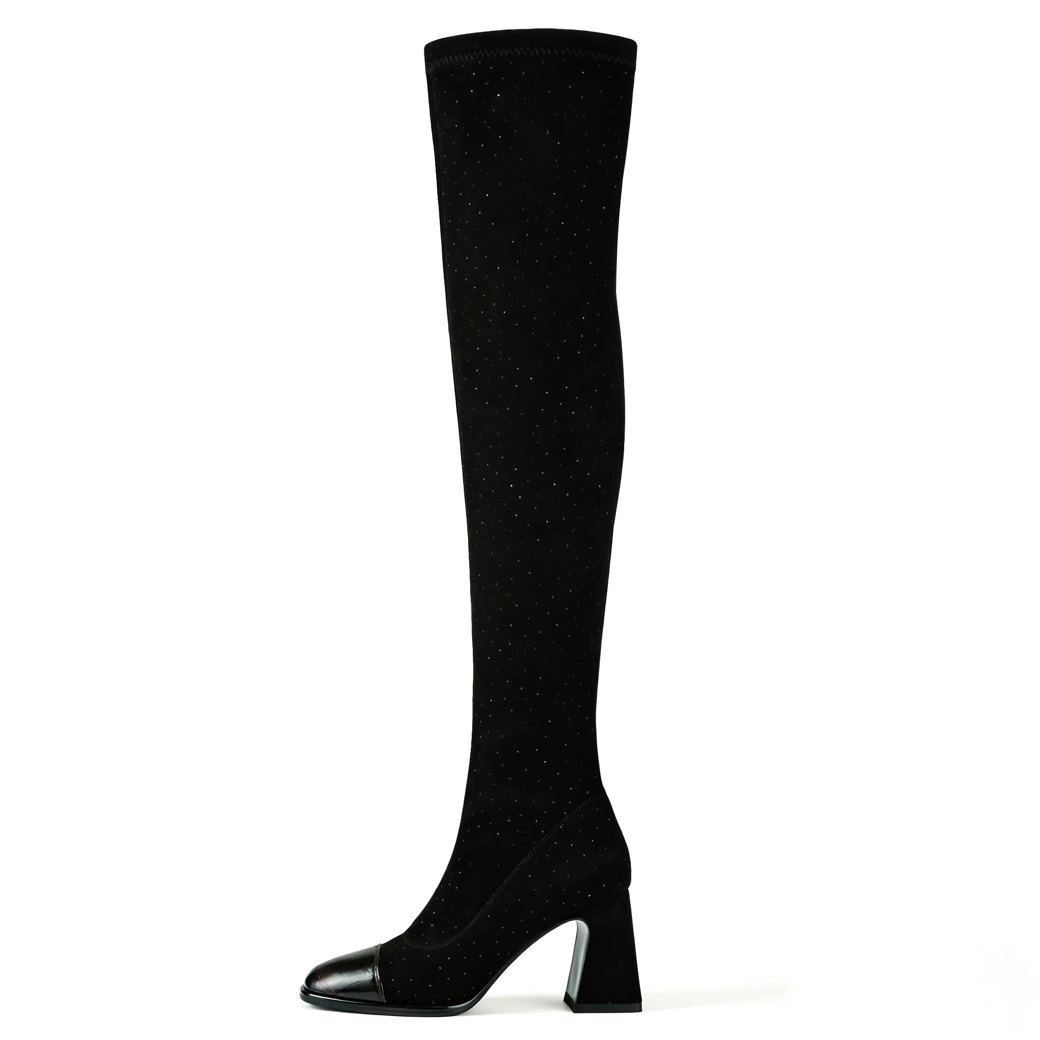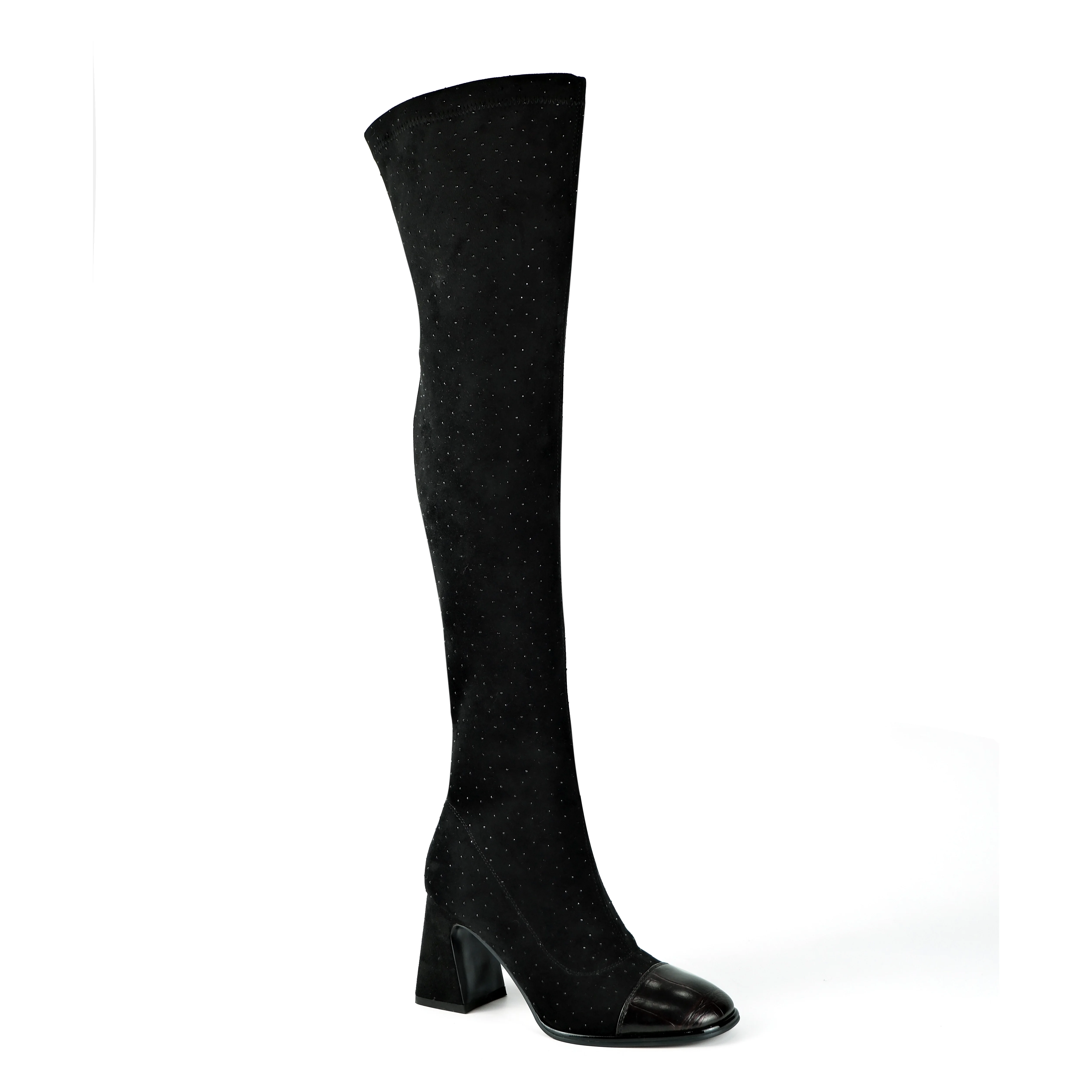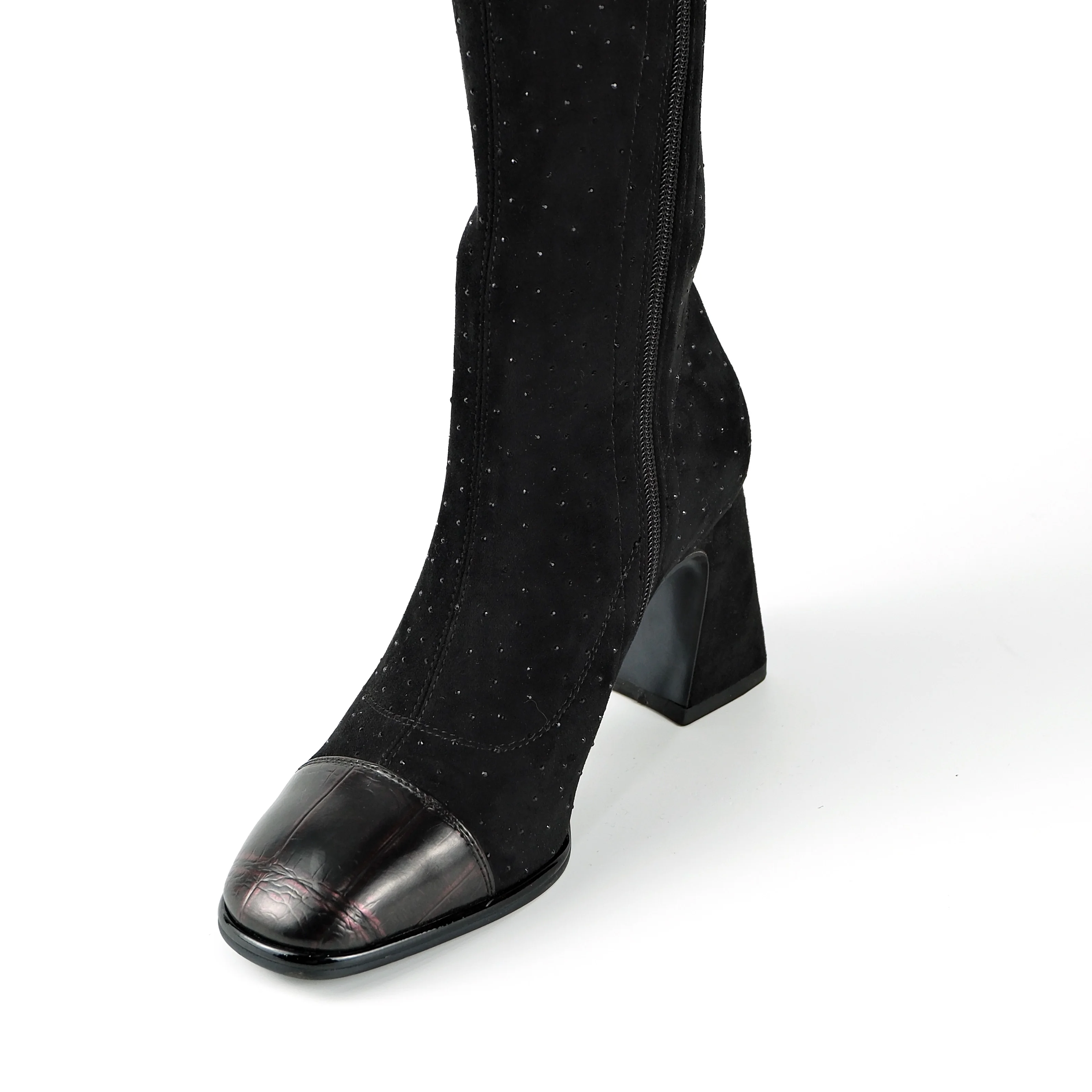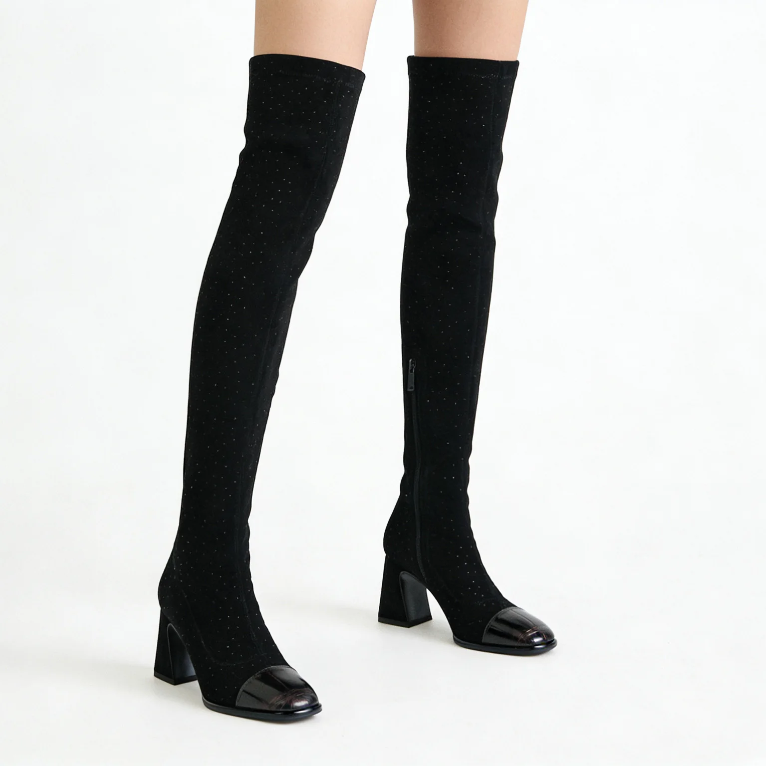 Women's Black Faux Suede Over-the-Knee Boots - Patent Toe Trim Block Heel Dress Footwear 2026 Autumn