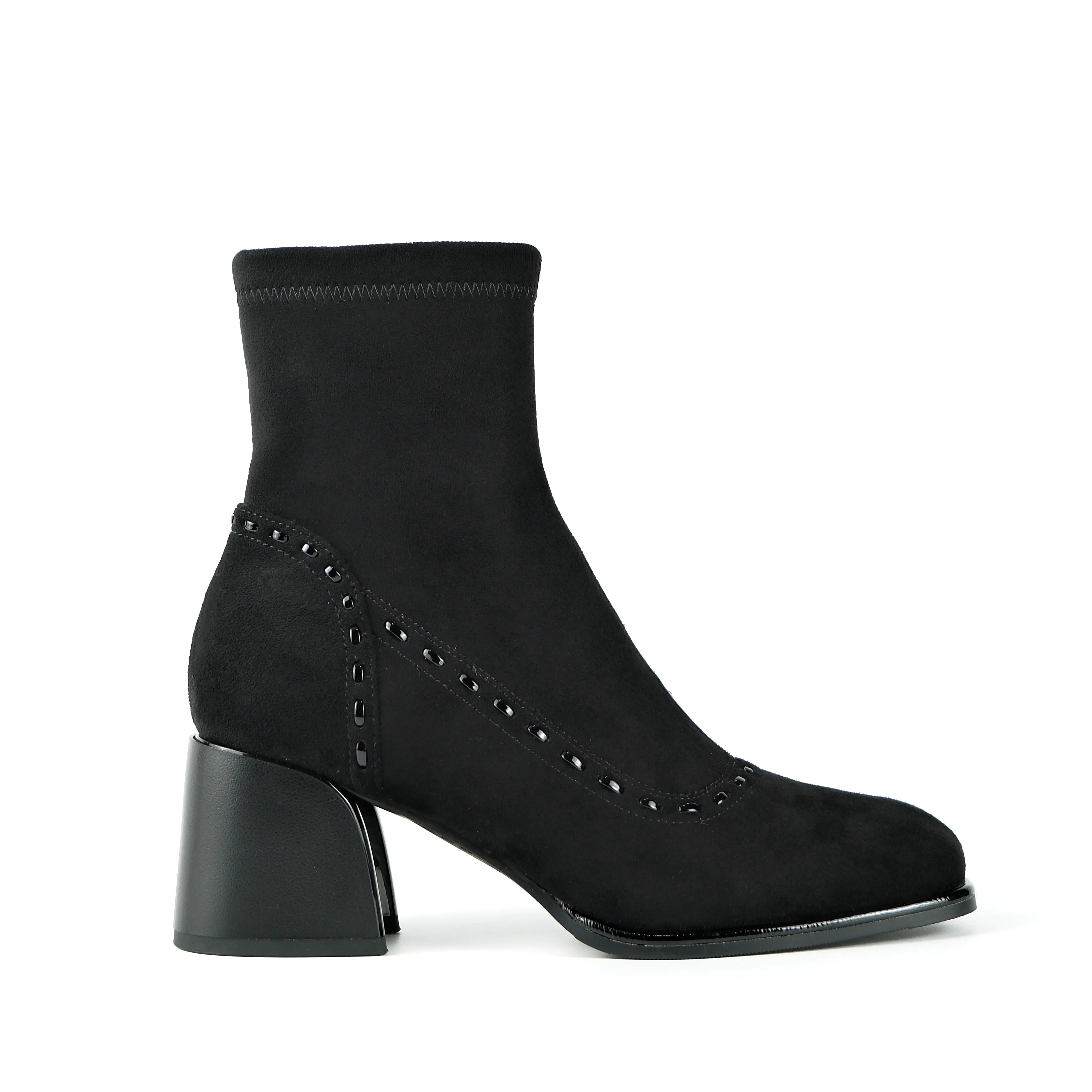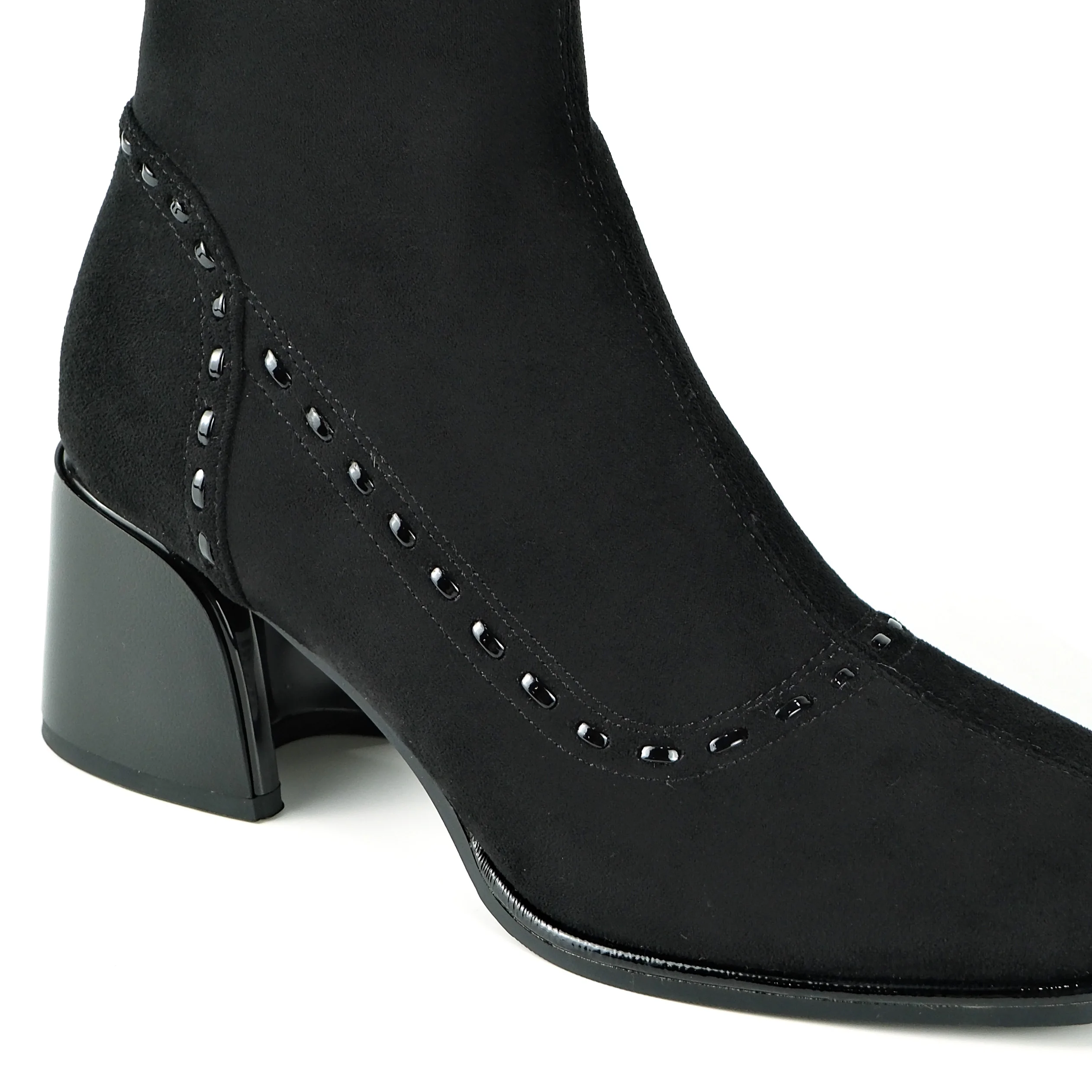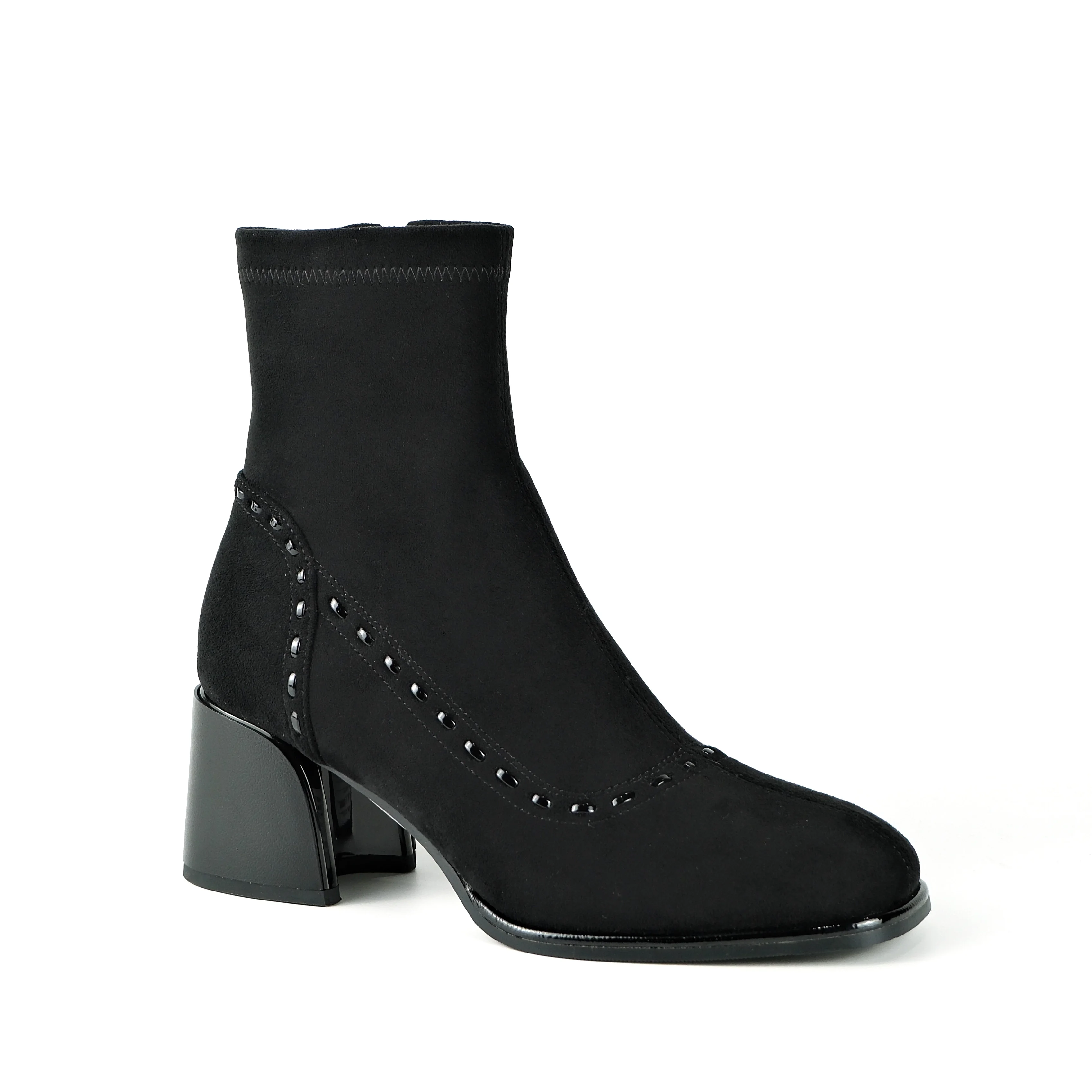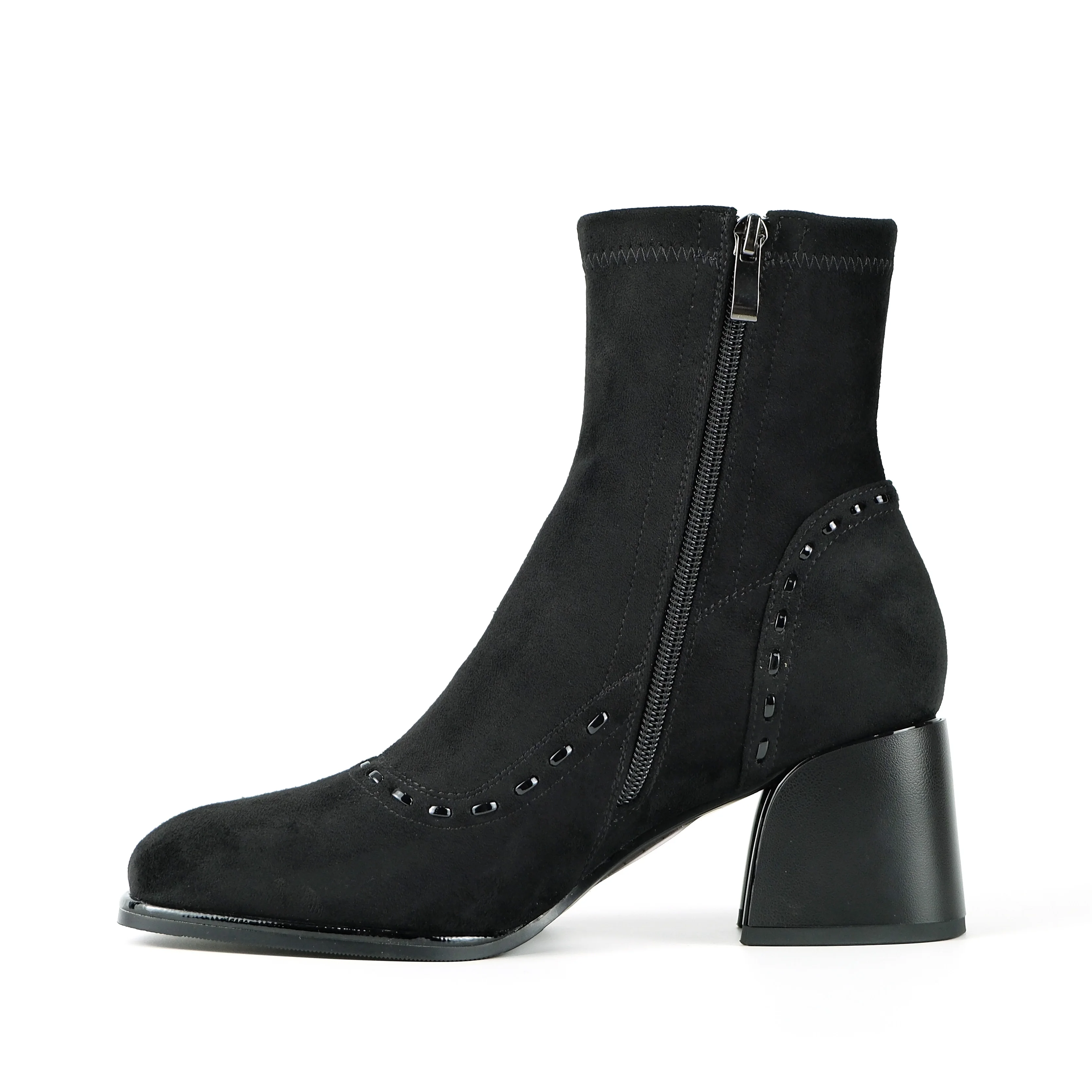 Women's Black Cow Suede Ankle Boots - Stud Detail Block Heel Zipper Slim-Fit Footwear 2026 Autumn