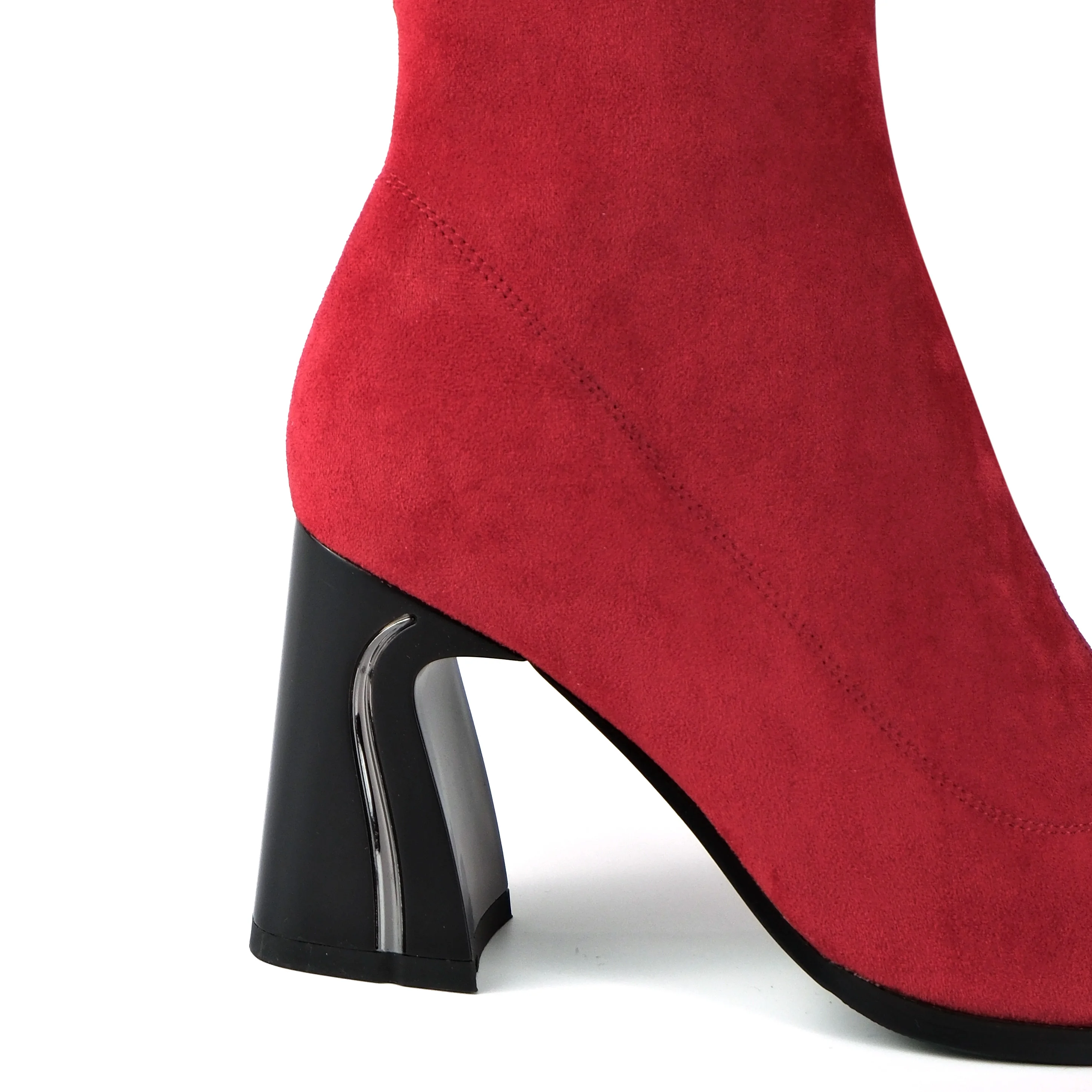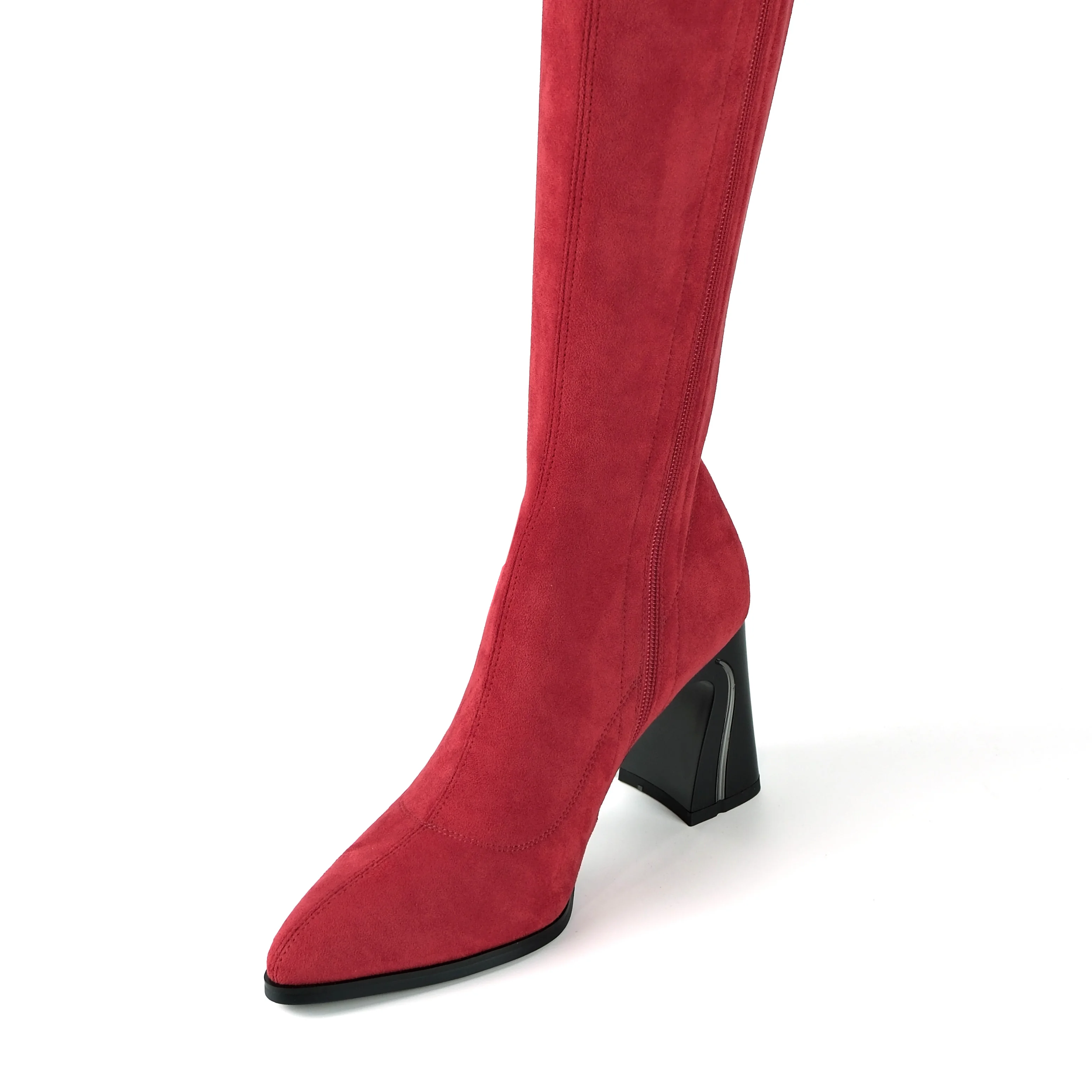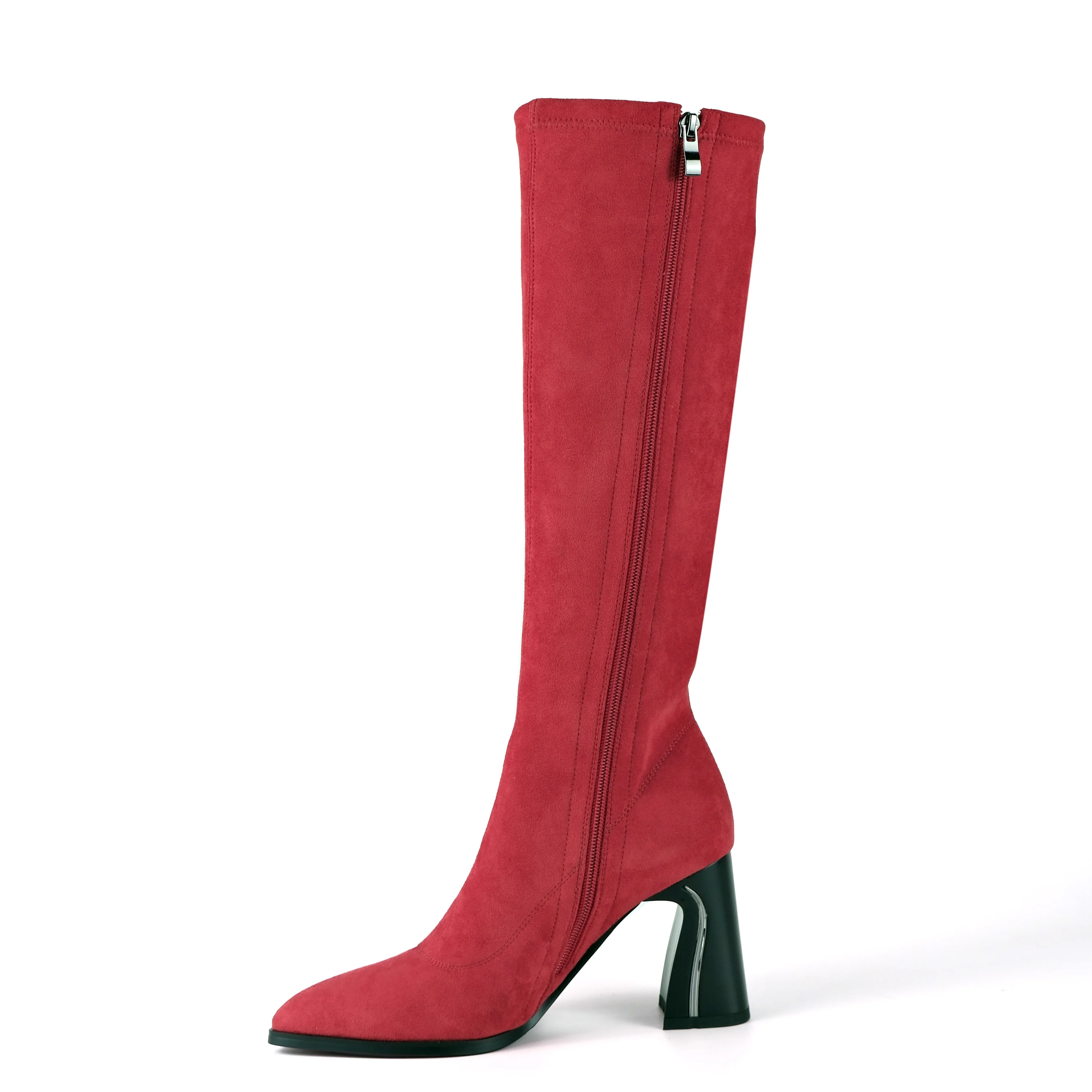 Women's Red Faux Suede Pointed Toe Knee-High Boots-Zipper Detail Block Heel Slim-Fit 2026 Autumn Winter Spring