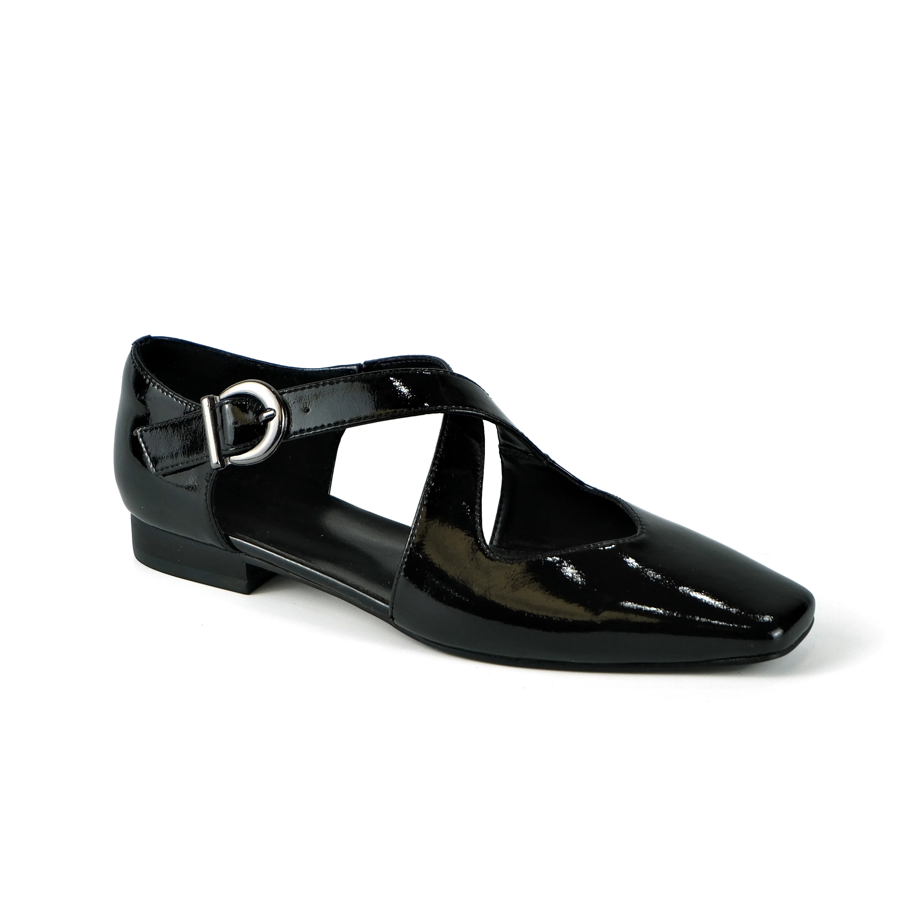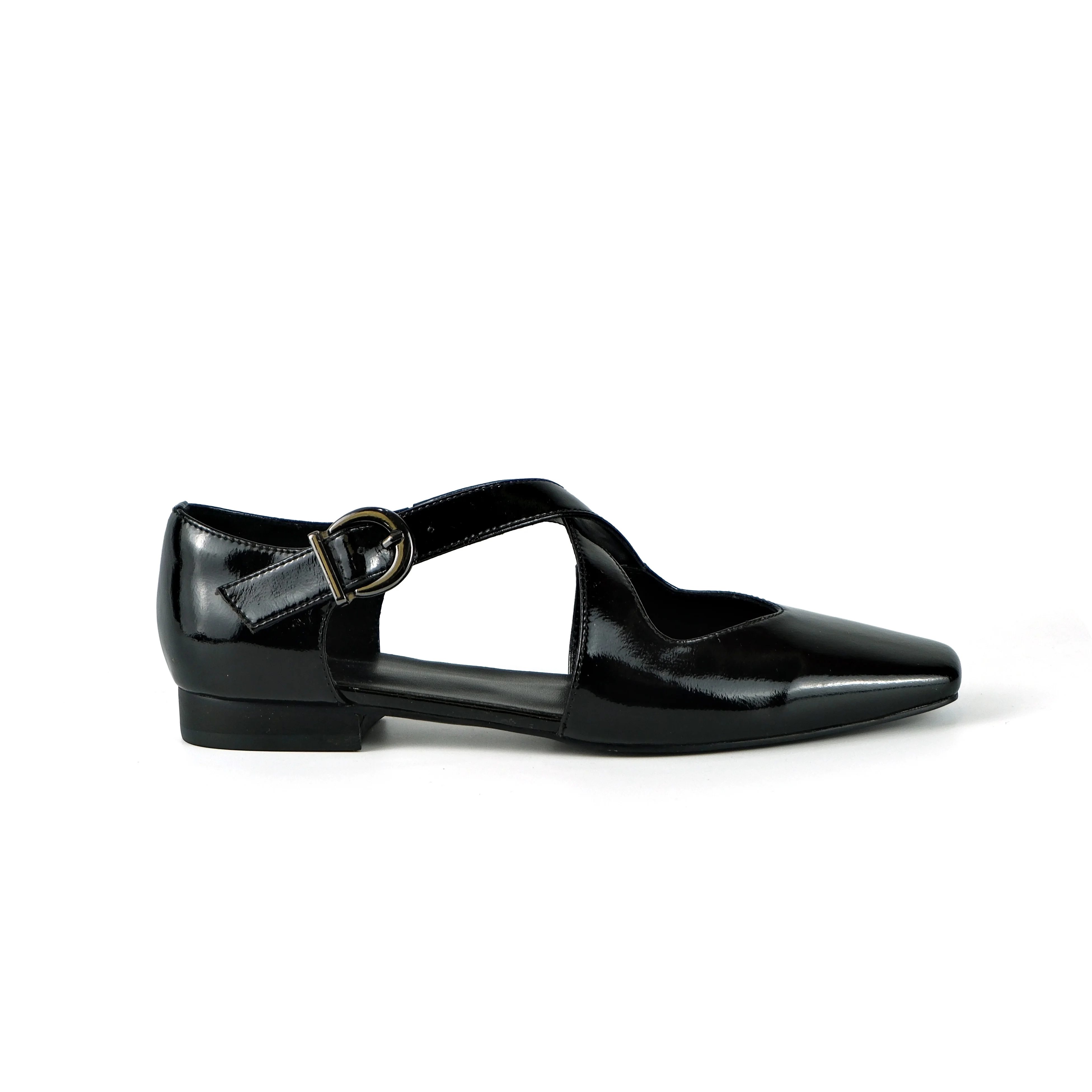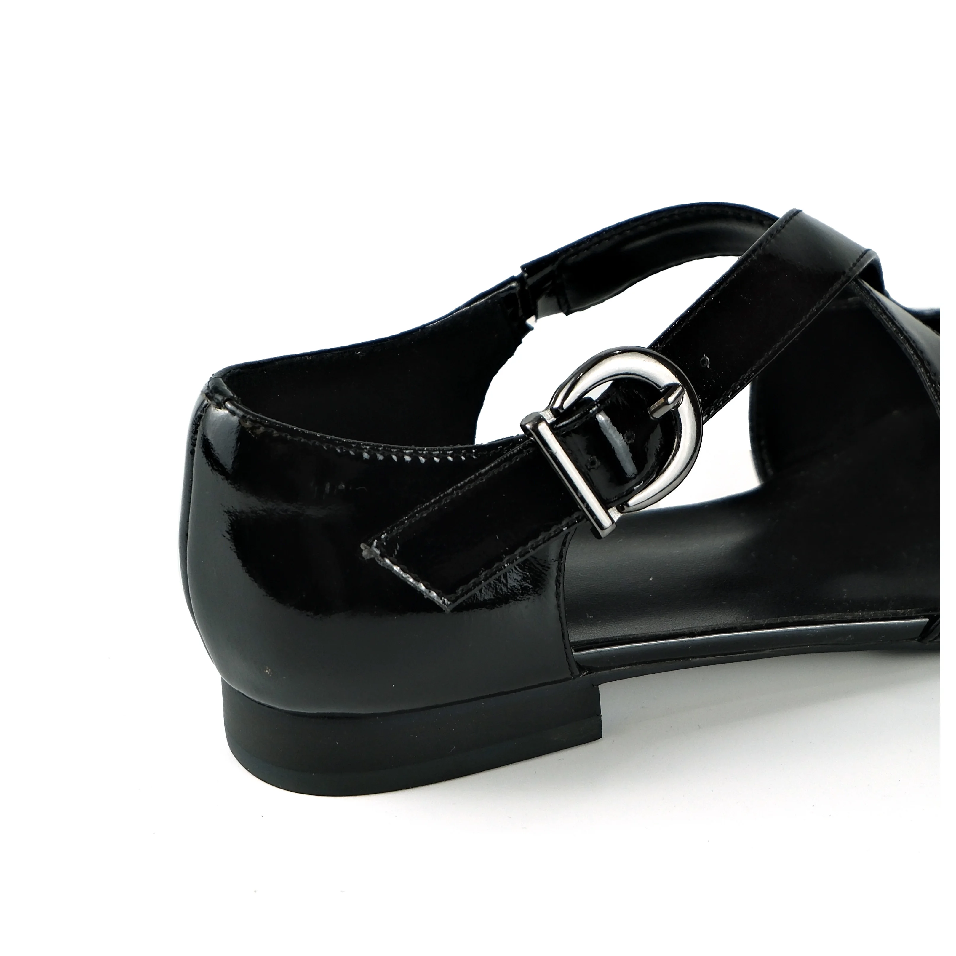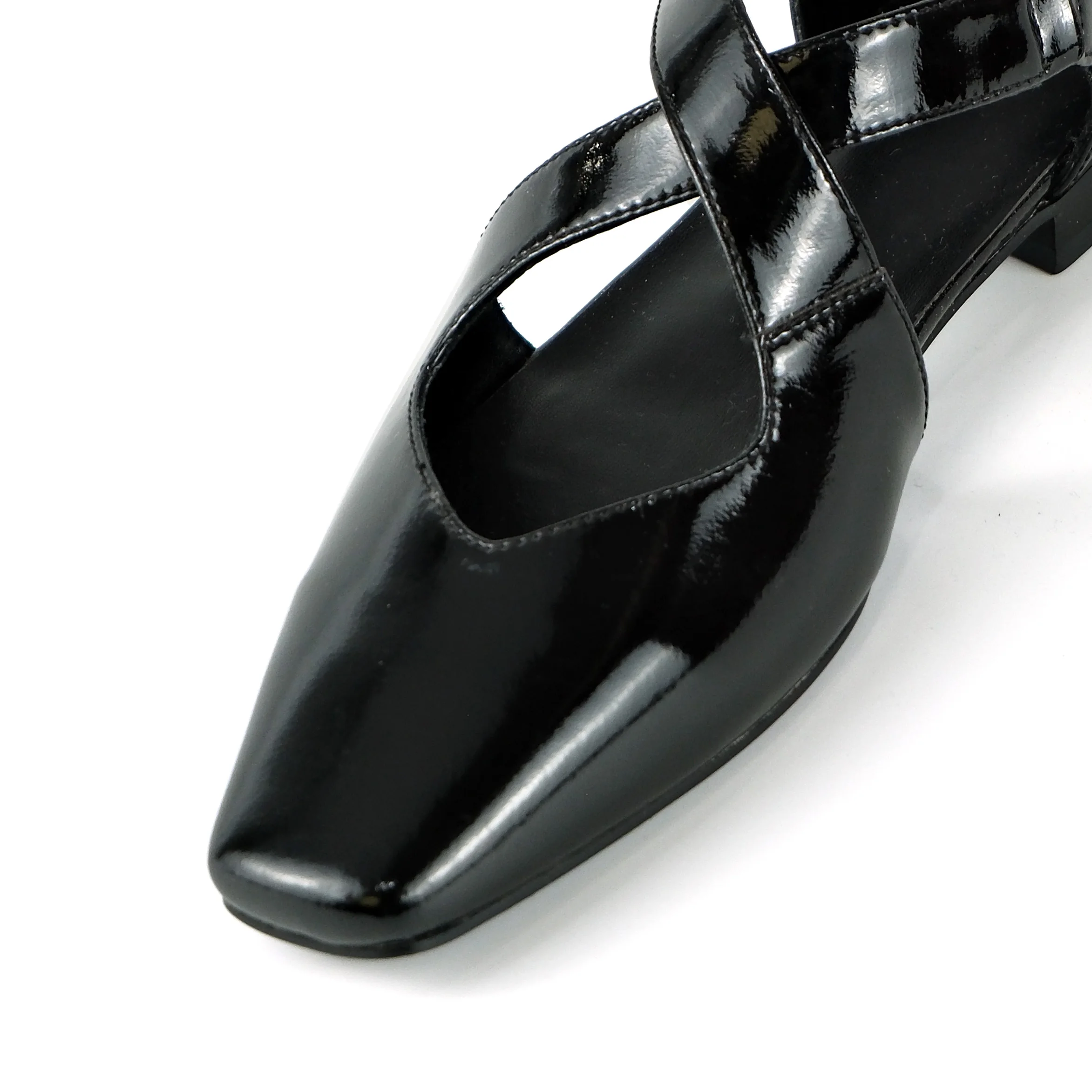 Women's Black Action Leather Cutout Flats-Buckle Detail Square-Toe Casual Footwear Fashion Trend Summer Outdoor
