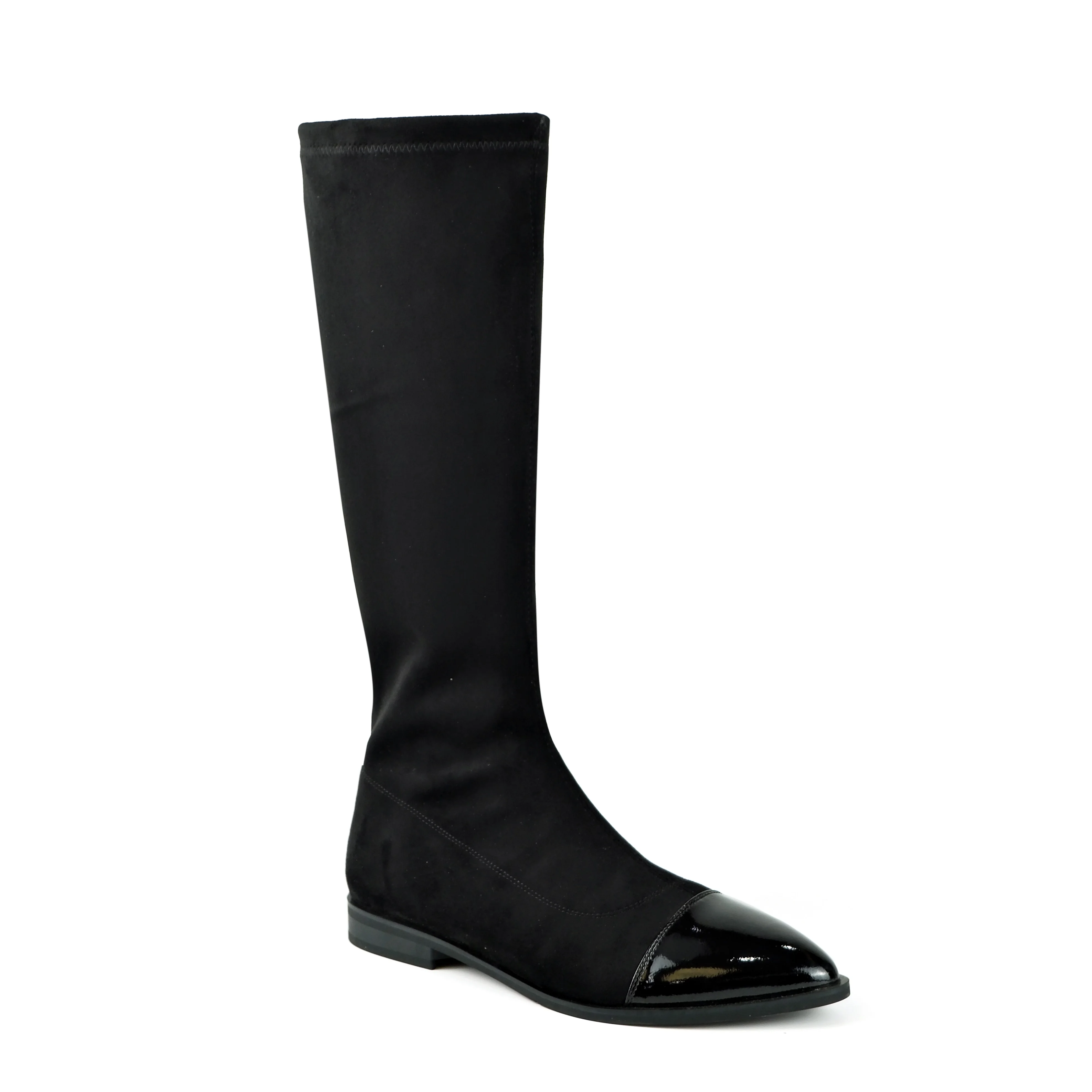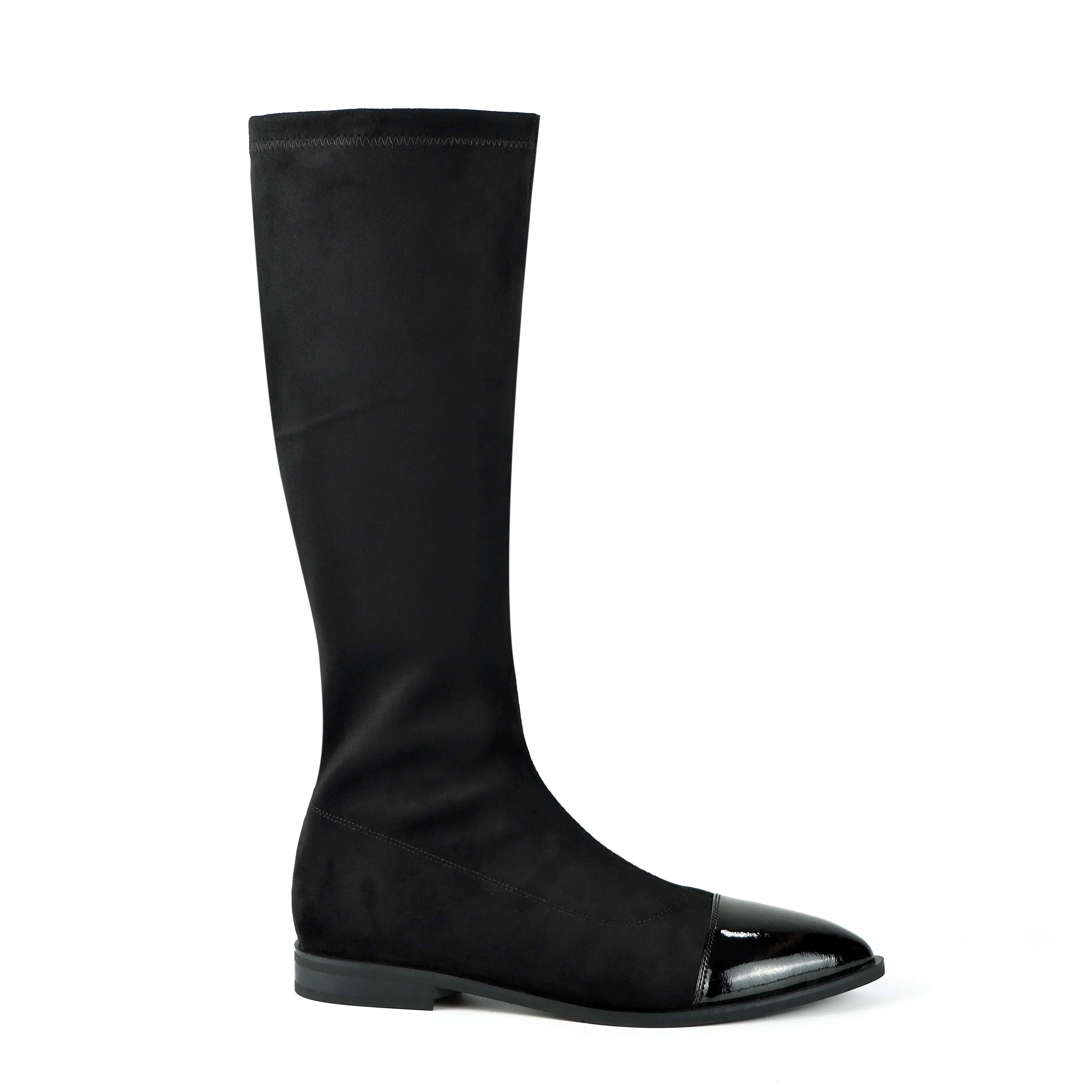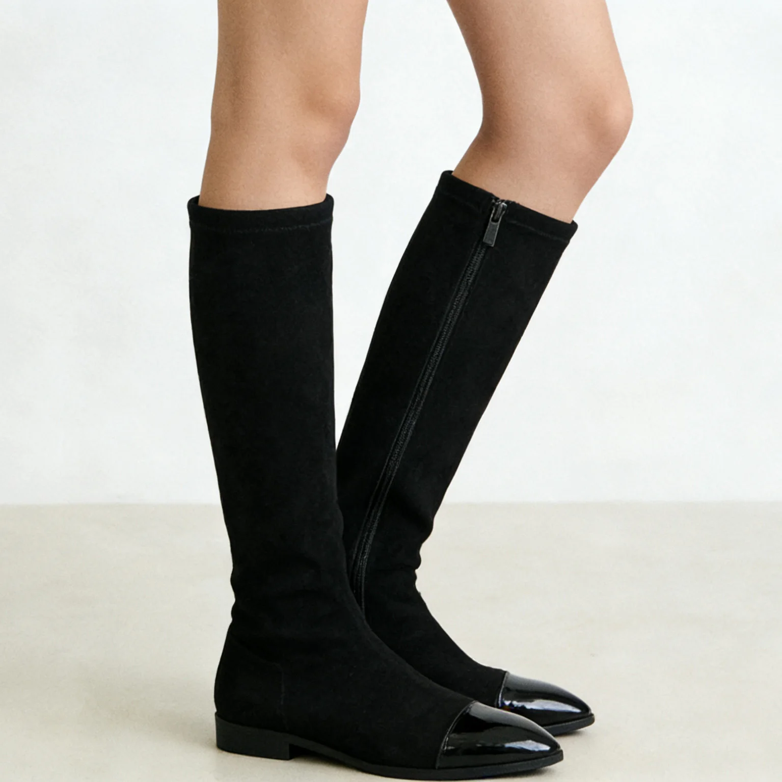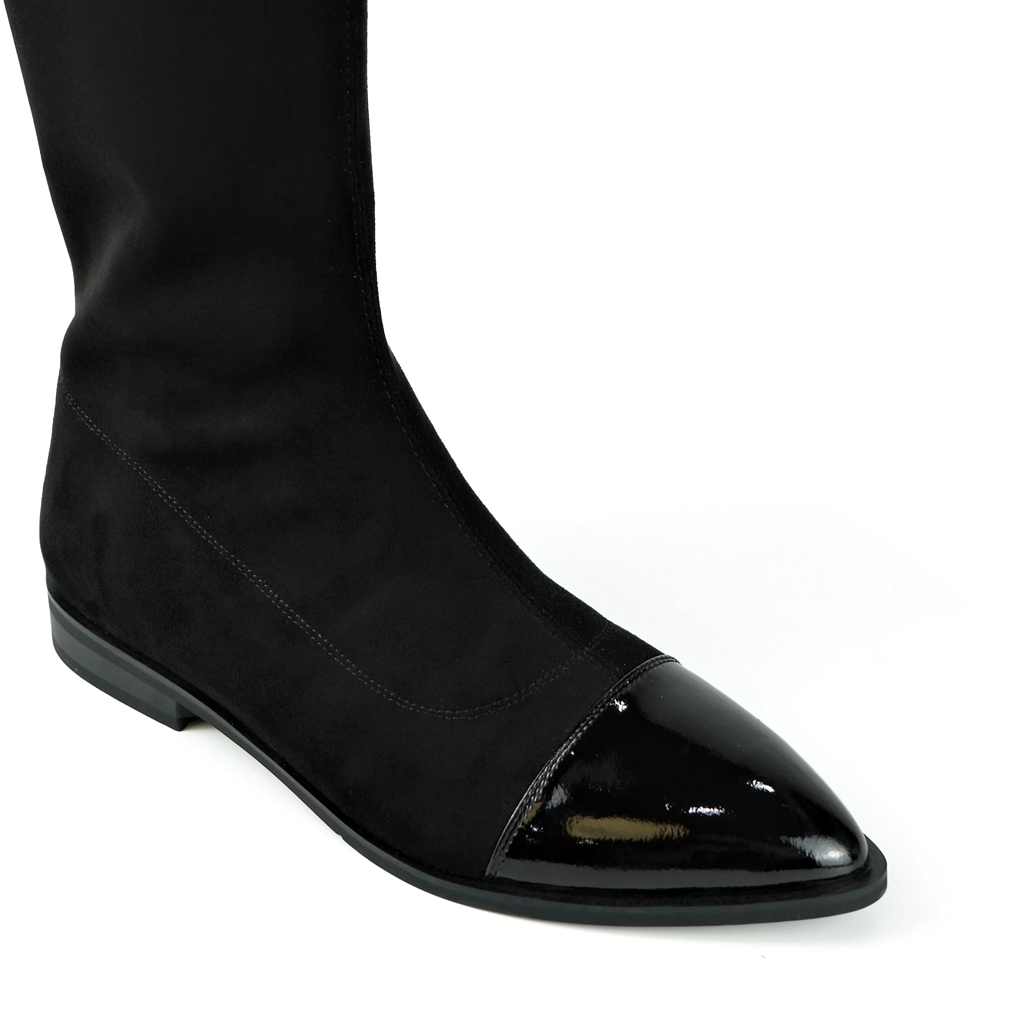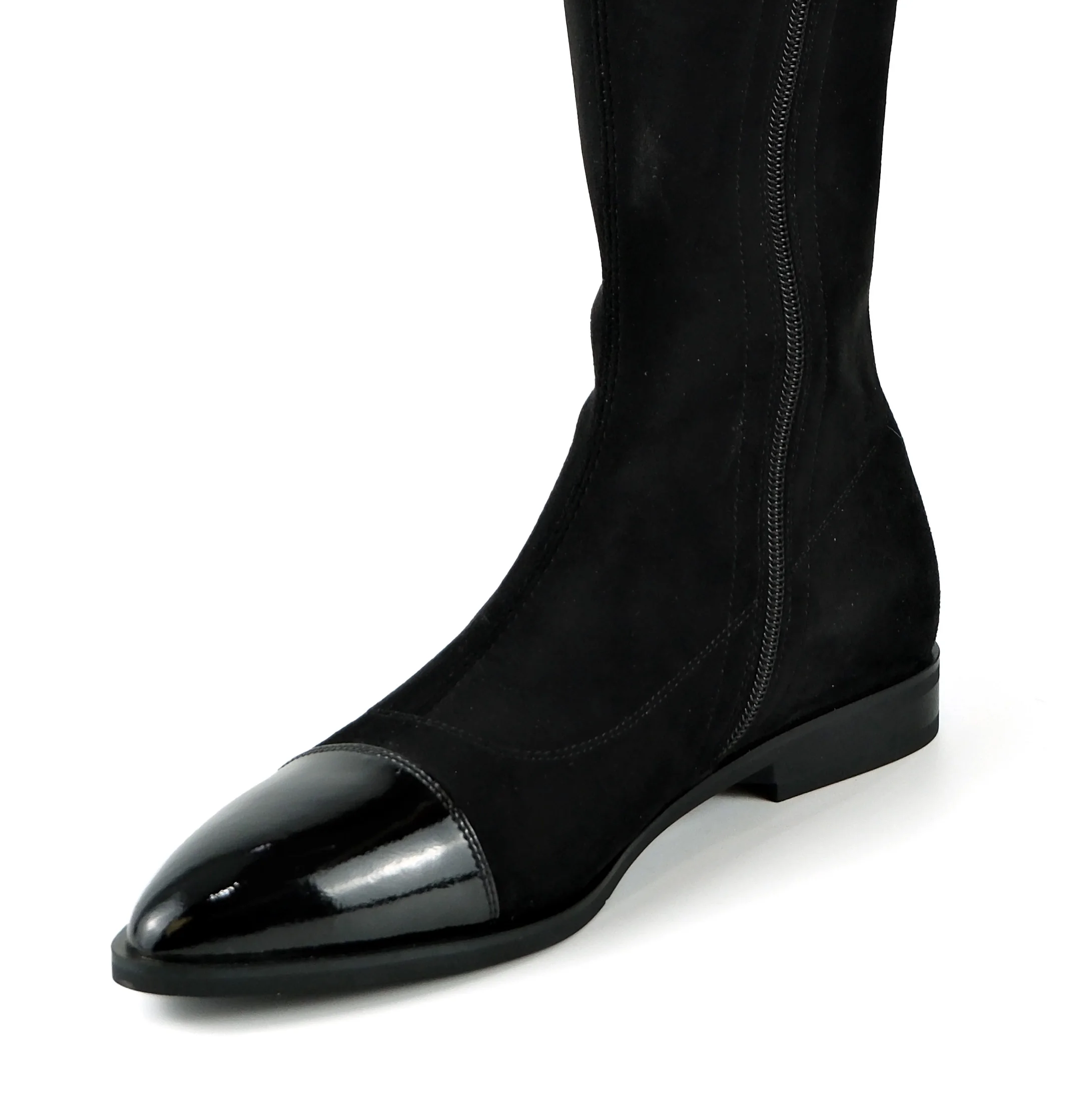 Women's Black Faux Suede & Action Leather Knee-High Boots - Pointed-Toe Zipper Slim-Fit Flat-Heel Footwear