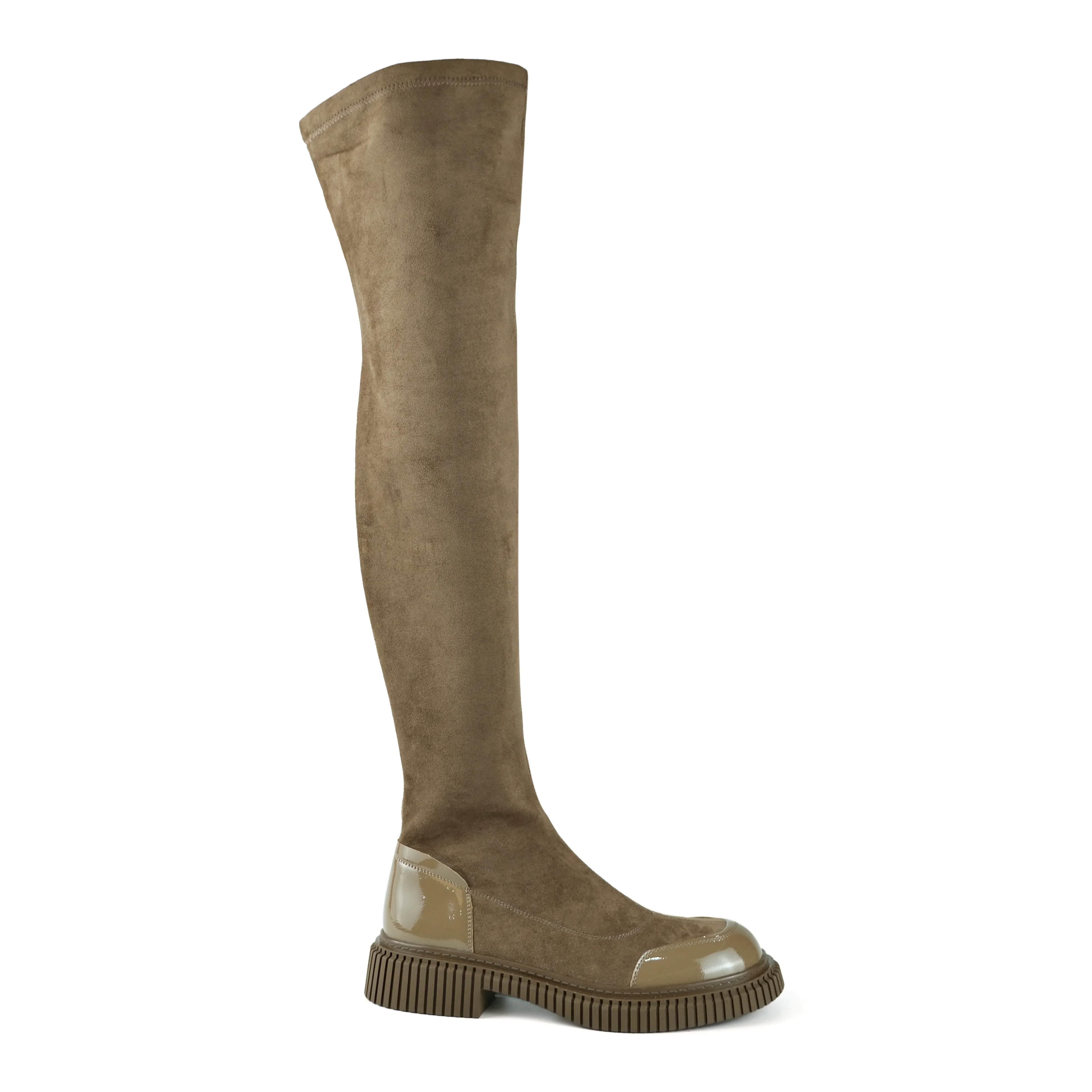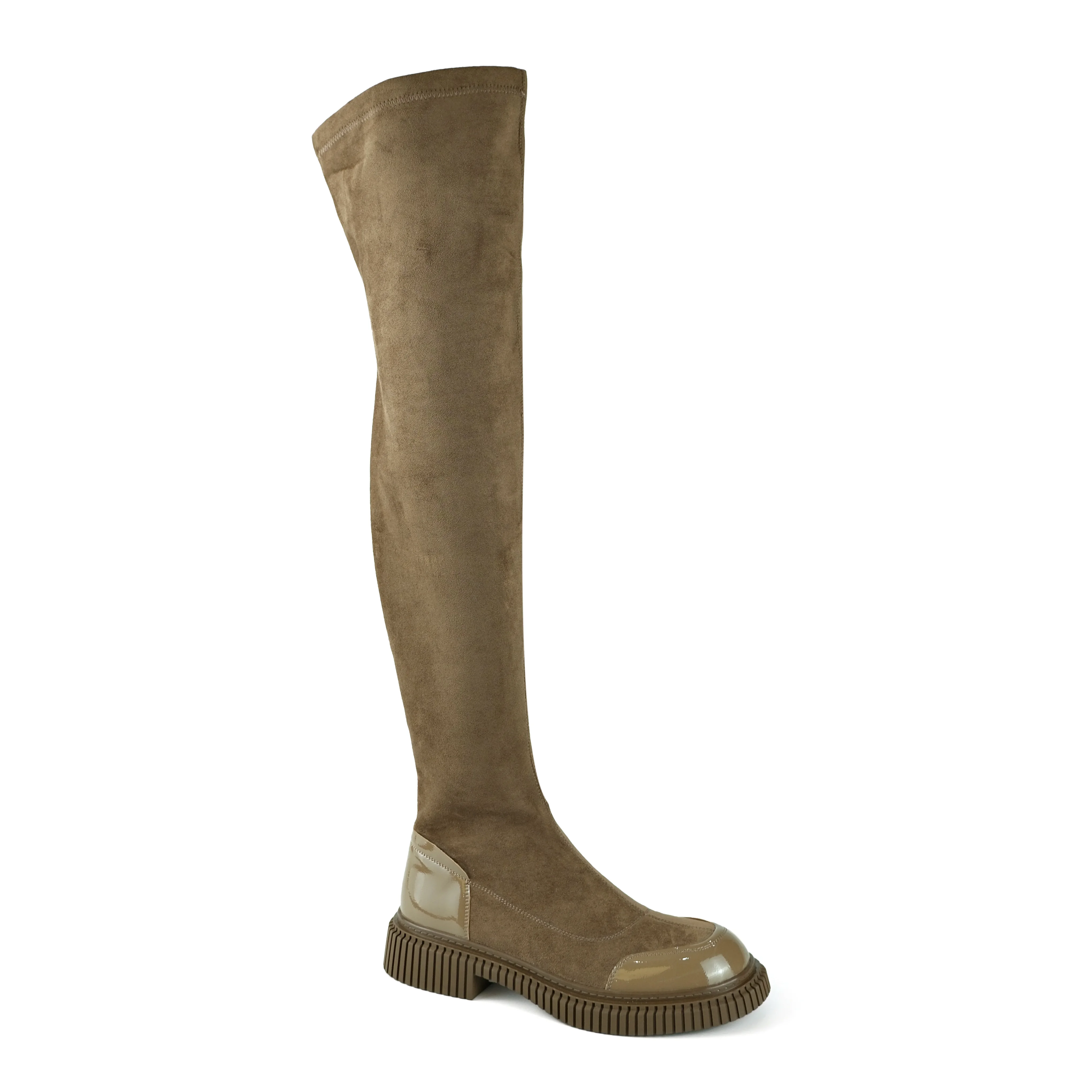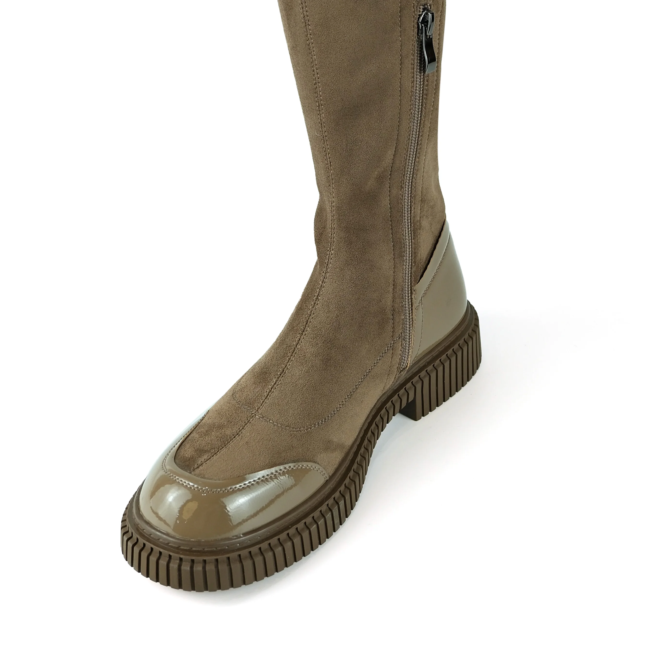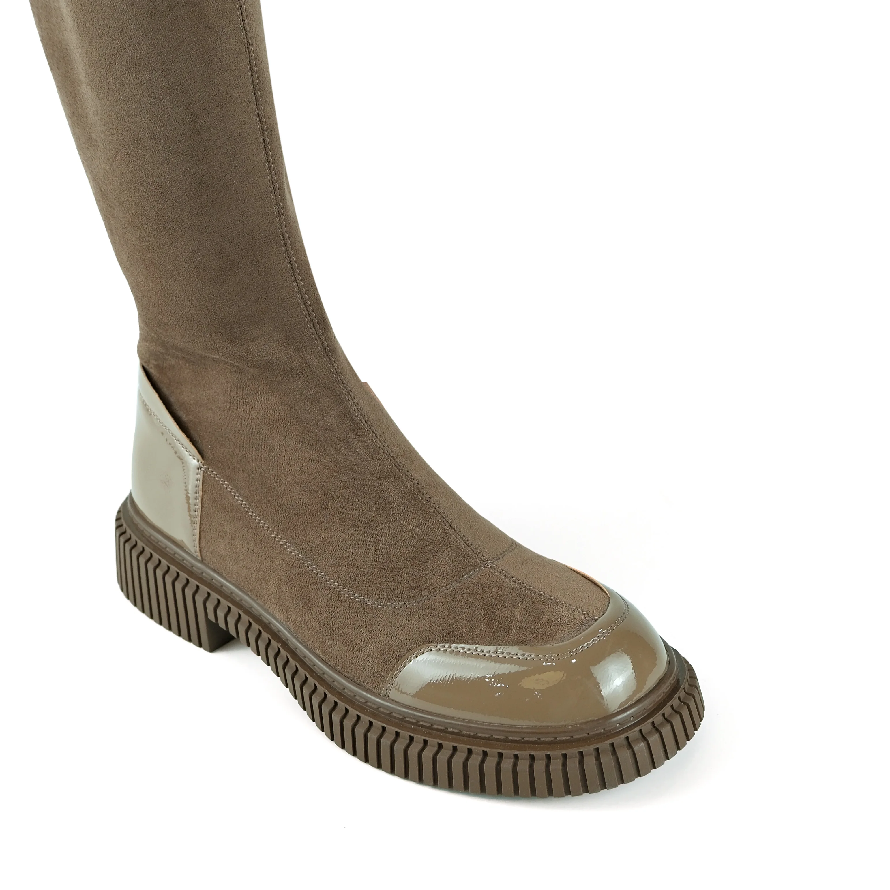 Women's Taupe Faux Suede Over-the-Knee Boots - Patent Toe Trim Ribbed Sole Zipper Footwear