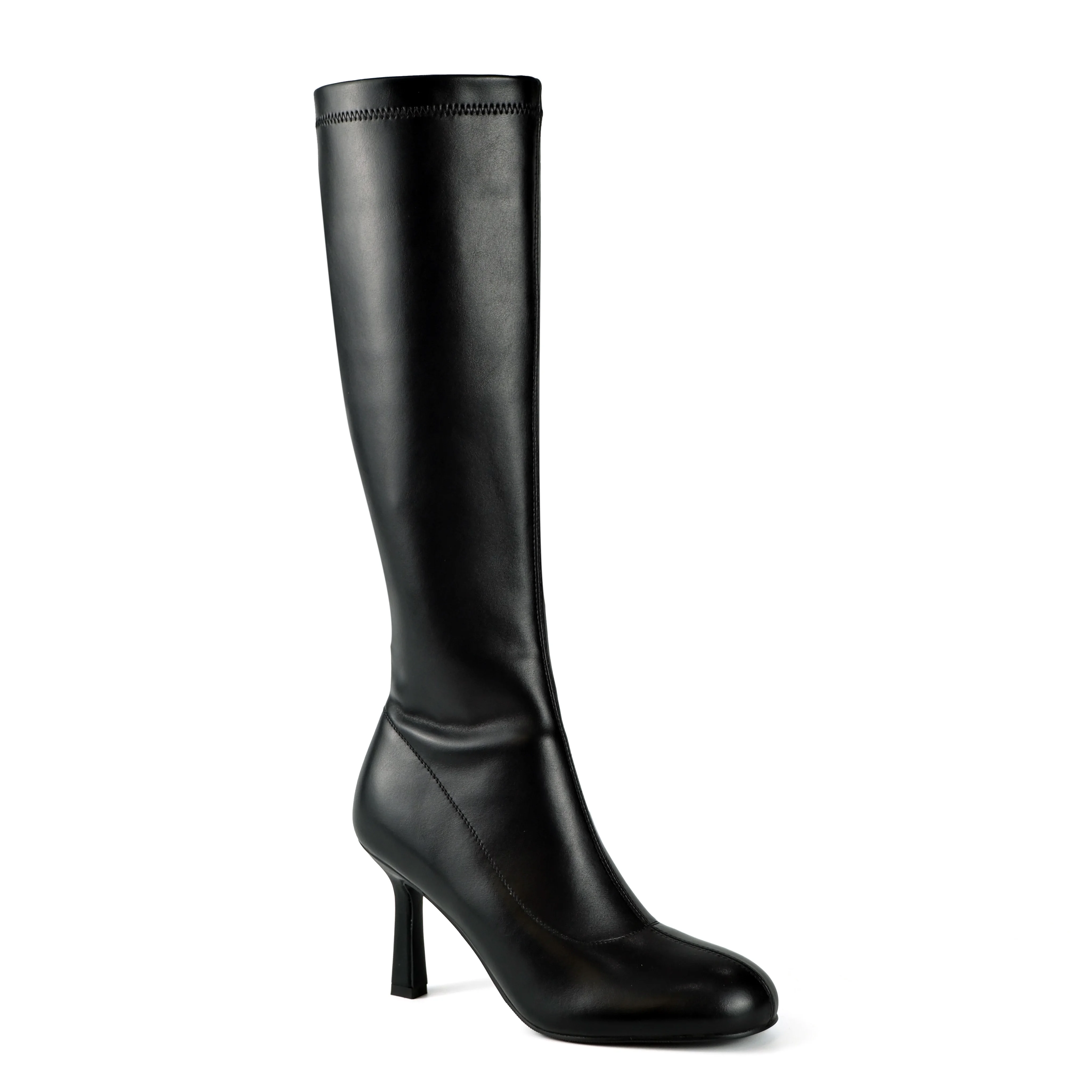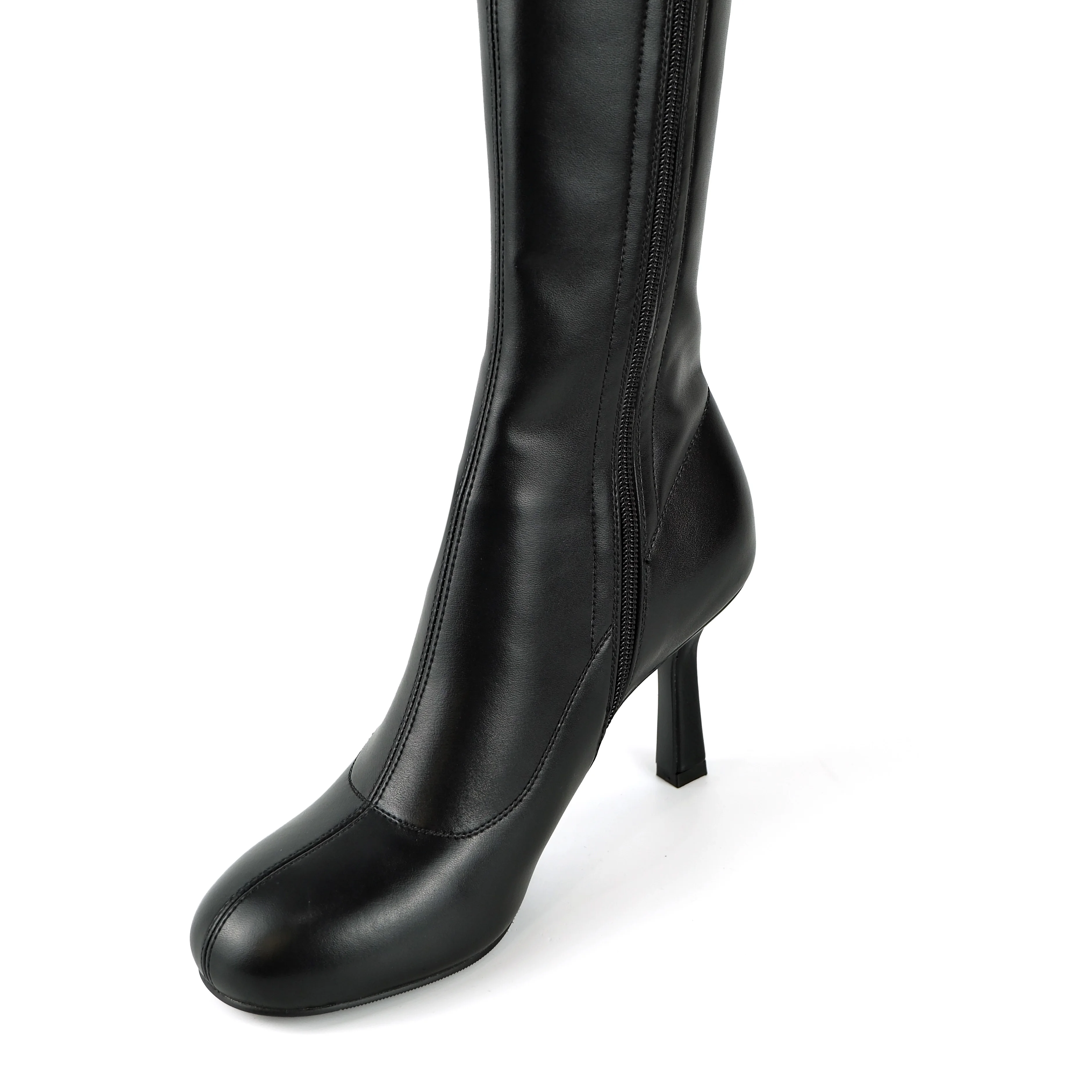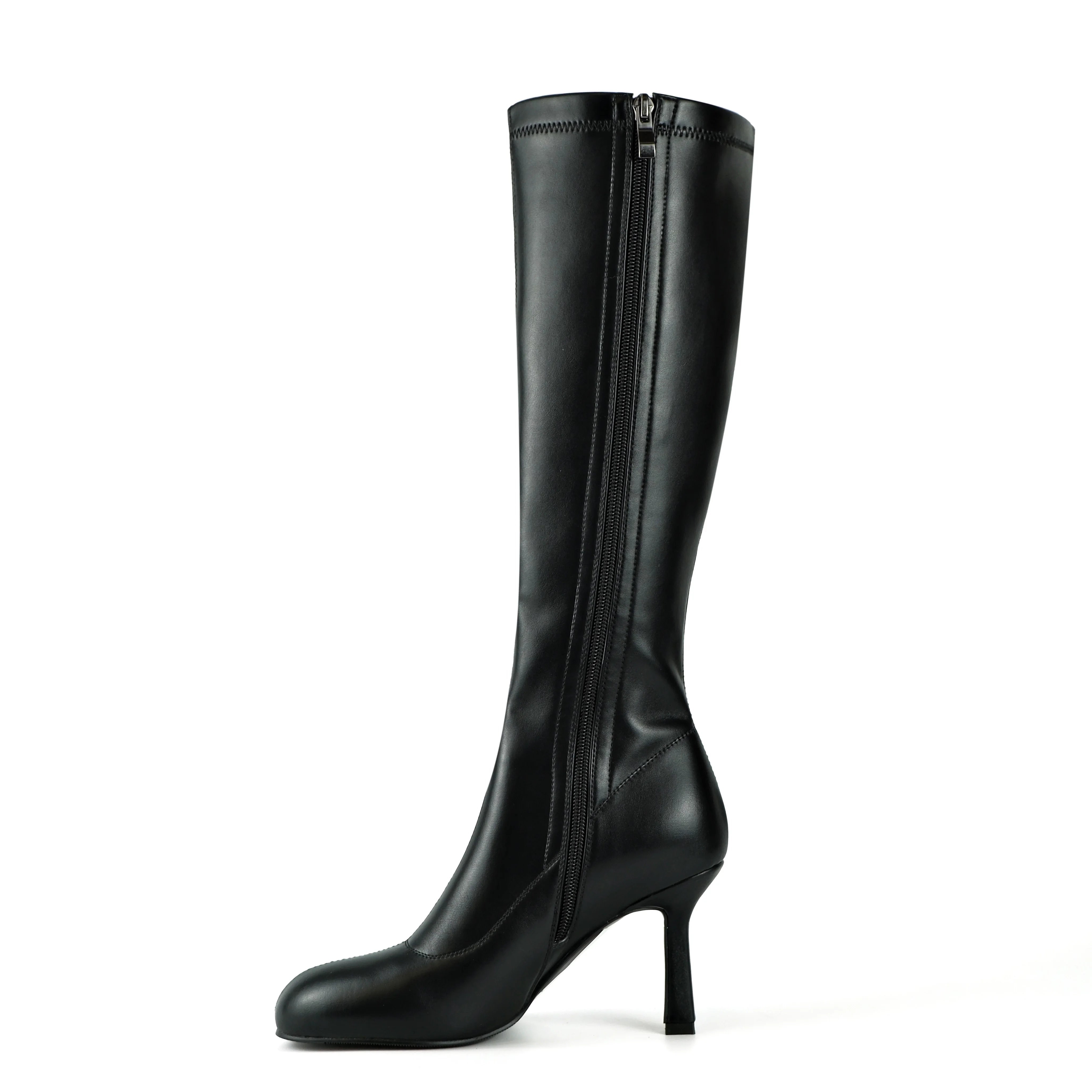 Women's Black PU Western Comfort Knee-High Boots-Stiletto Heel Round-Toe Zipper Slim-Fit Footwear