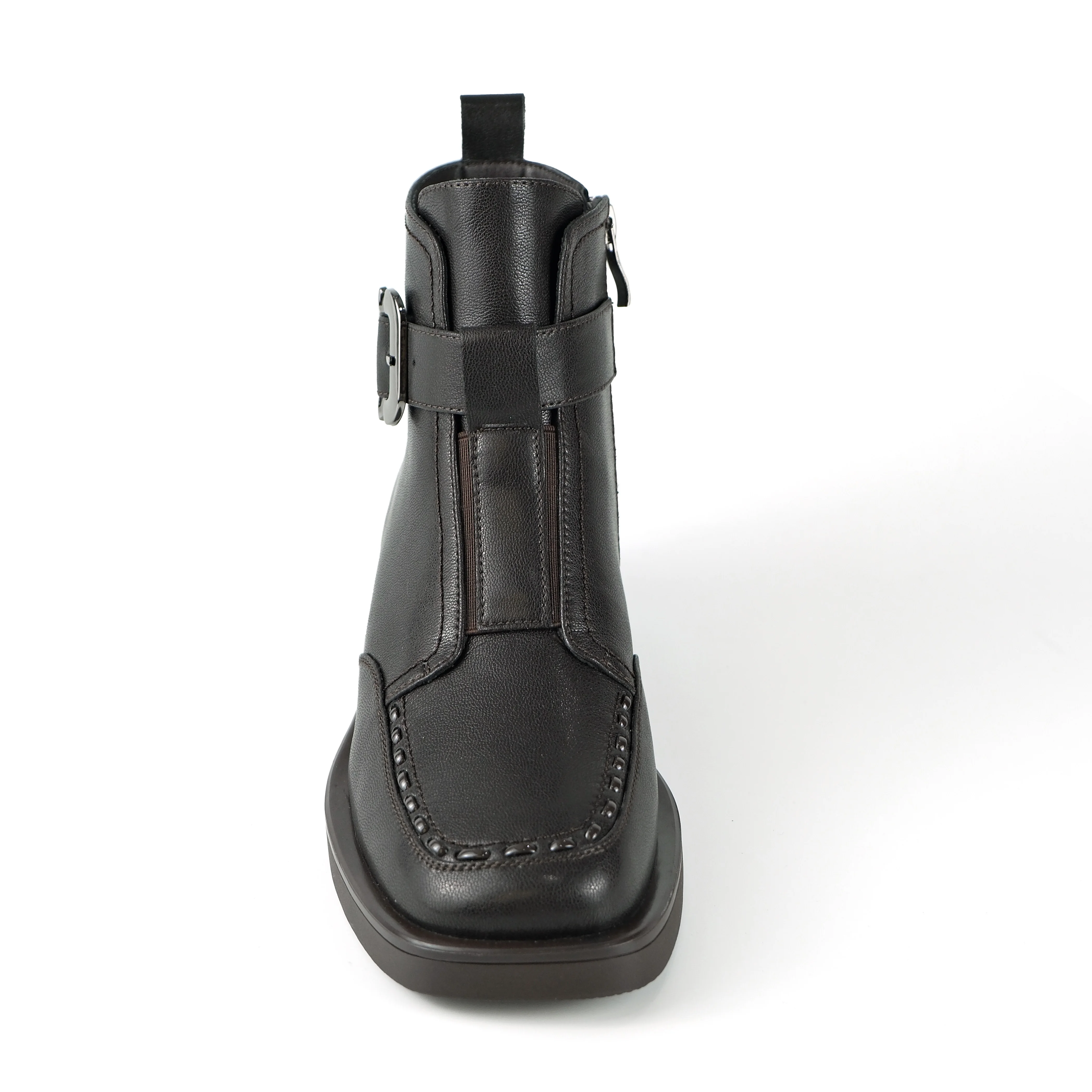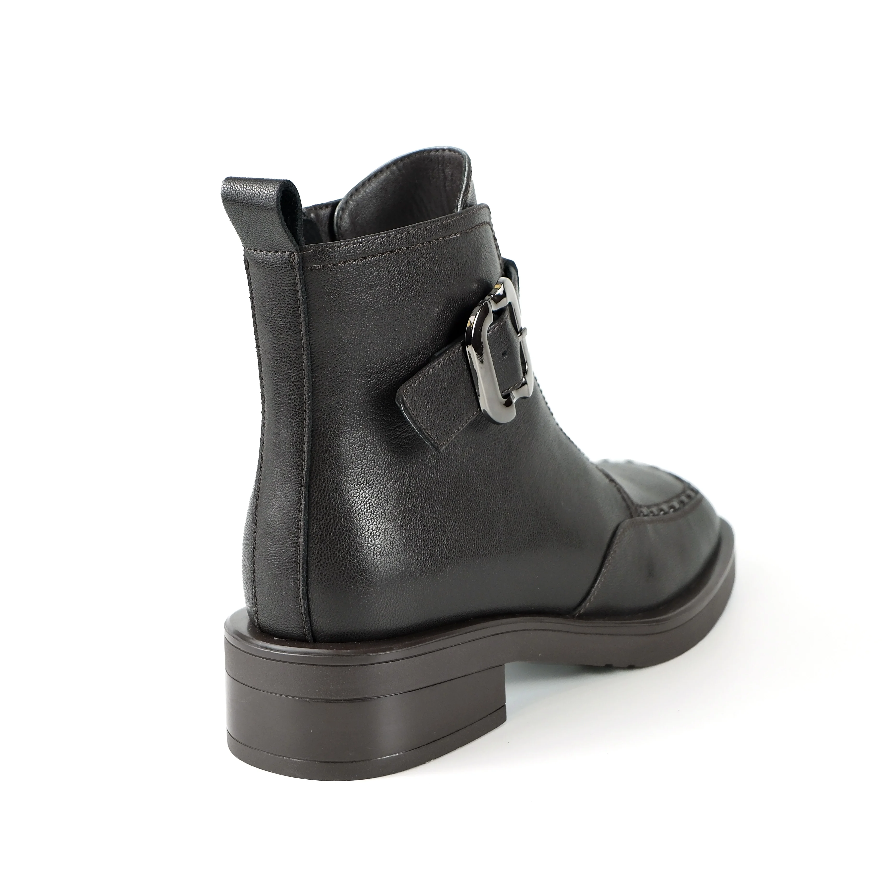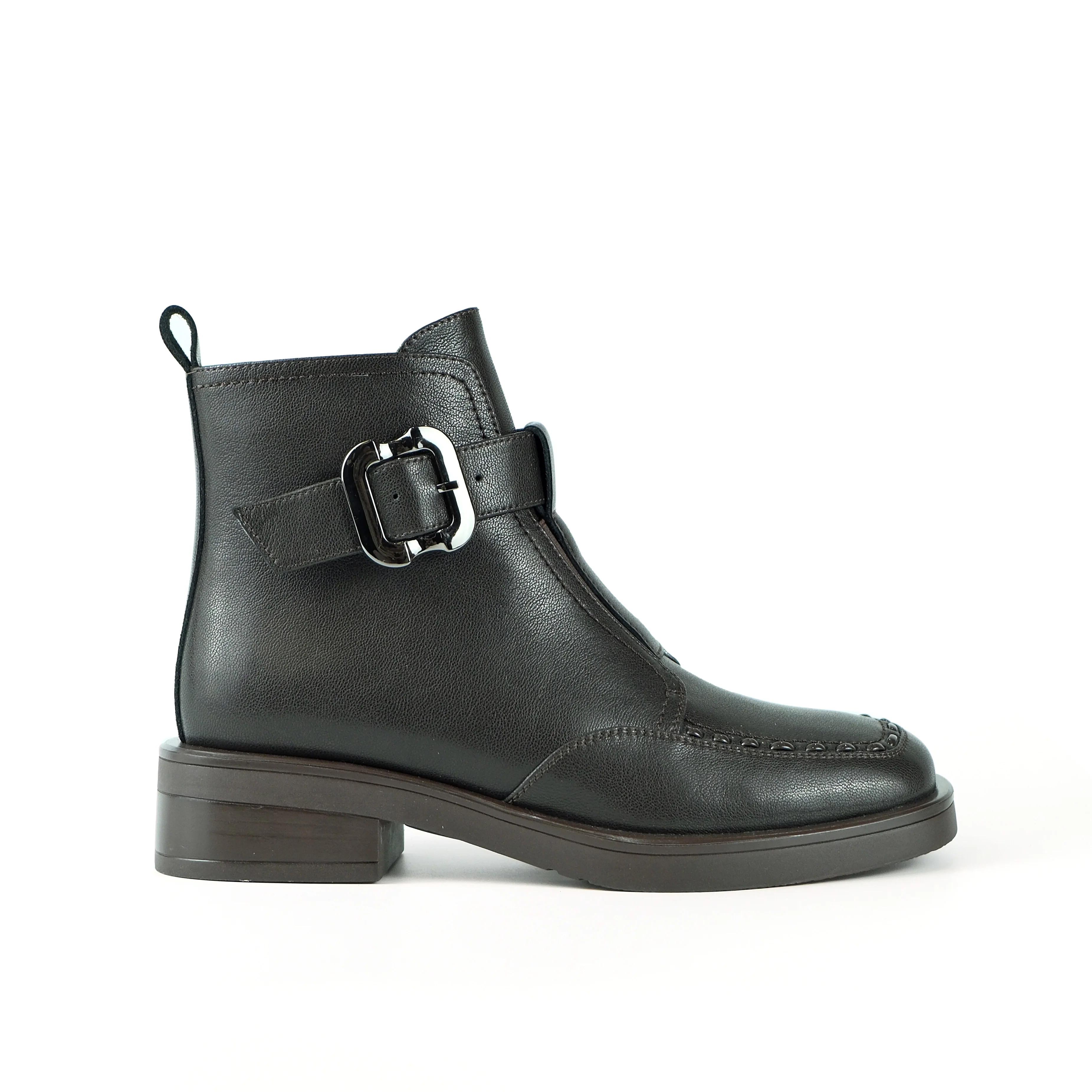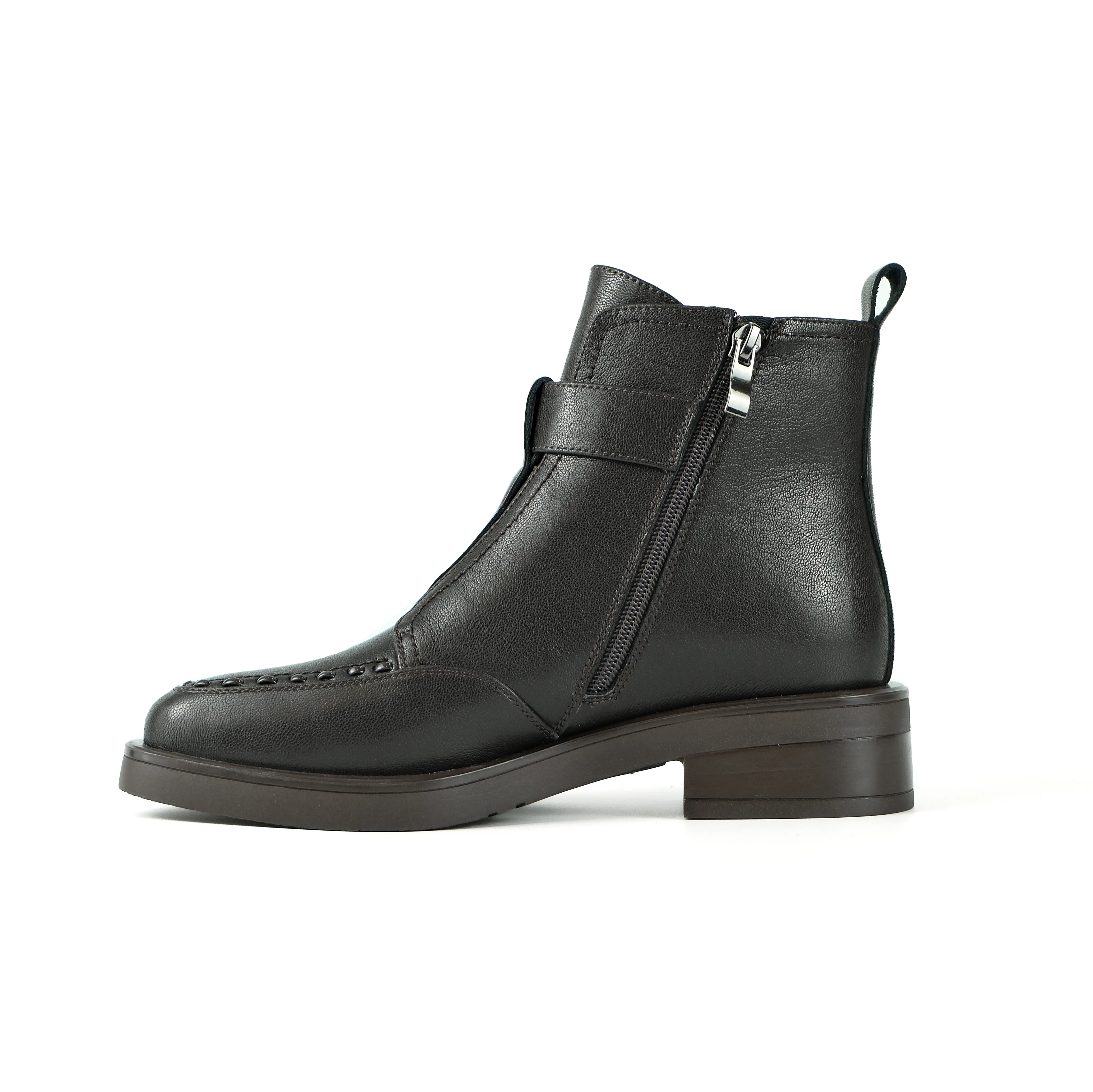 Women's Black Square Action Leather Ankle Boots-ZIP Closure Brogue Soft Low Block Heel Western Comfort Casual Office Footwear