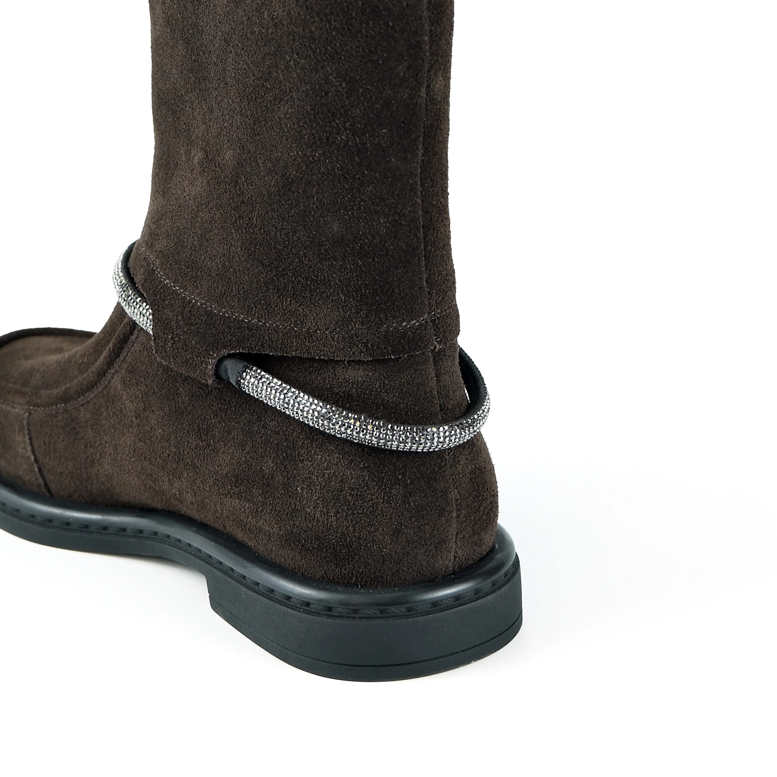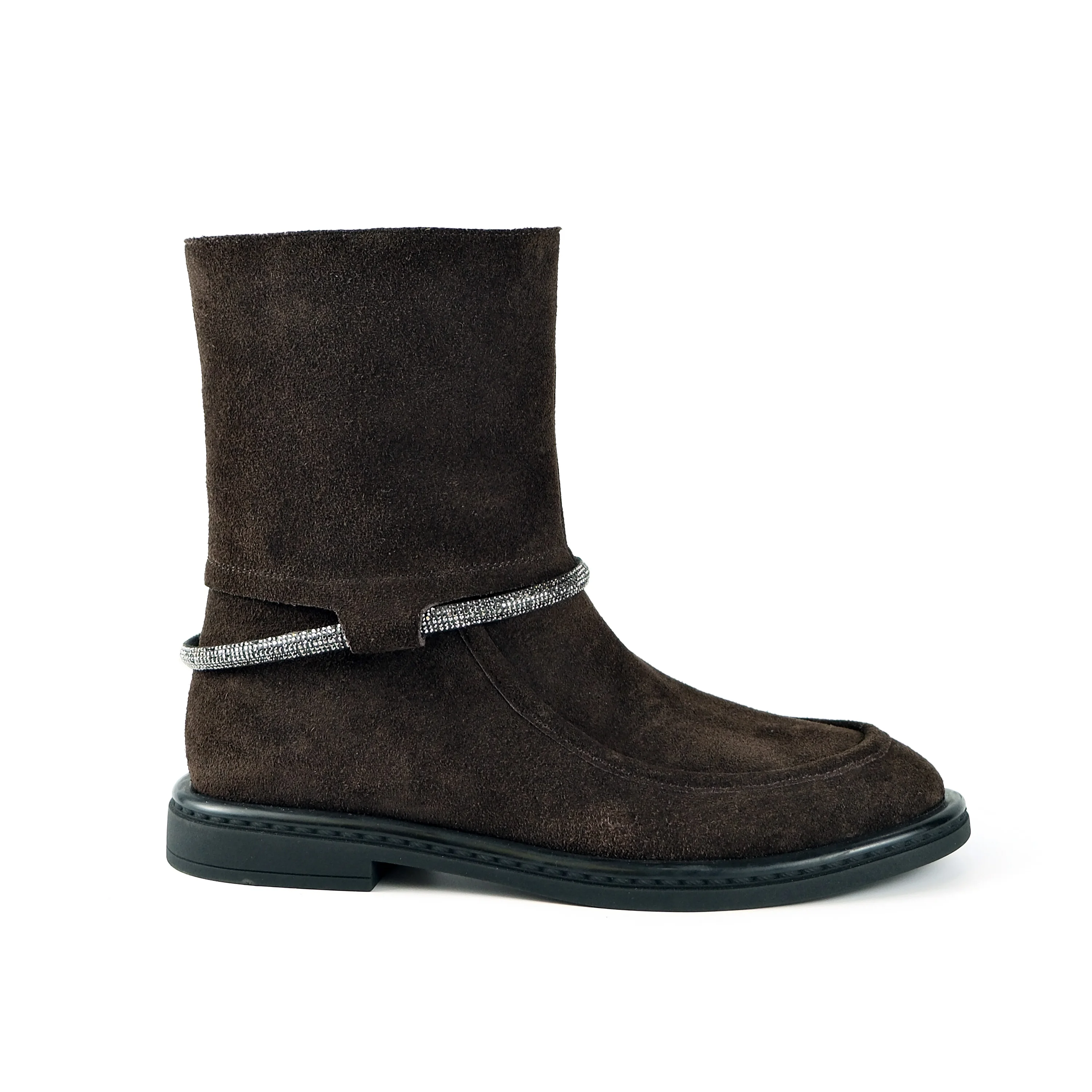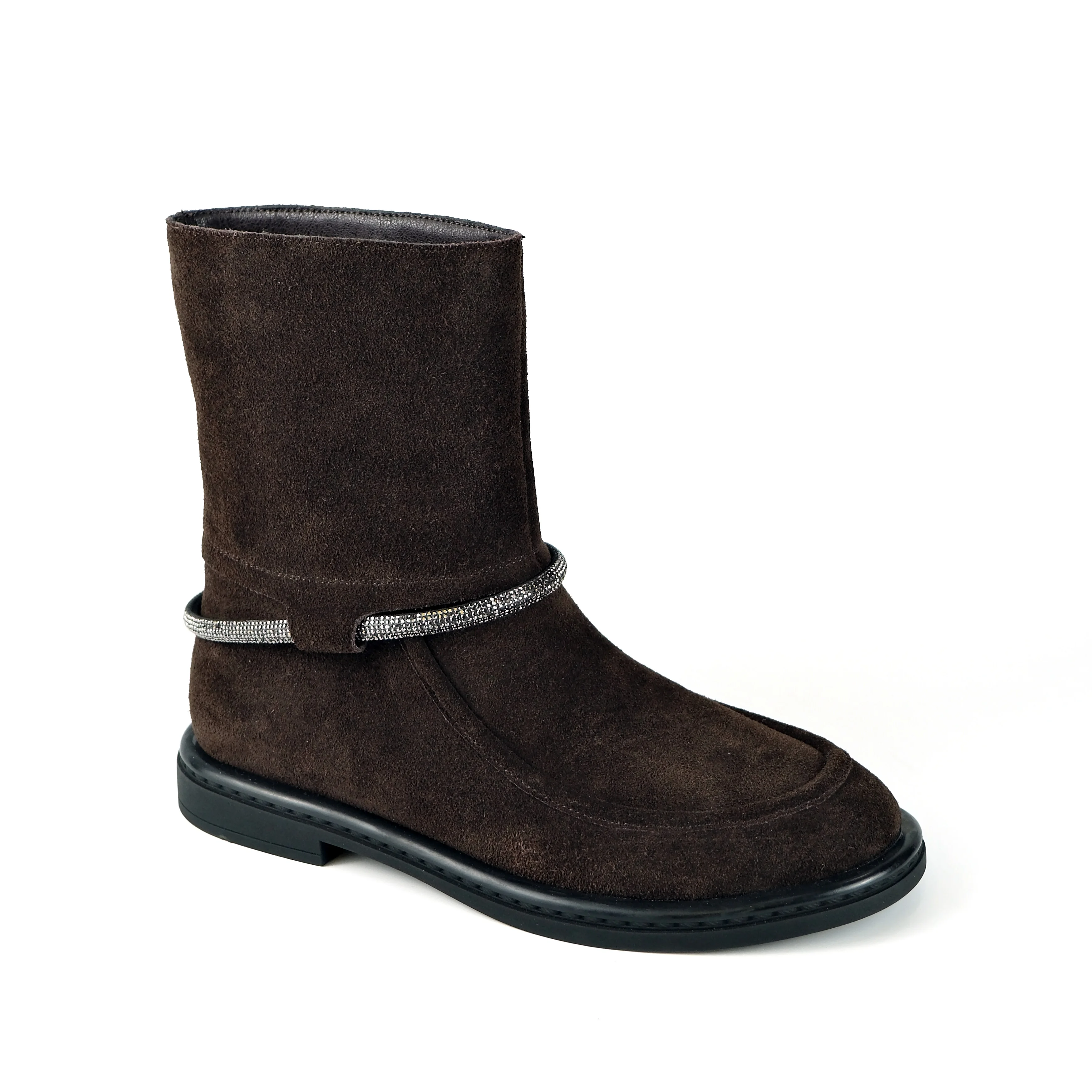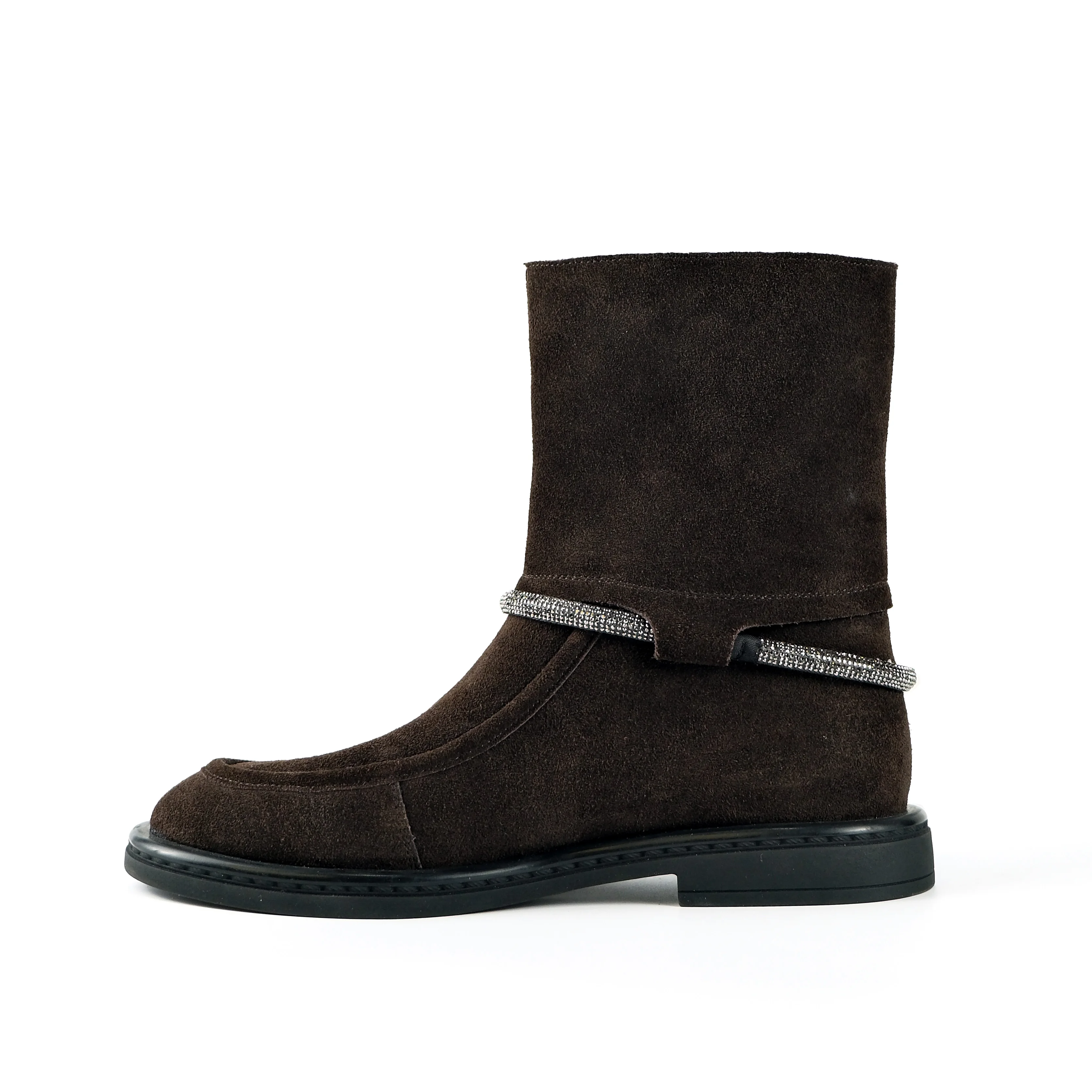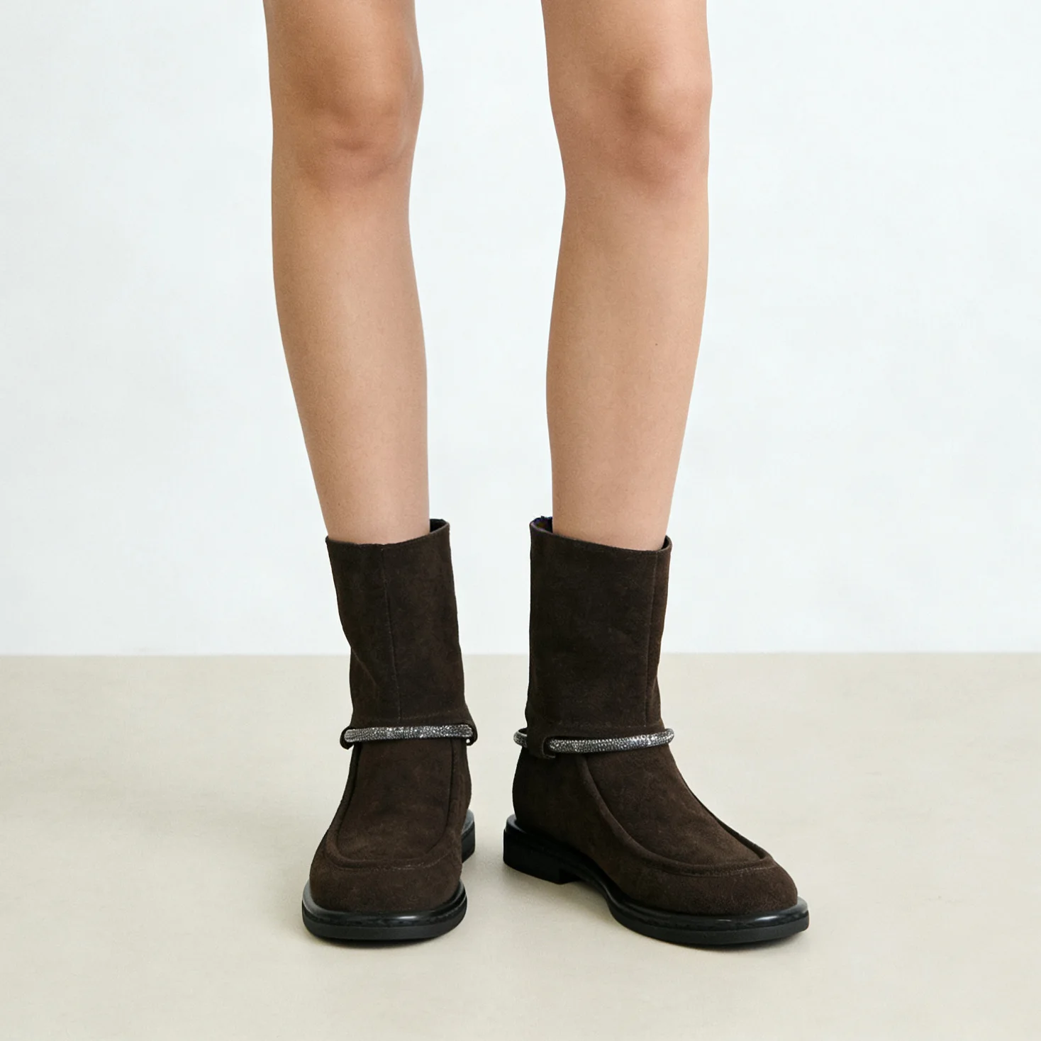 Women's Brown Suede Fashion Korean Ankle Boots-Rhinestone Strap Trim Flat-Heel Square-Toe Footwear