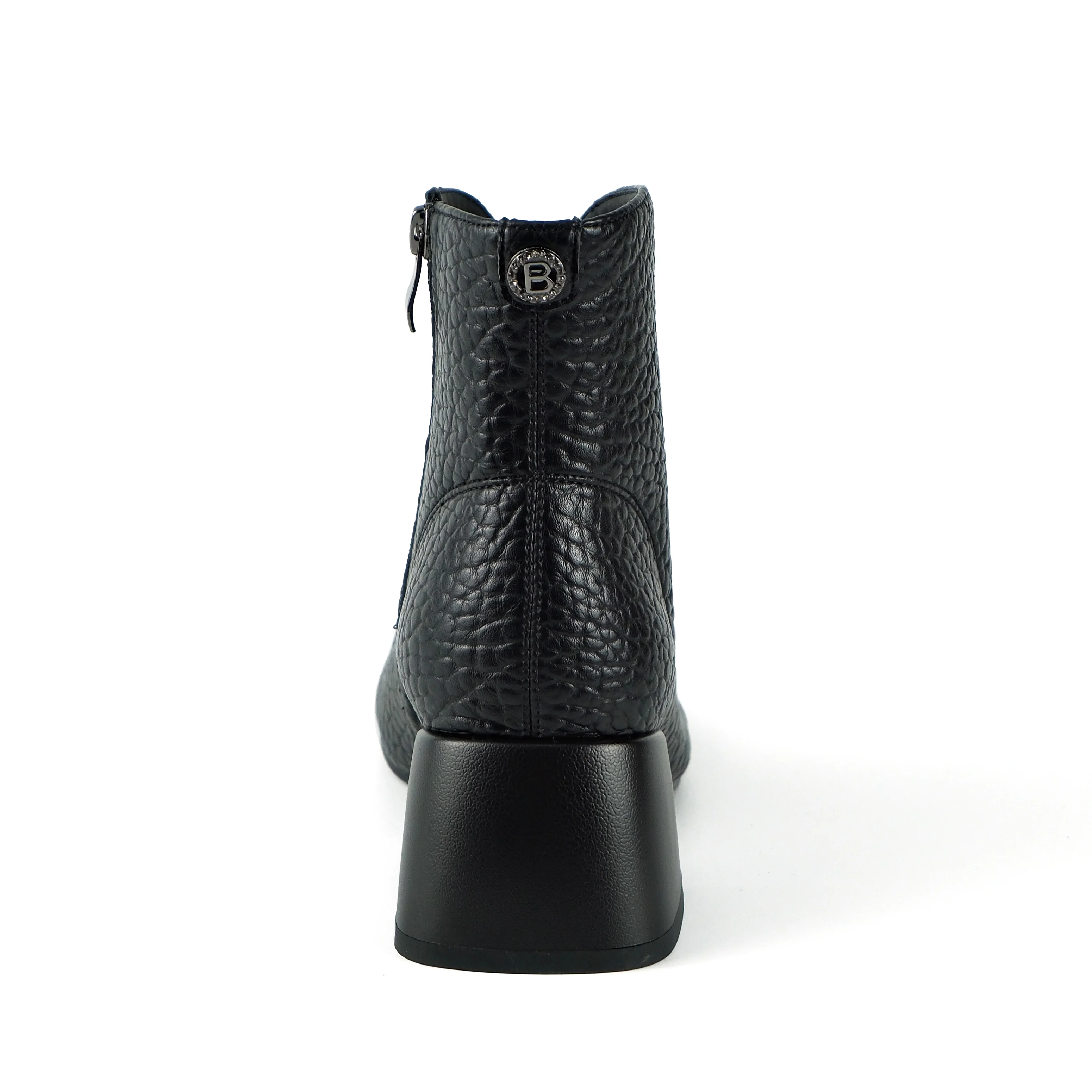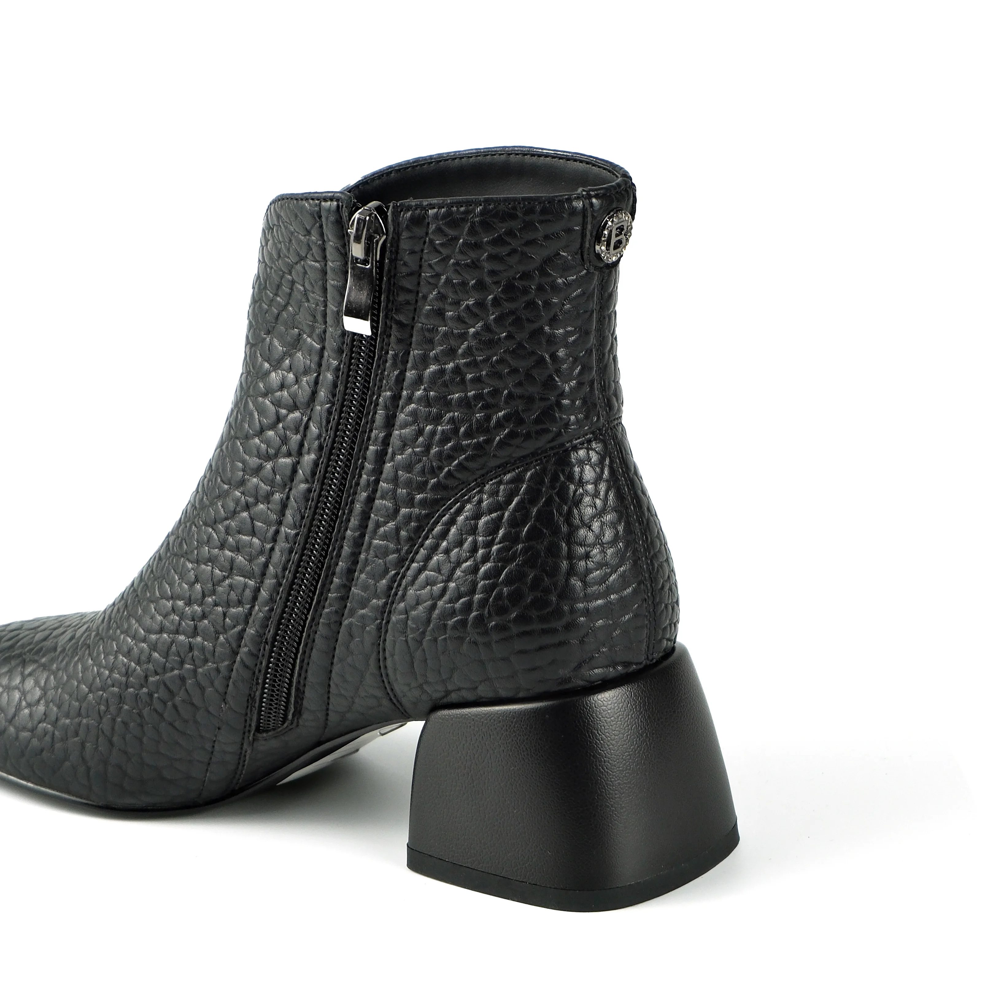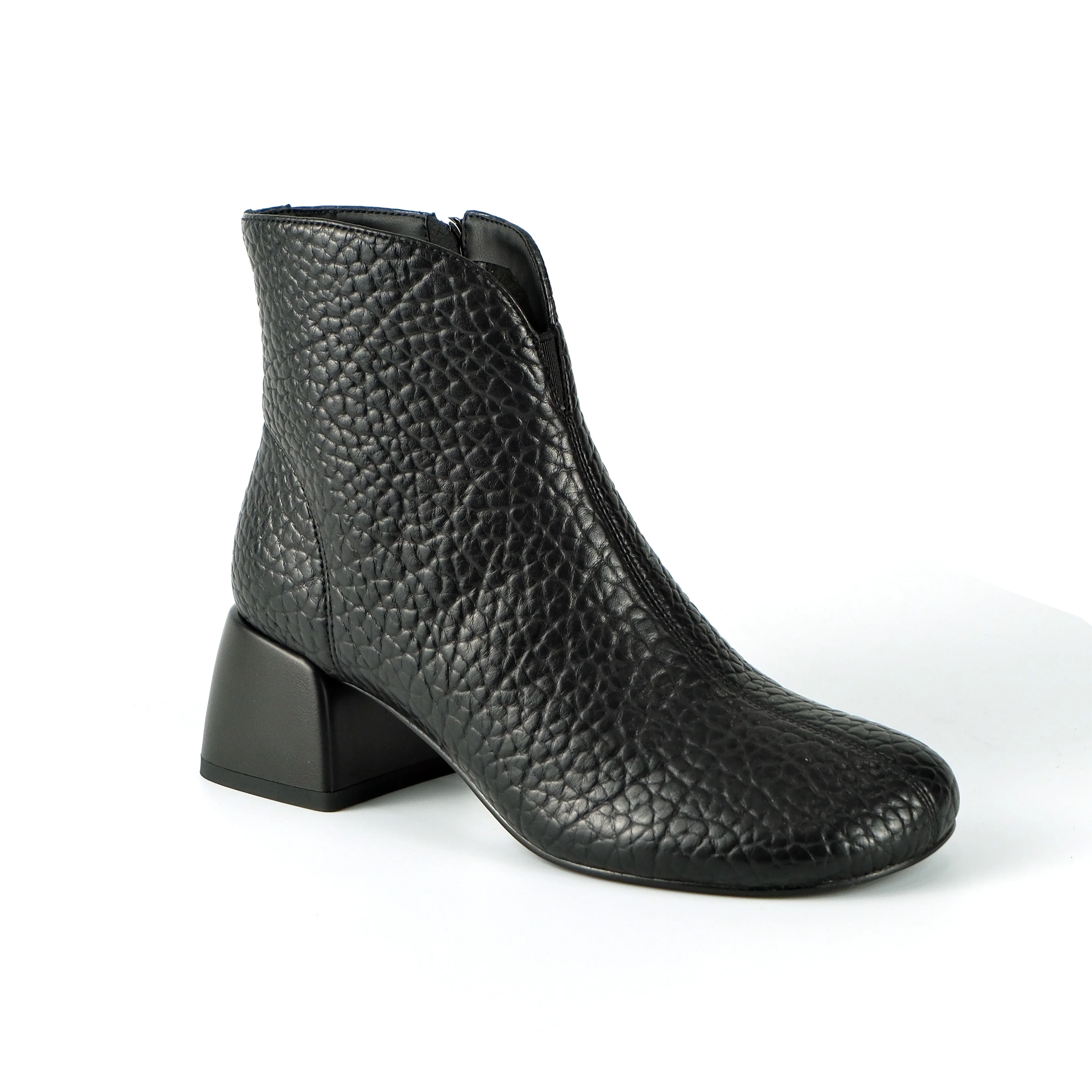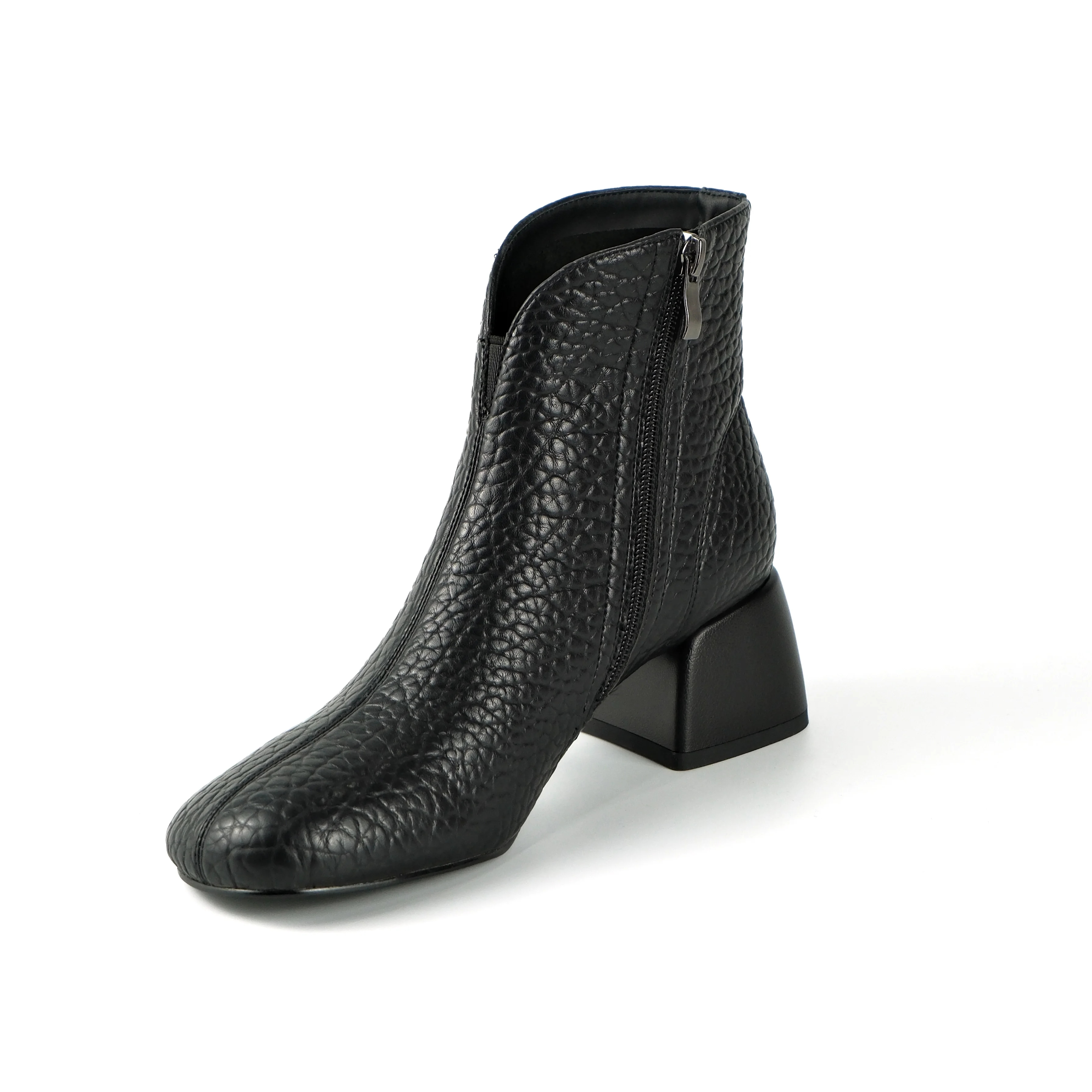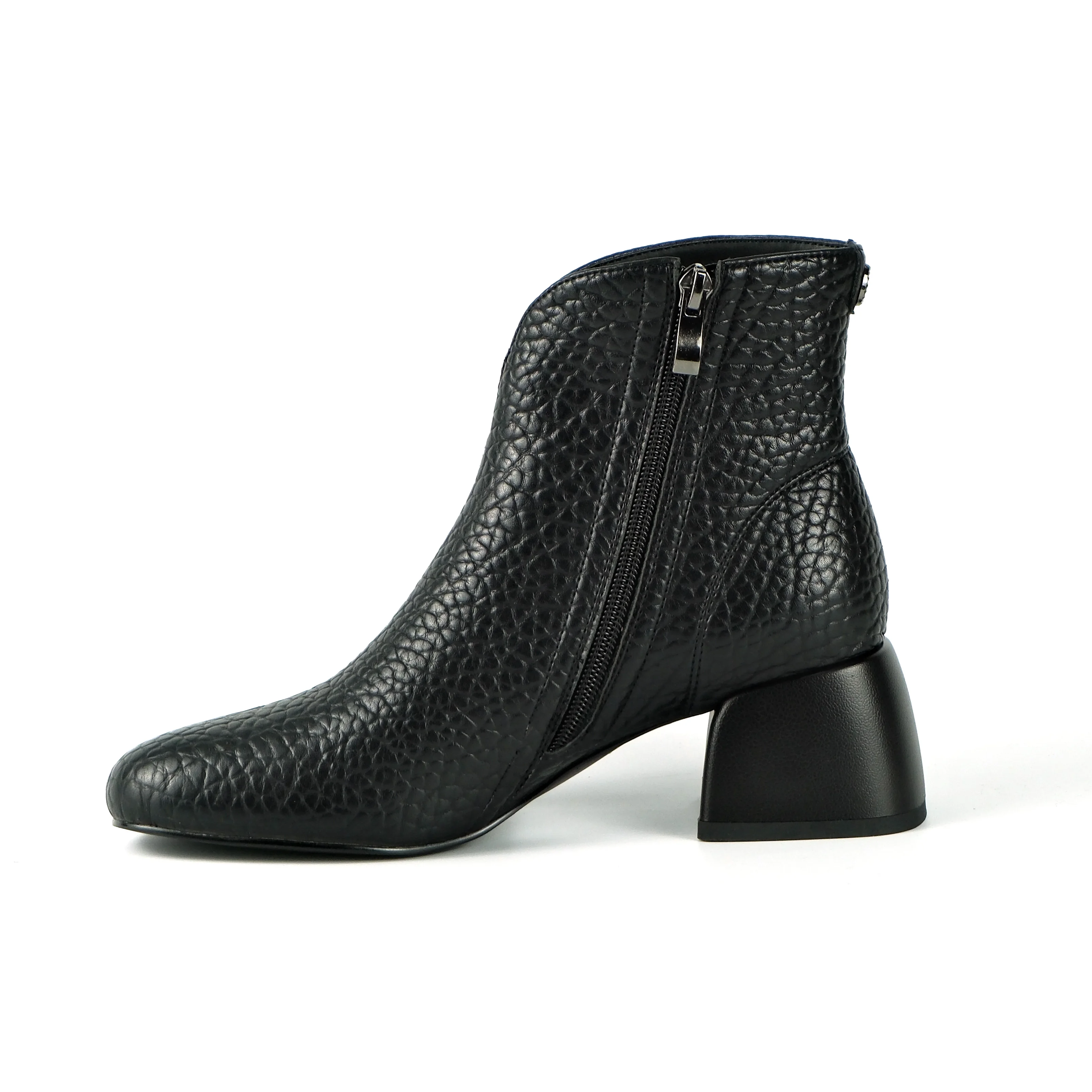 Women's Black Textured Action Leather Square Toe Ankle Boots-Chunky Block Heel ZIP Casual Office Footwear Summer Autumn