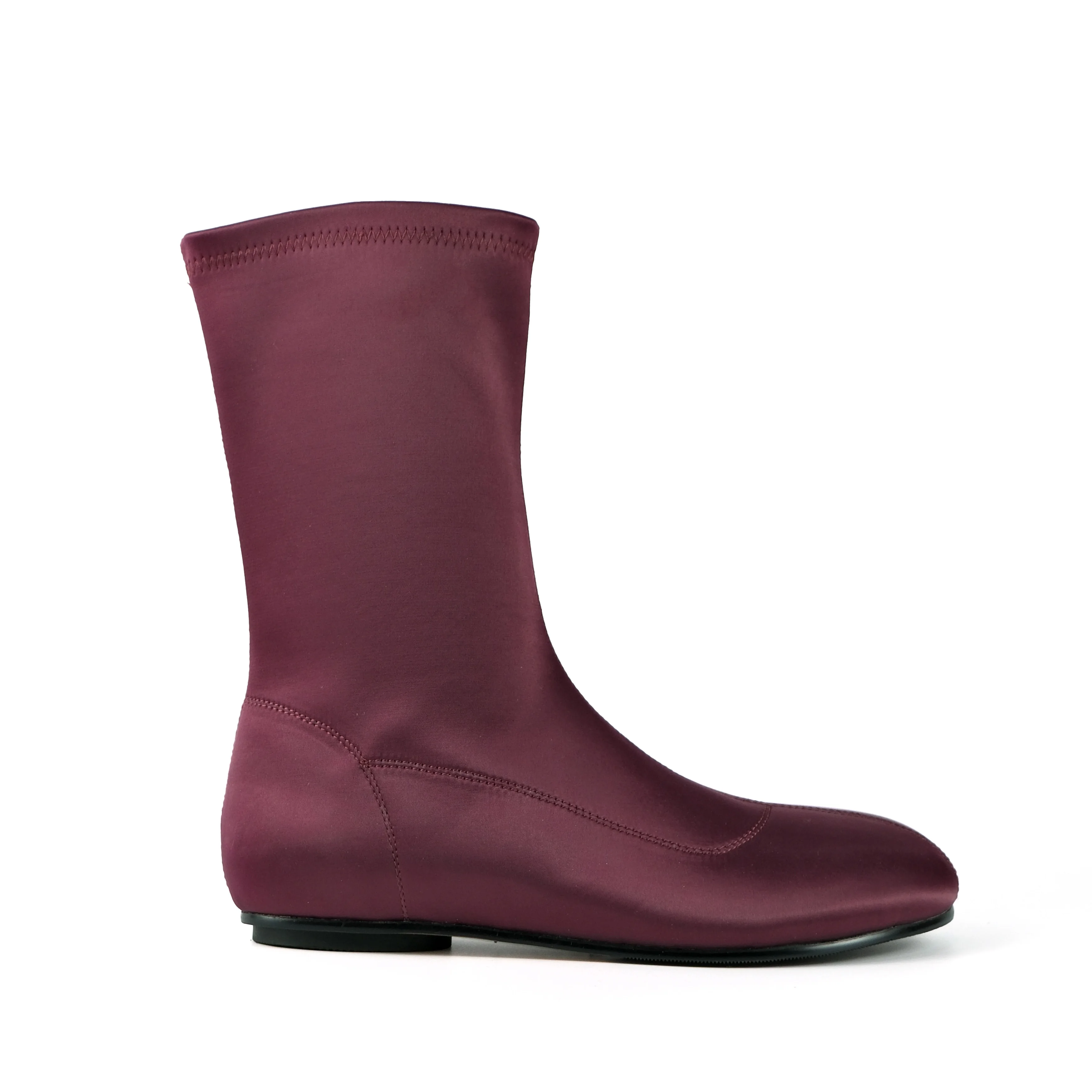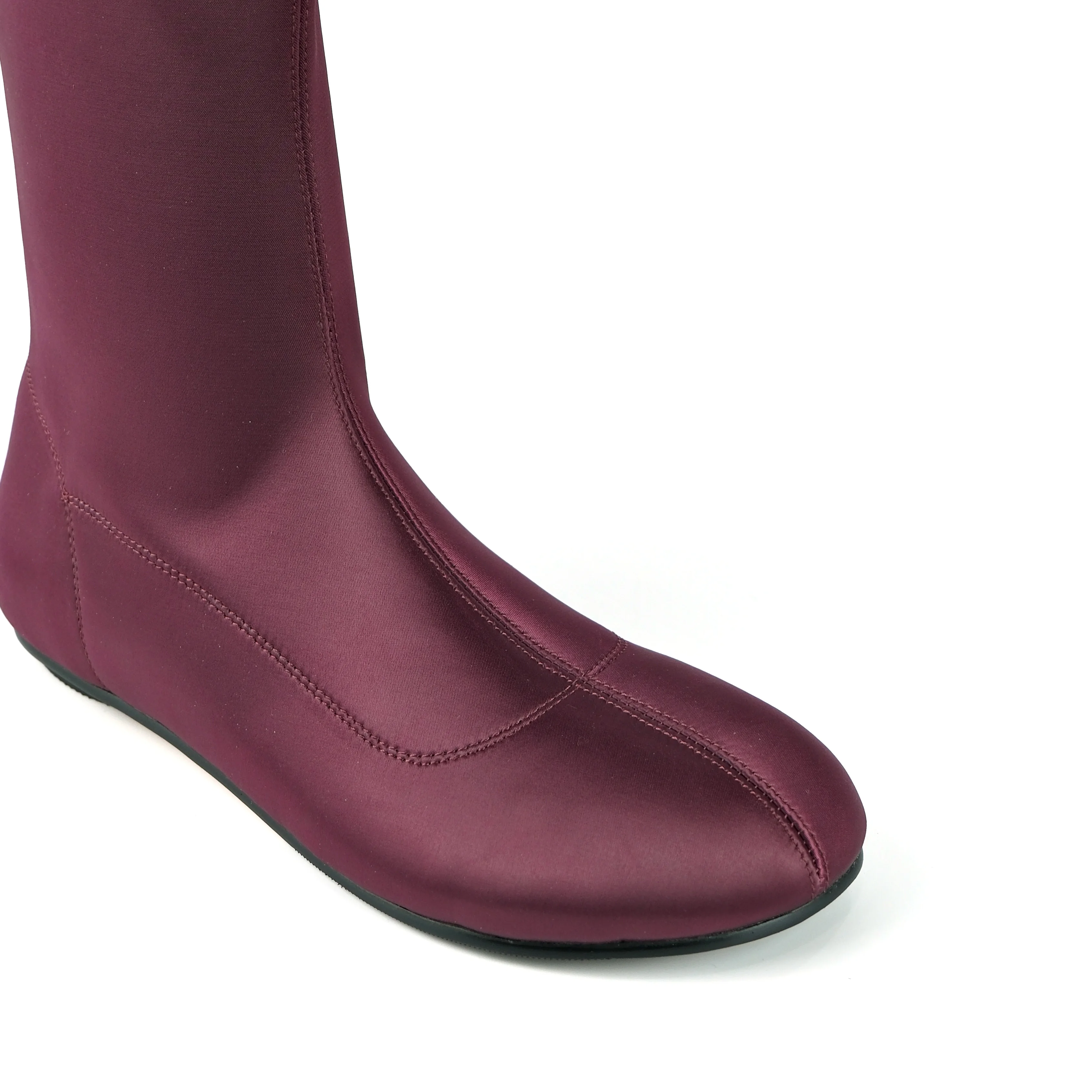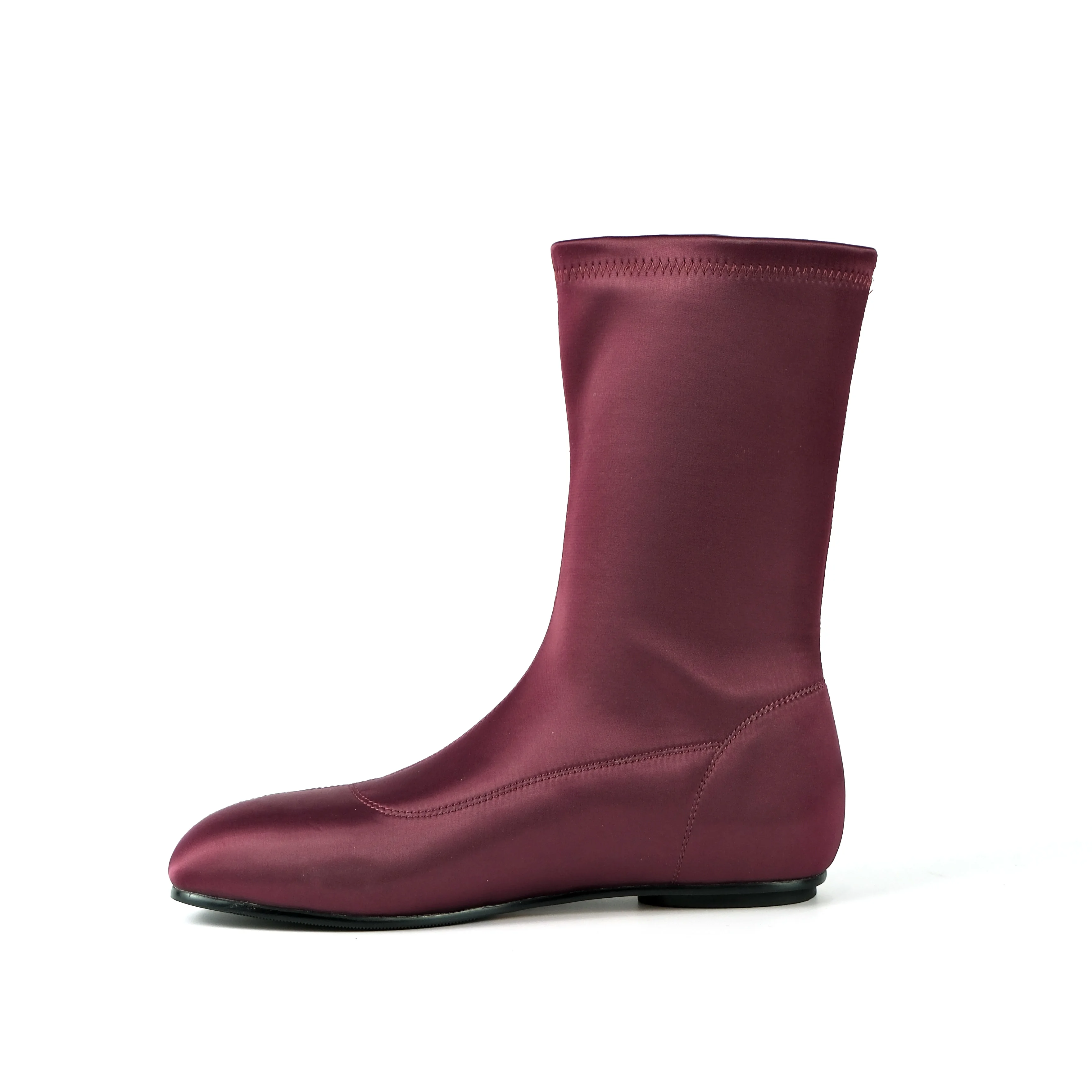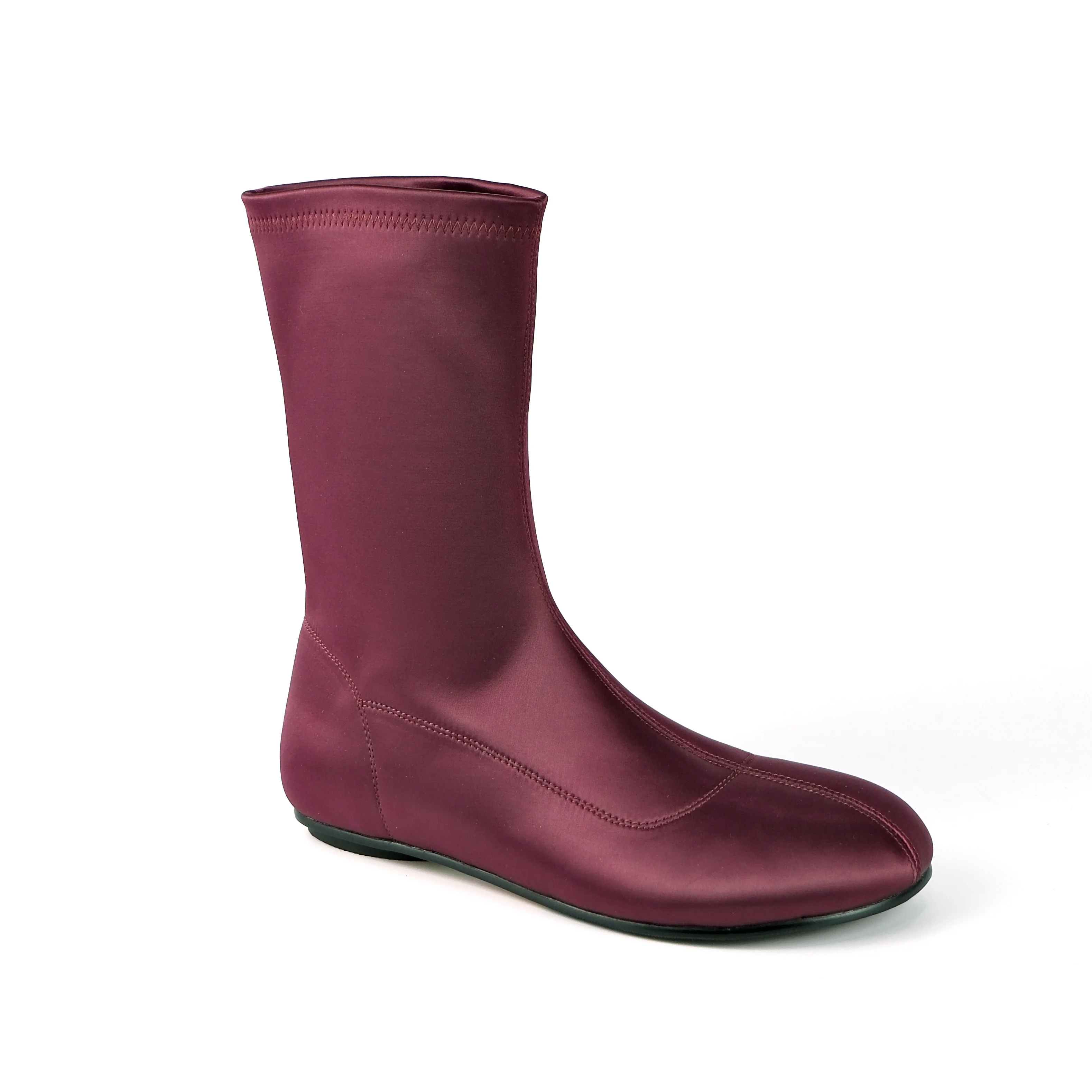 Women's Burgundy Satin Mid-Calf Boots-Slim-Fit Flat Heel Slip-On Fashion Casual Dress Footwear 2026 Autumn
