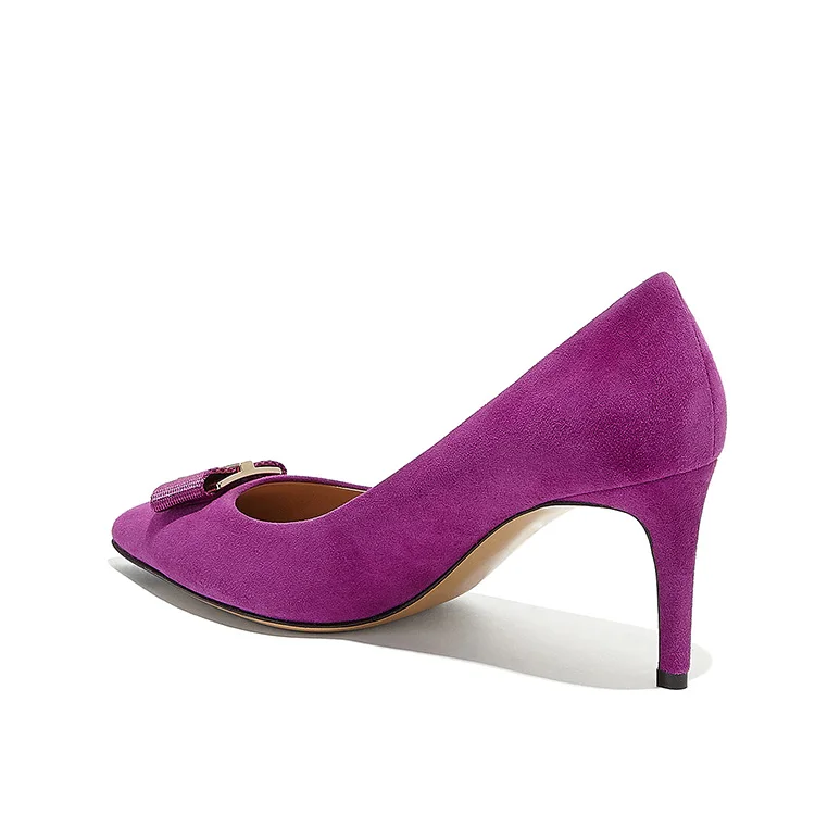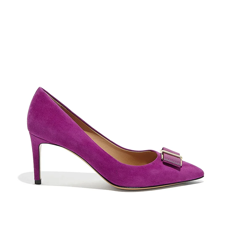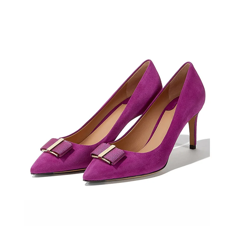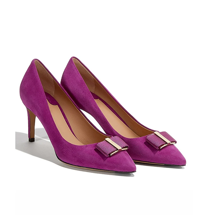 Factory Direct Women Fuchsia Suede Pumps Pointed Toe High Heel Bow Accent Custom Logo Party Wedding Wholesale