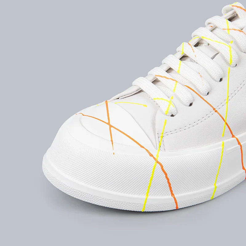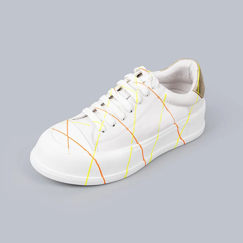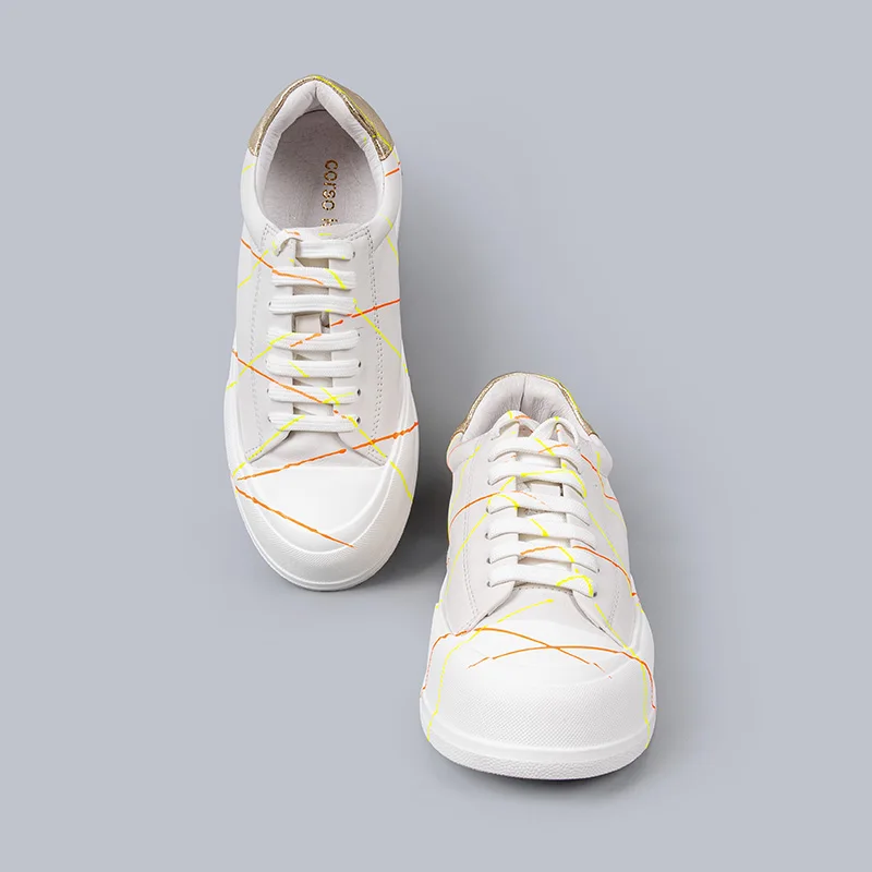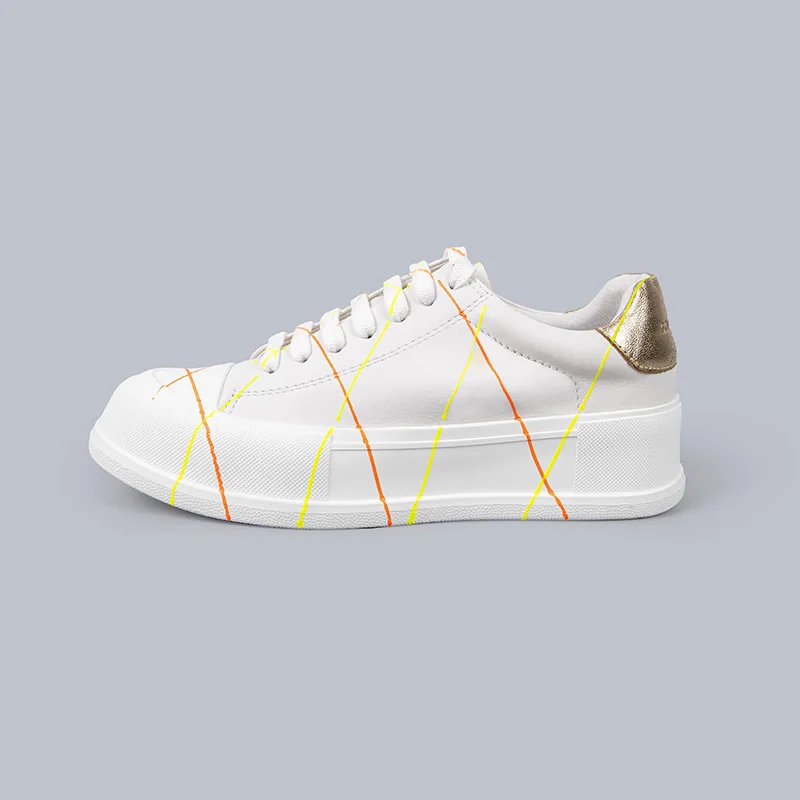 White Leather Platform Sneakers Women Neon Stripes Gold Heel Accent Fashion Casual Sports Shoes Ladies Comfortable Footwear