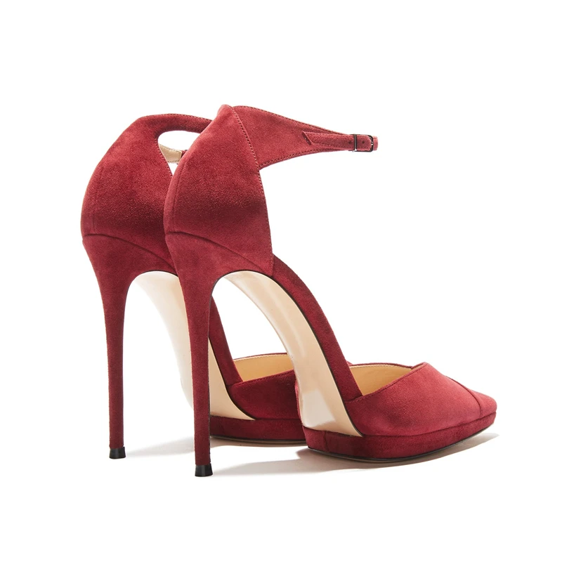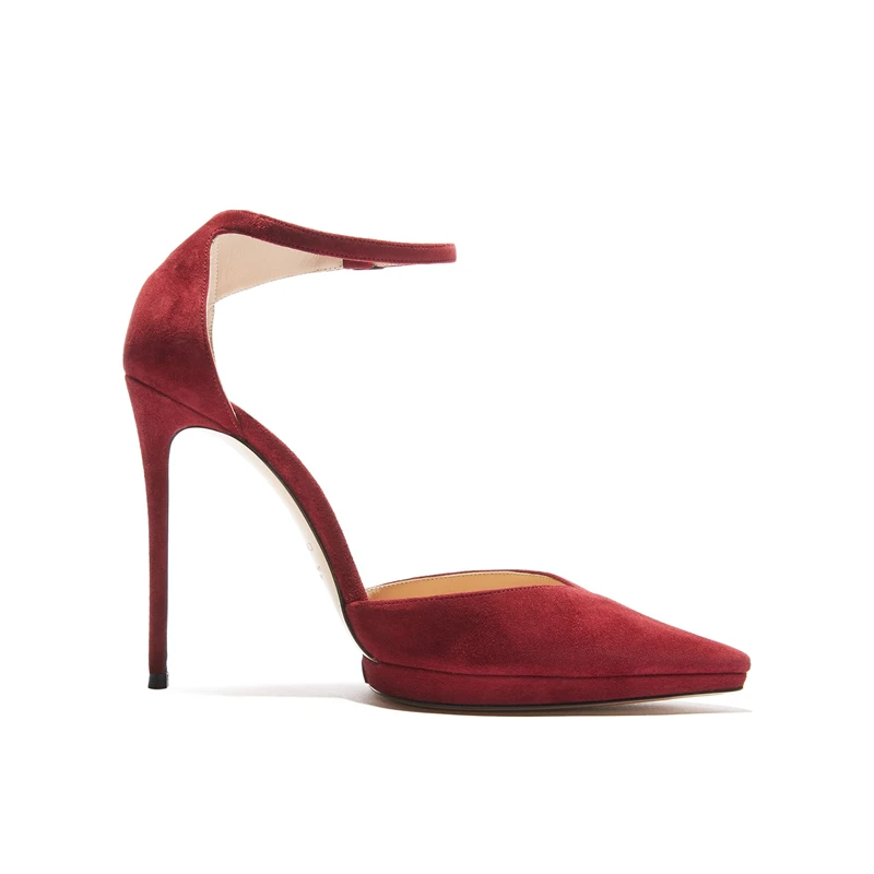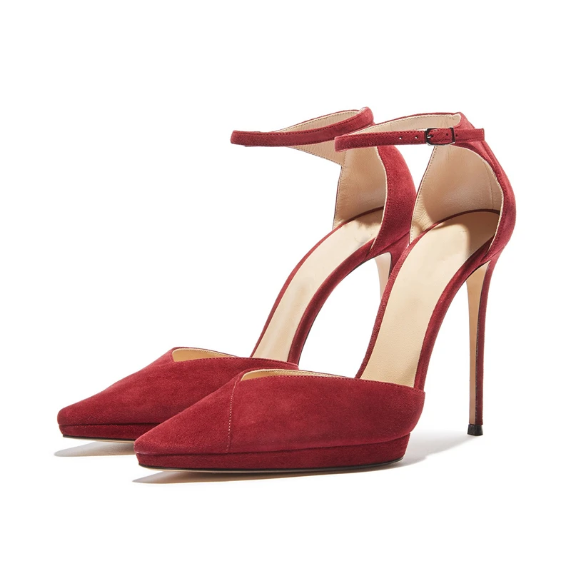 Women Red Suede Pointed Toe Pumps Stiletto Heel Ankle Strap Luxury Dinner Party Wedding Evening Dress Shoes Dazzling Wholesale