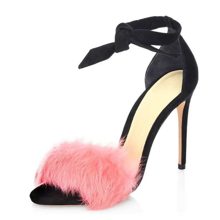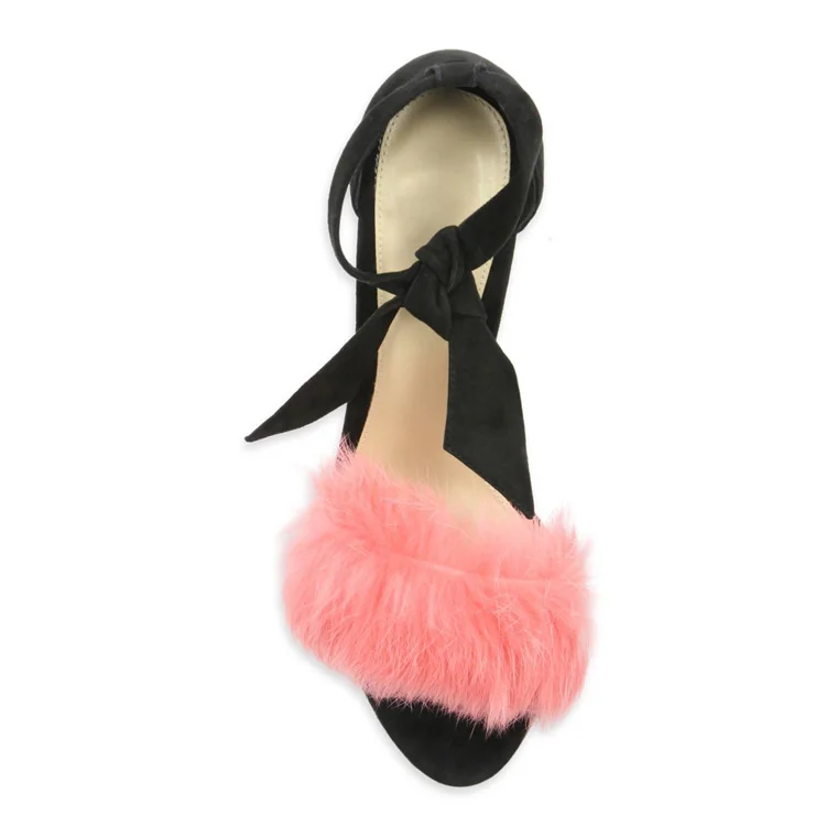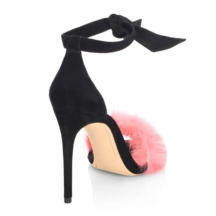 Women Black Suede Sandals Pink Faux Fur Accent Stiletto Heel Hight Heels Luxury Party Evening Dress Shoes Comfort Wholesale