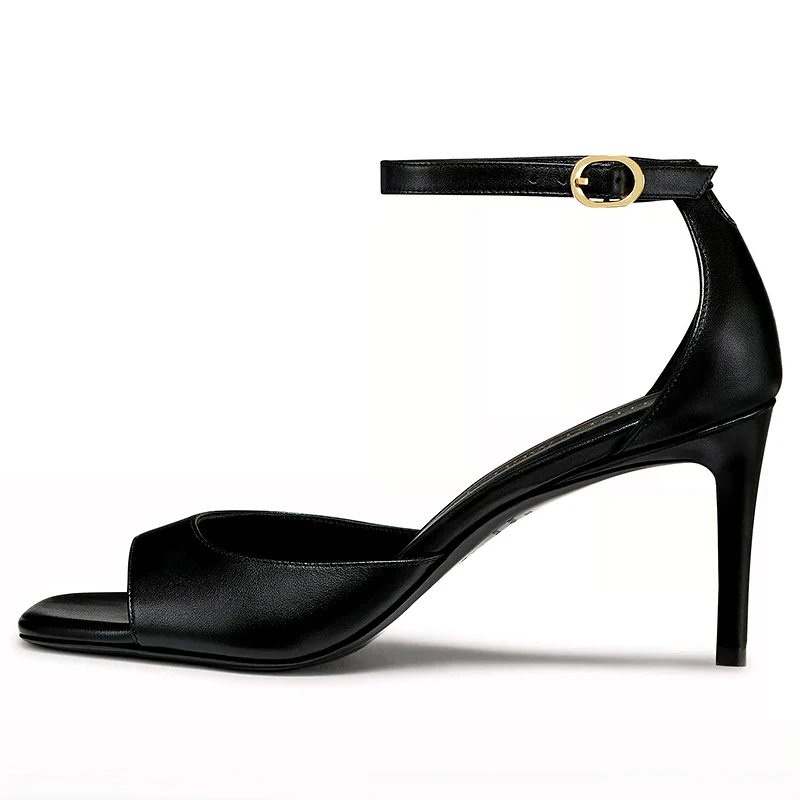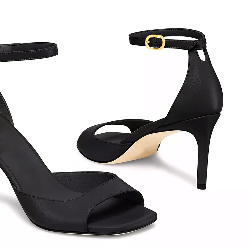 Black Leather Peep Toe Sandals Stiletto Heel Gold Buckle Ankle Strap Party Evening Dress Shoes Comfort Elegant Wholesale OEM ODM