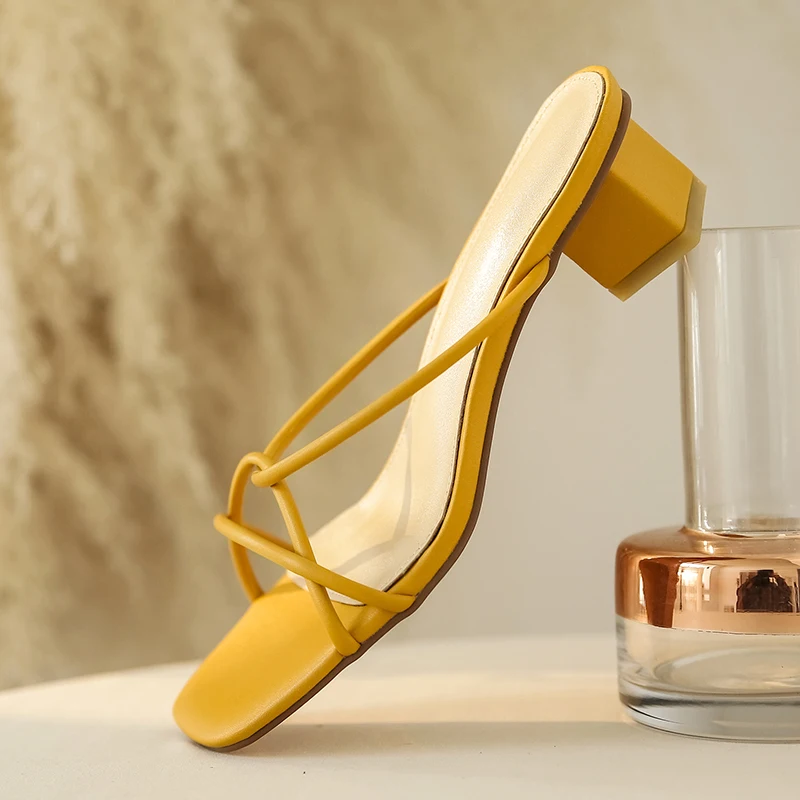 Women Summer Sandals Yellow Square Toe Block Heel Strappy Beach Resort Comfortable Slippers Wholesale