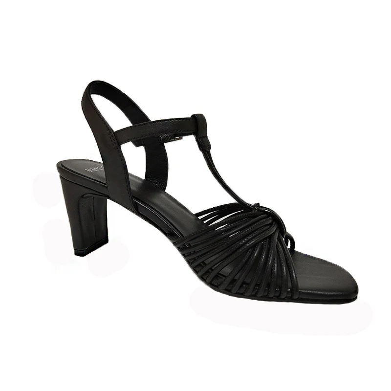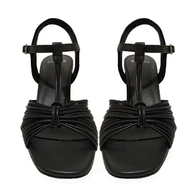 Casual Black Leather Woven T Strap Sandals Block Heel Ankle Strap Luxury Summer Outdoor Walking Daily Comfort Elegant Wholesale