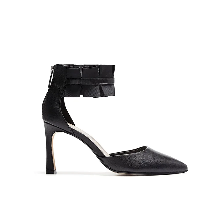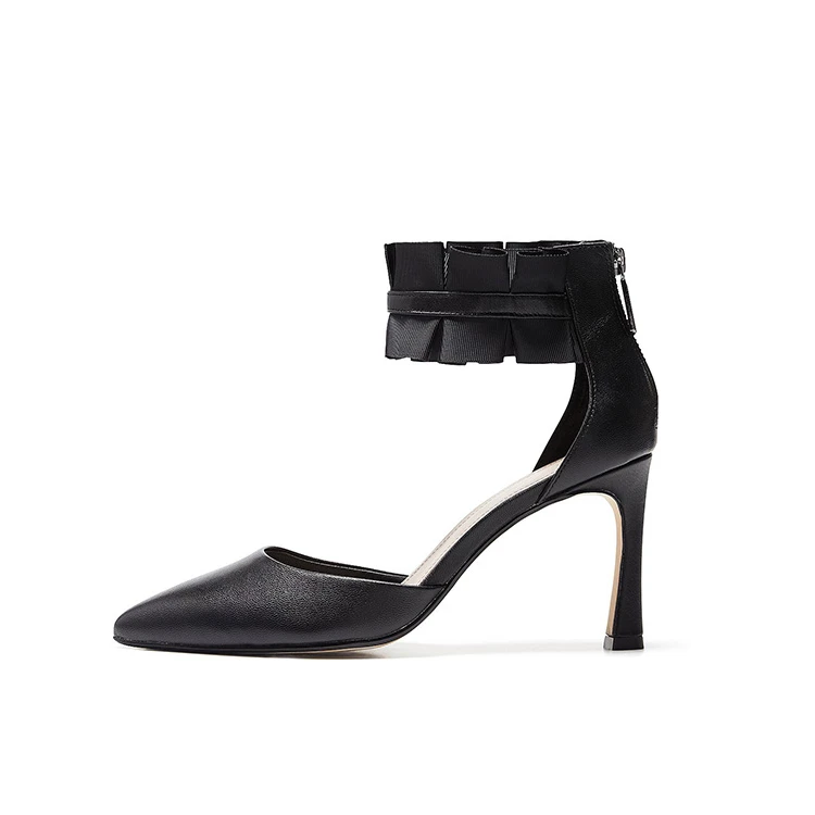 Black Leather Ankle Strap Pumps Ruffle Accent Stiletto Heel Sweet Elegant Office Date Dinner Party Comfort Wholesale OEM ODM