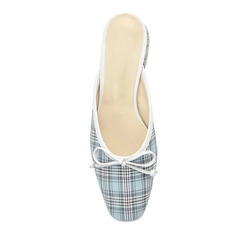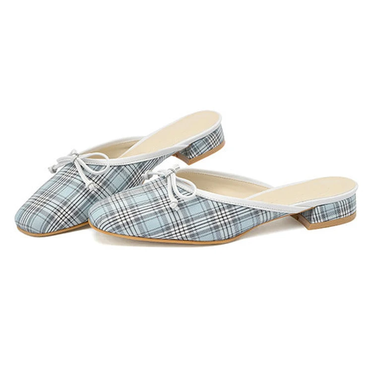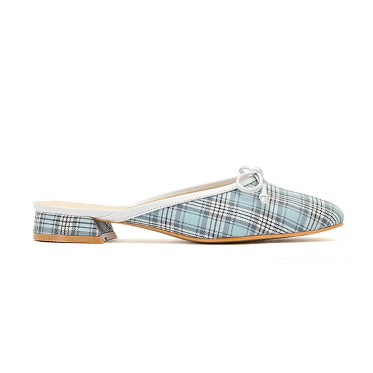 Women Light Blue Plaid Mule Pumps Bow Accent Low Block Heel Vintage Casual Spring Summer Office Daily Comfort Shoes Wholesale
