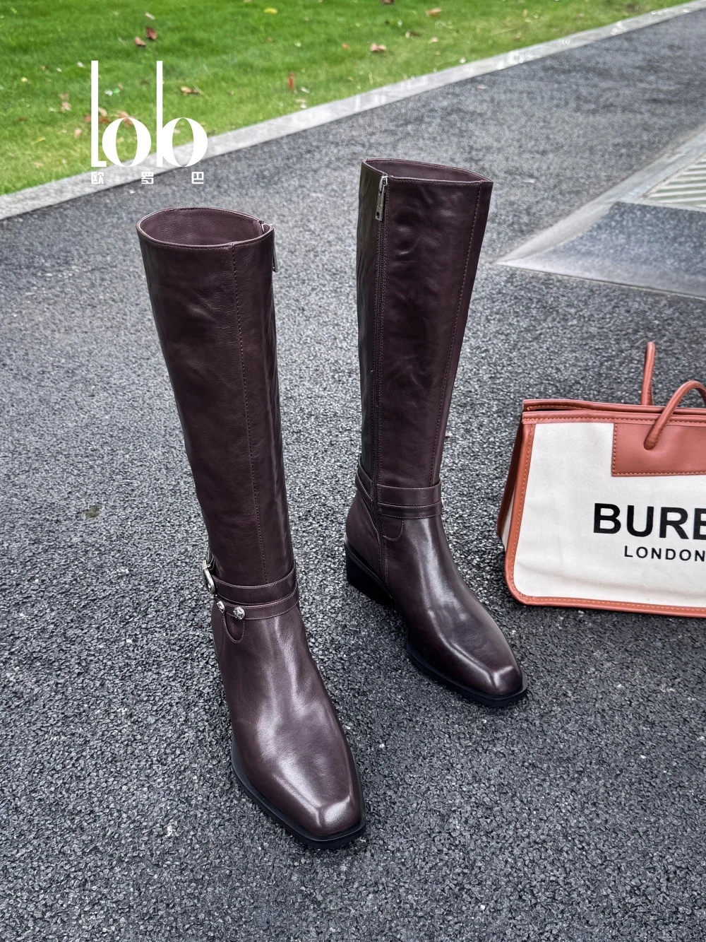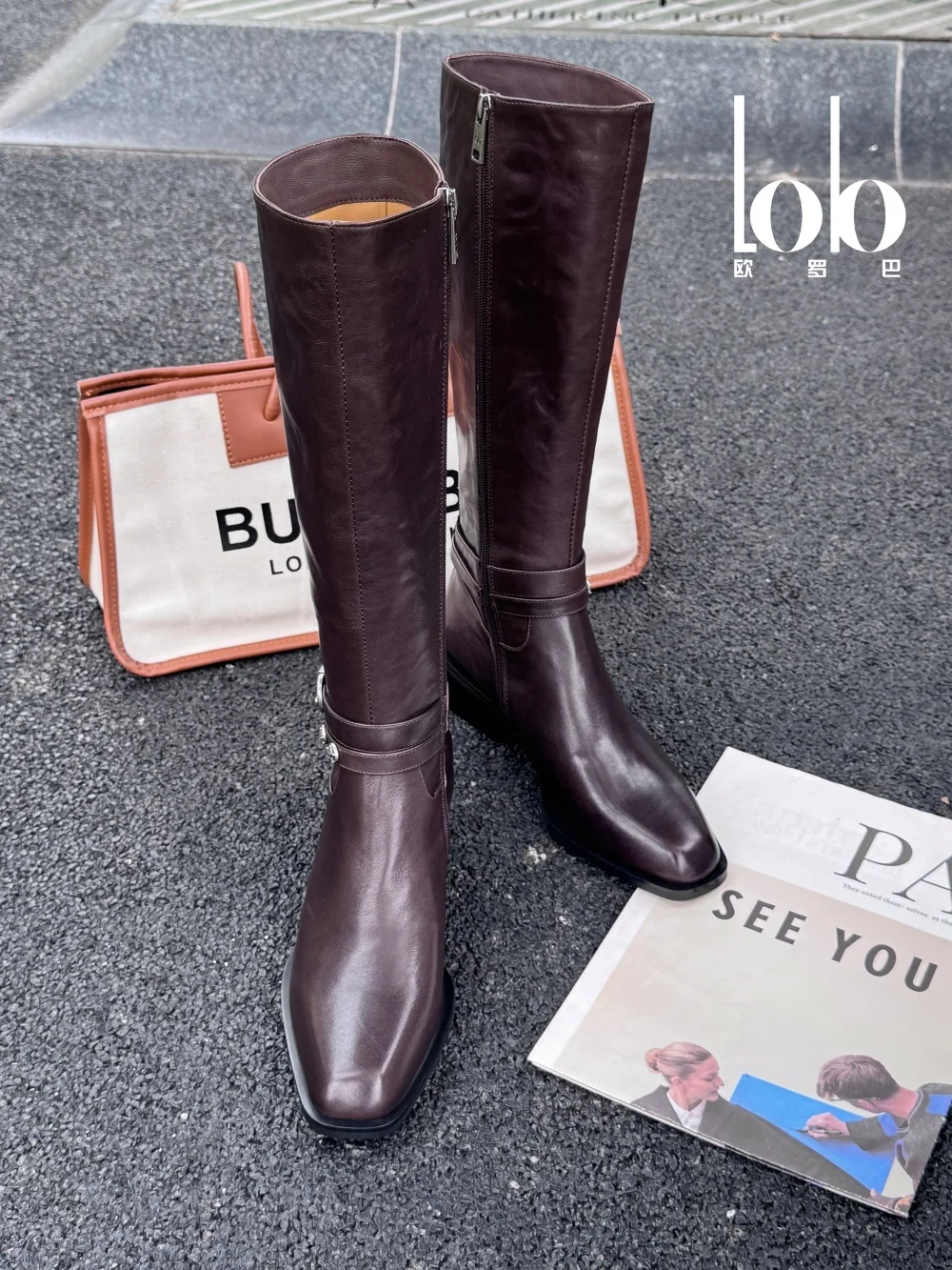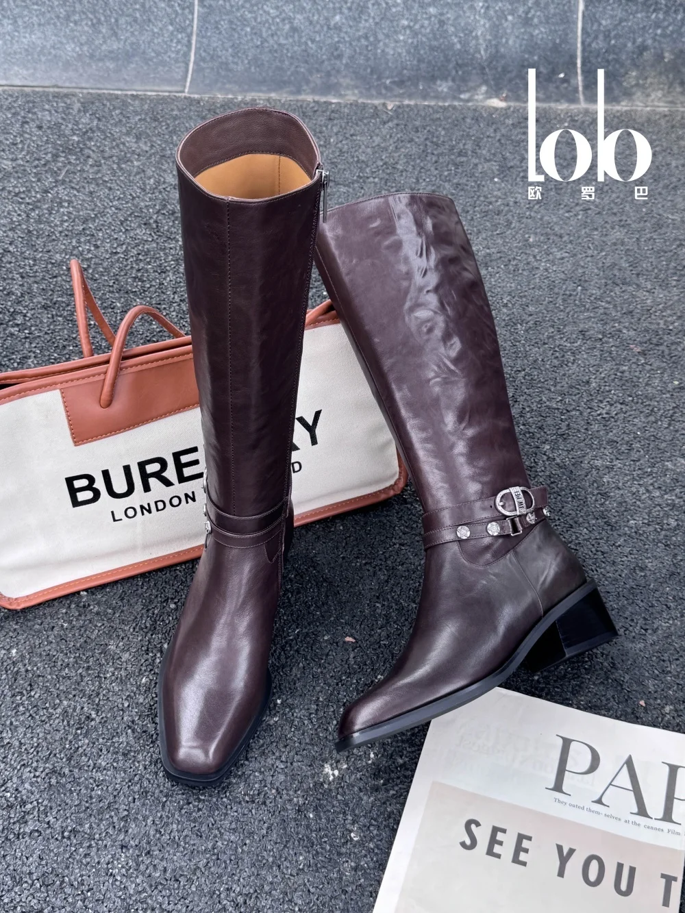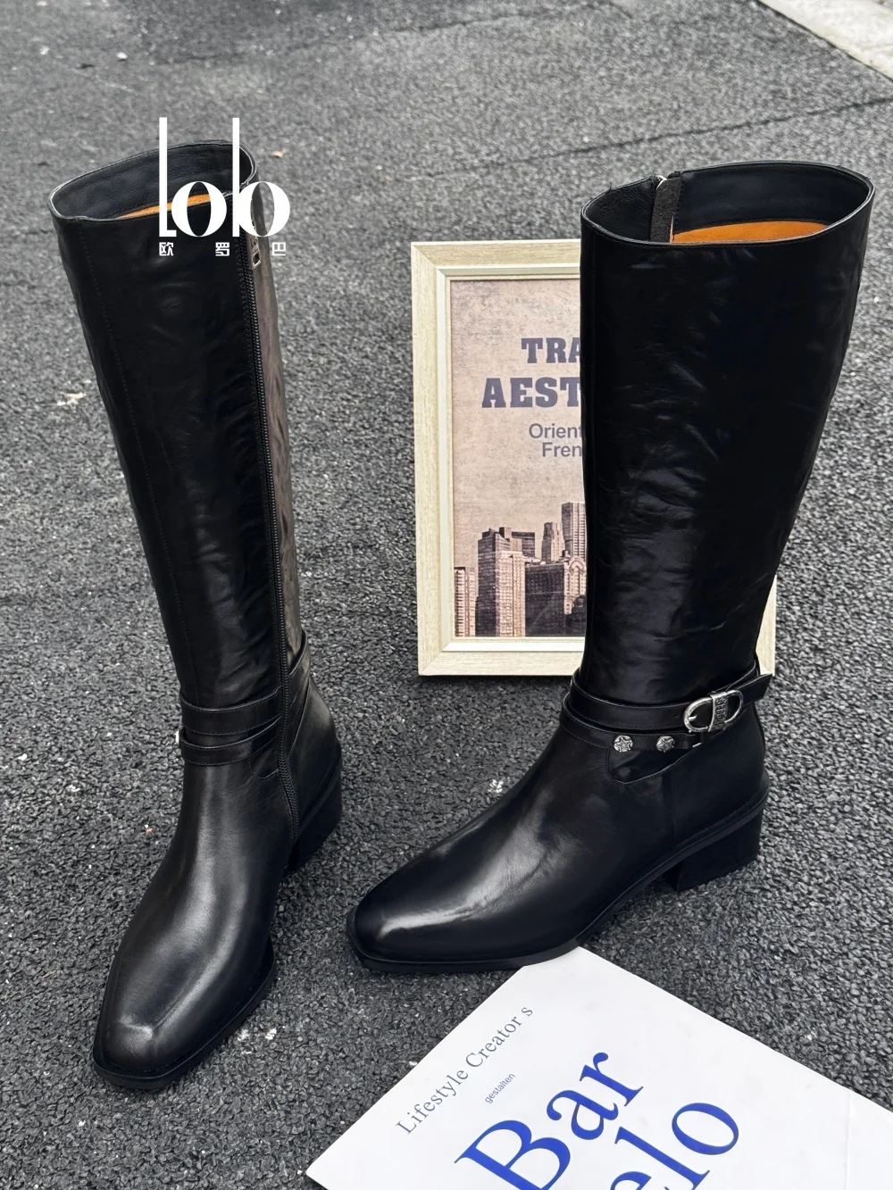 Women's Winter Soft Leather Buckle Design Knee High Boots Solid Color Height Increasing Zipper Western Women's Shoes