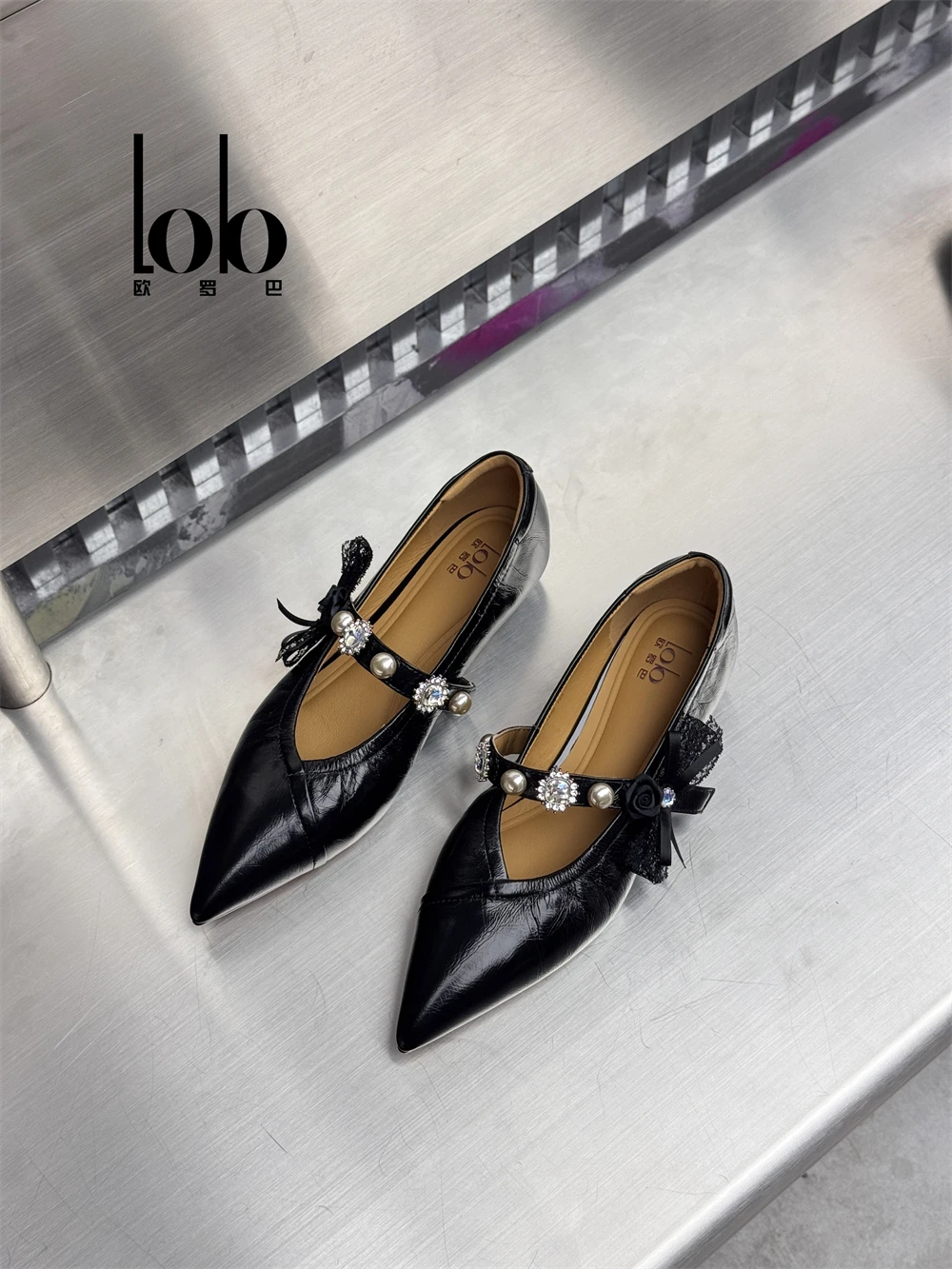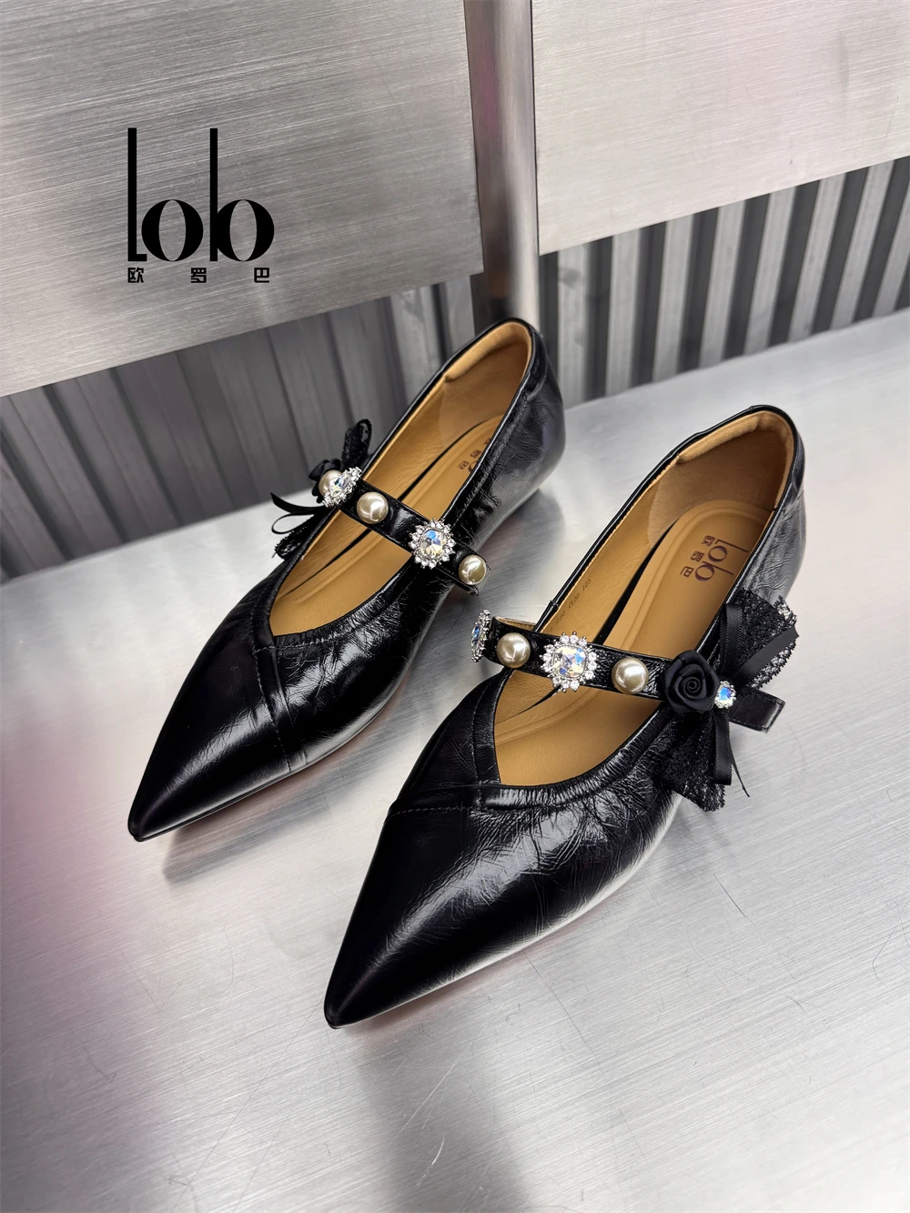 Women's Fashionable Spring Autumn Ankle Strap Shoes 3cm Sheepskin Ballet with Pearl Bowknot Breathable and Non-Slip