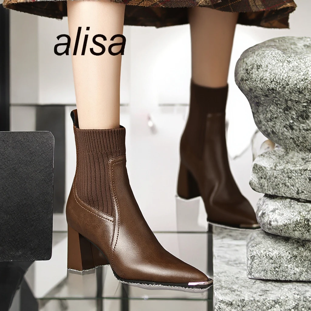 LOB Women's Breathable Light Weight Anti-Slippery Solid Ankle Bootie Genuine Leather High Heel Winter Autumn Boots Slip-On