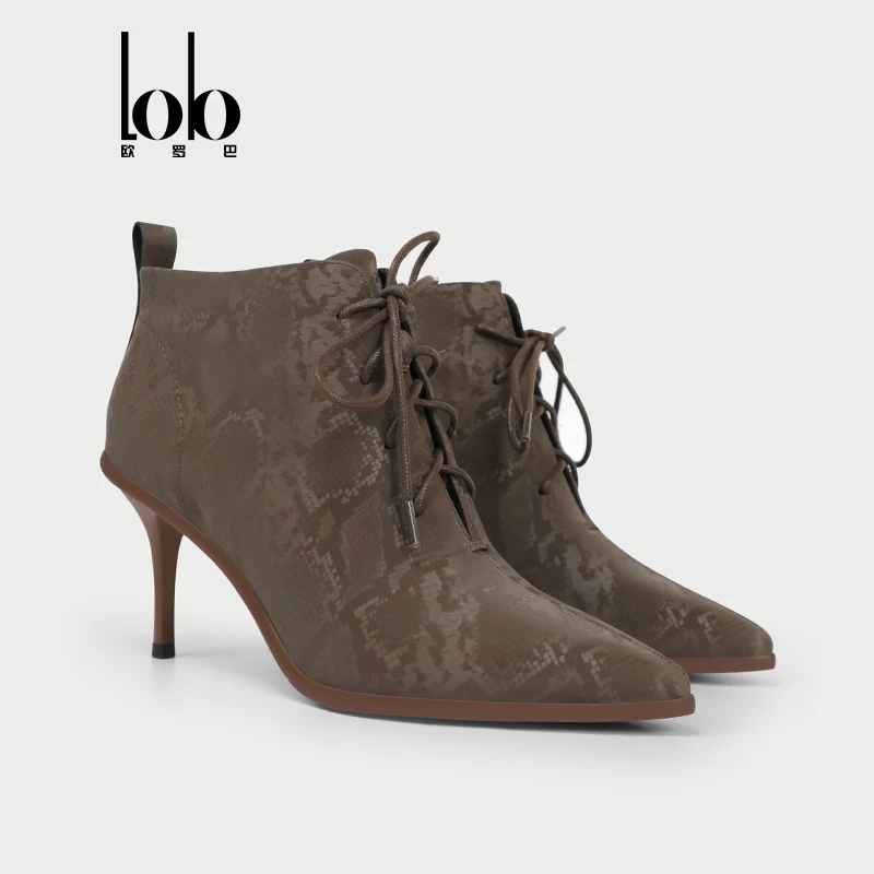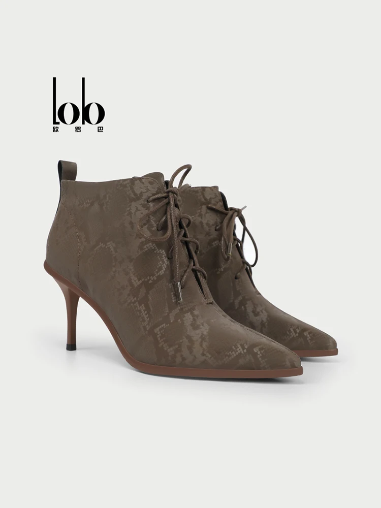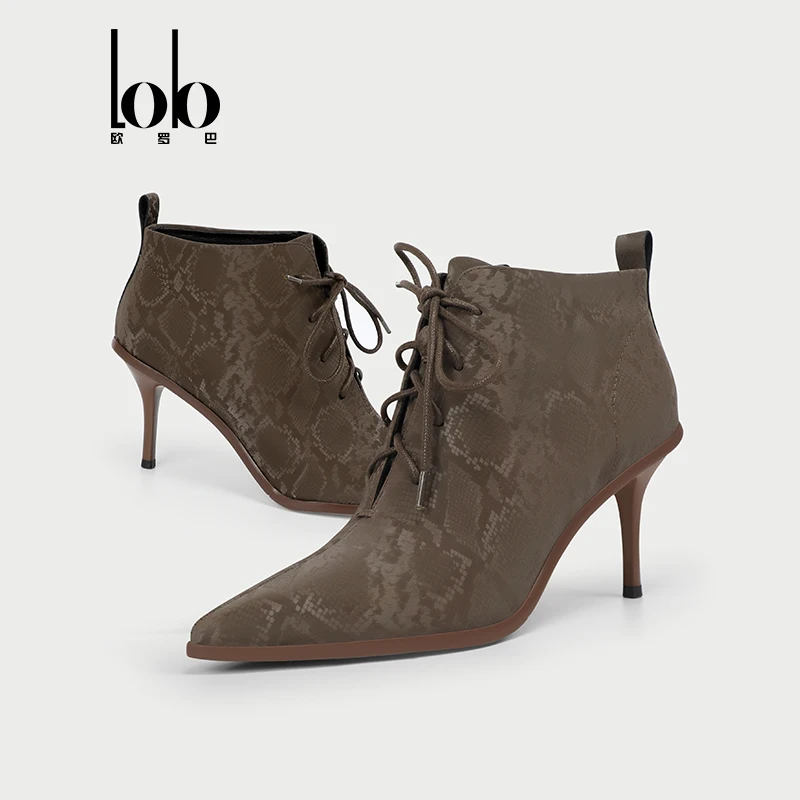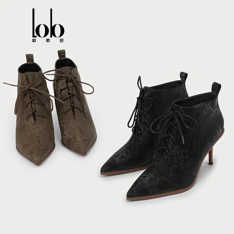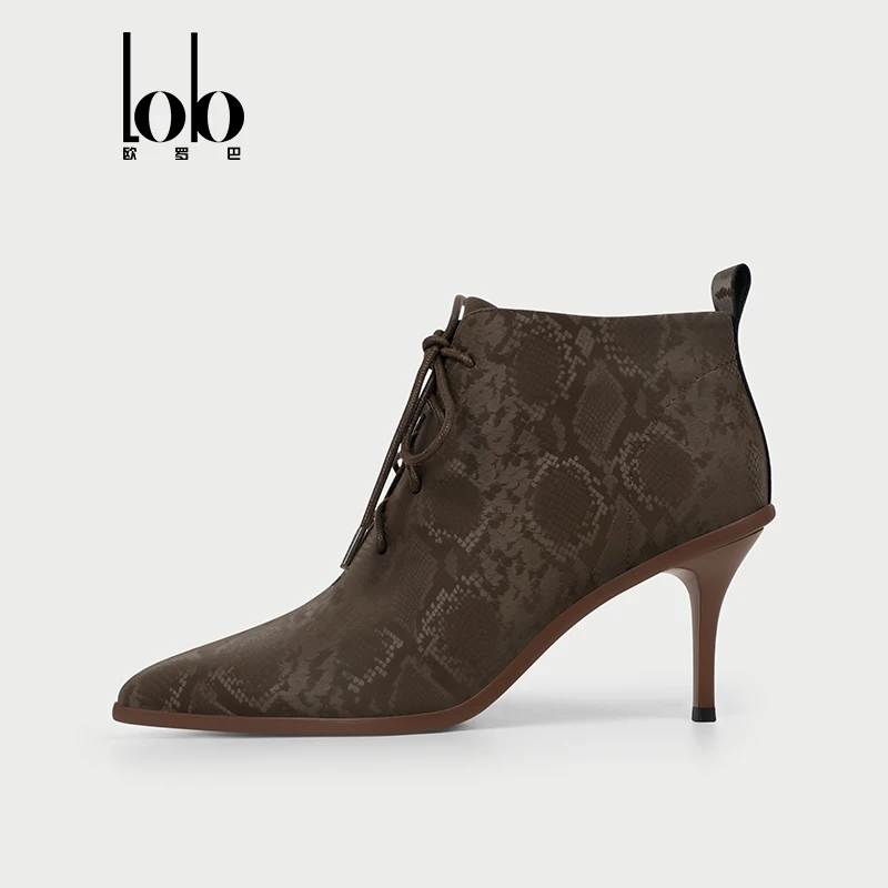 LOB Women's Classic Elastic Velvet Genuine Leather High Heels Fish Mouth Sloping Heel Large Tube Pointed Lace-Up Ankle Bootie