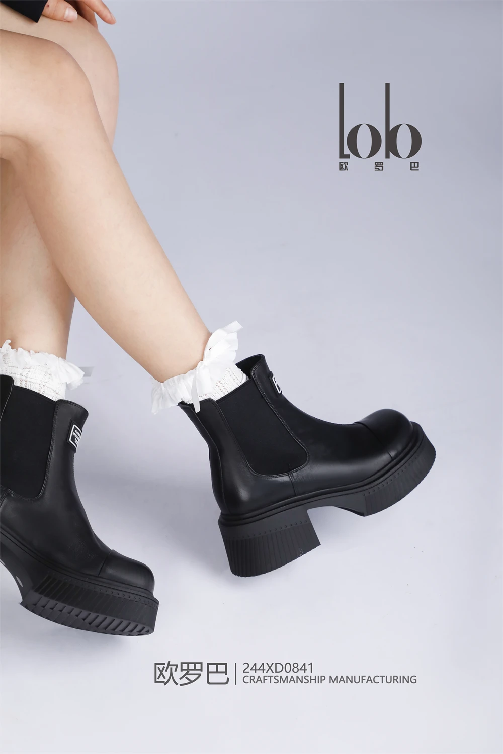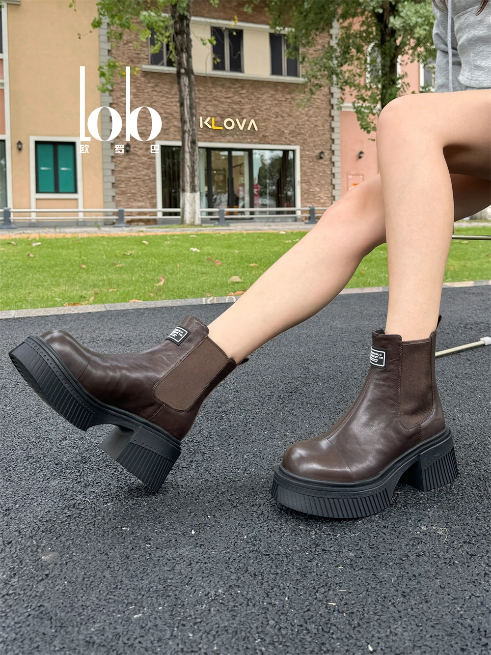 2026 New LOB Women's Elastic Slip-On Flat Chunky Block Heel Platform Sole Ankle Bootie Lightweight Autumn Winter Genuine Leather