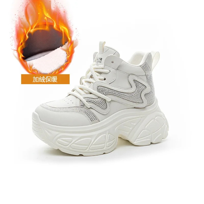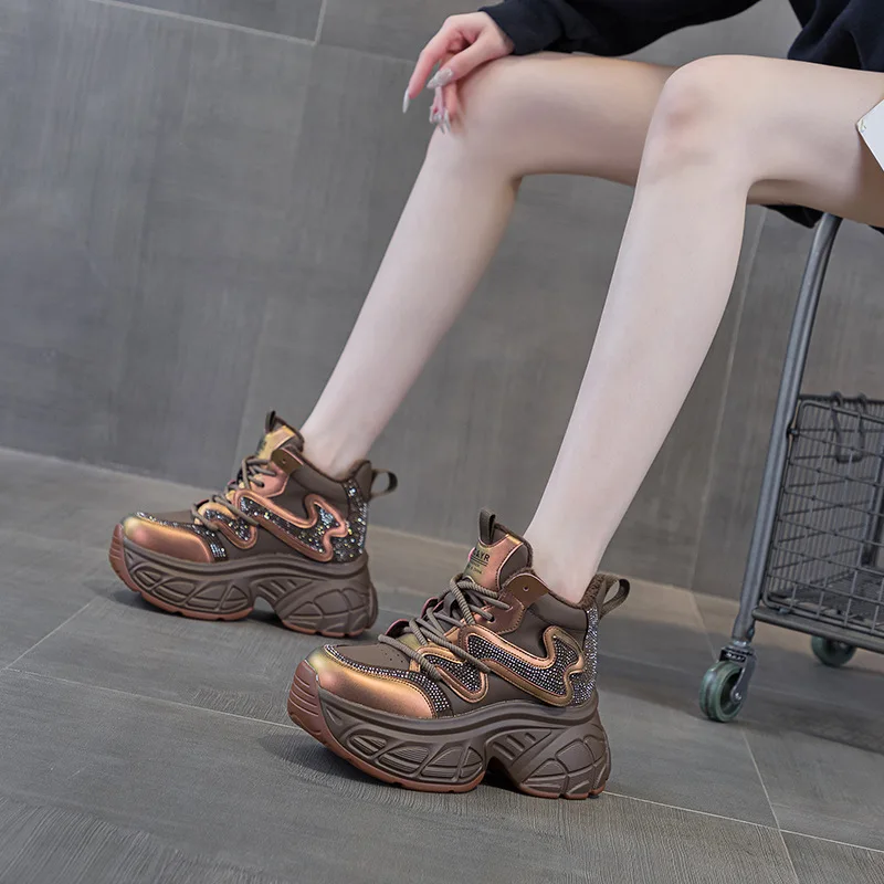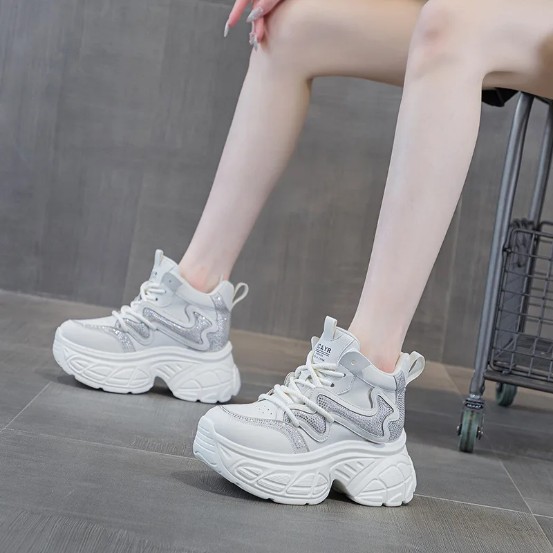 High quality thick soled 9CM women's shoes, women's 2026 spring new rhinestone casual fashion sports shoes