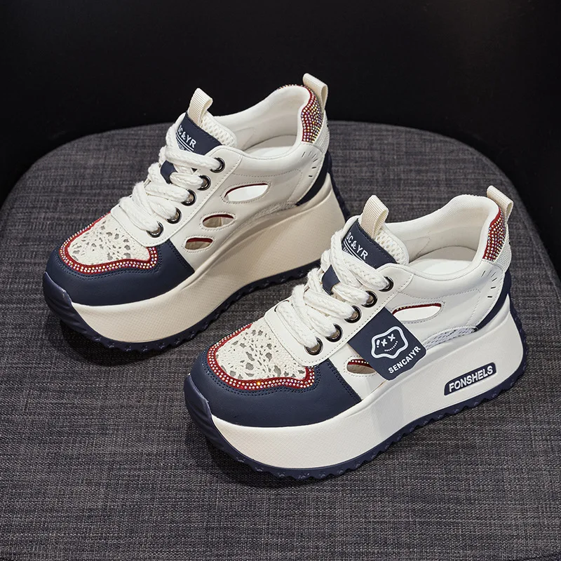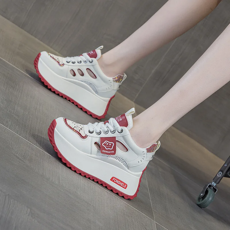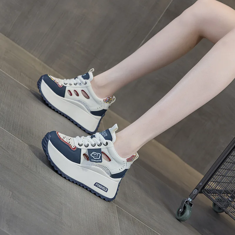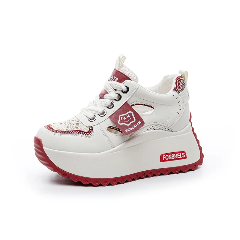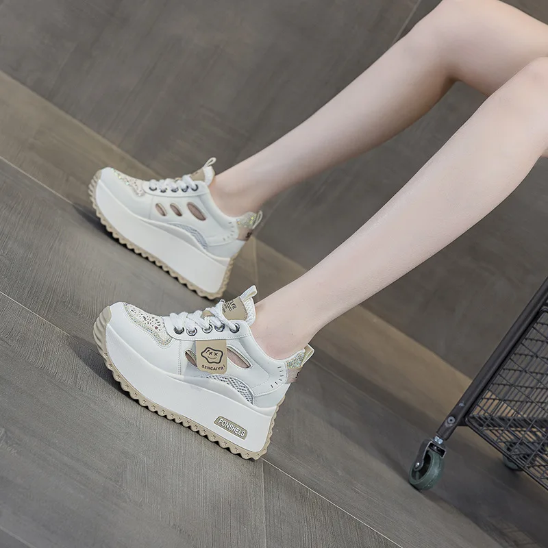 Women's Leather 2026 Spring and Summer Mesh Casual Round Thick Sole with a Height Increase of 8CM Casual Sports Shoes