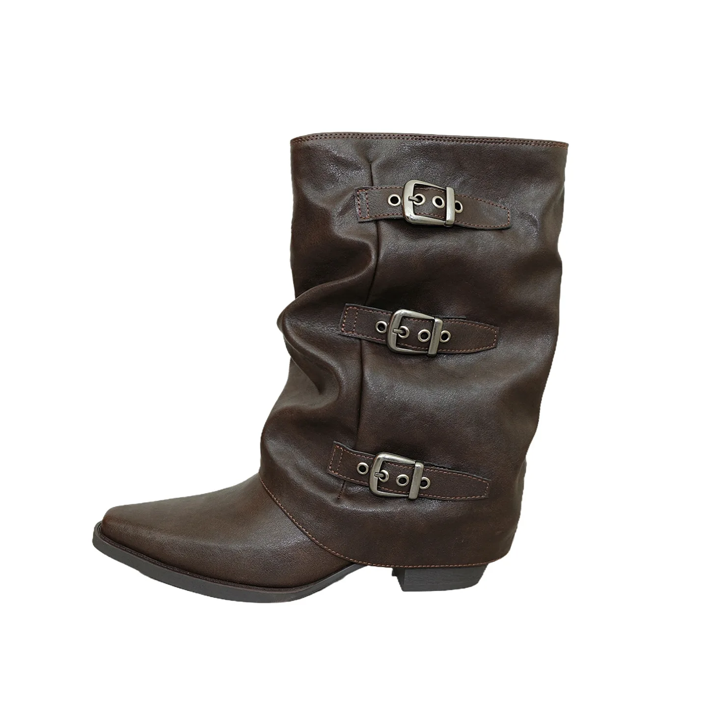 Wholesale high-quality pointed ladies' Martin boots, belt buckle, thick heel, knight fold stacking boots, customized design