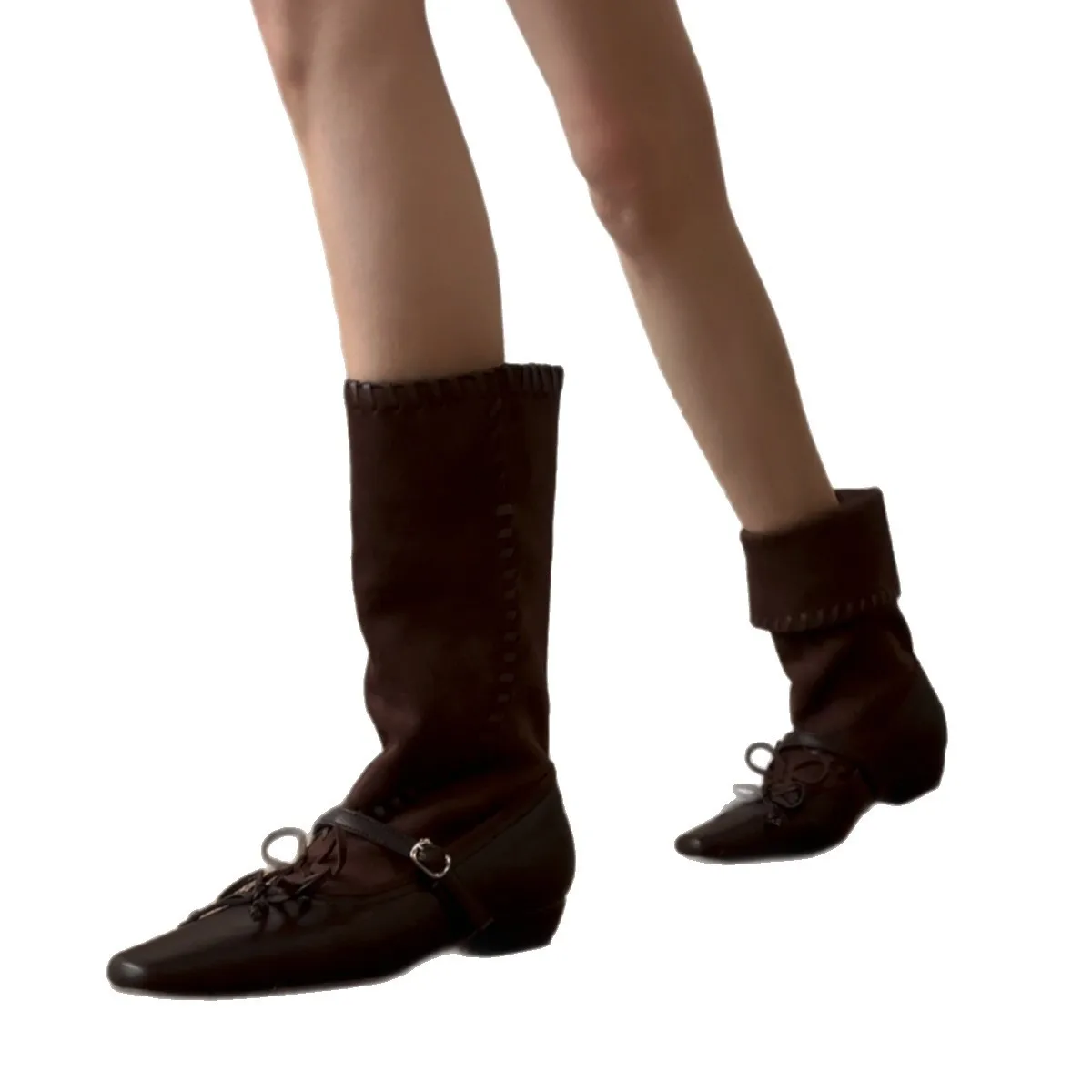 Wholesale niche woven strap retro square toe mid leg boots for women's new two-piece foldable thick heel spliced knight boots