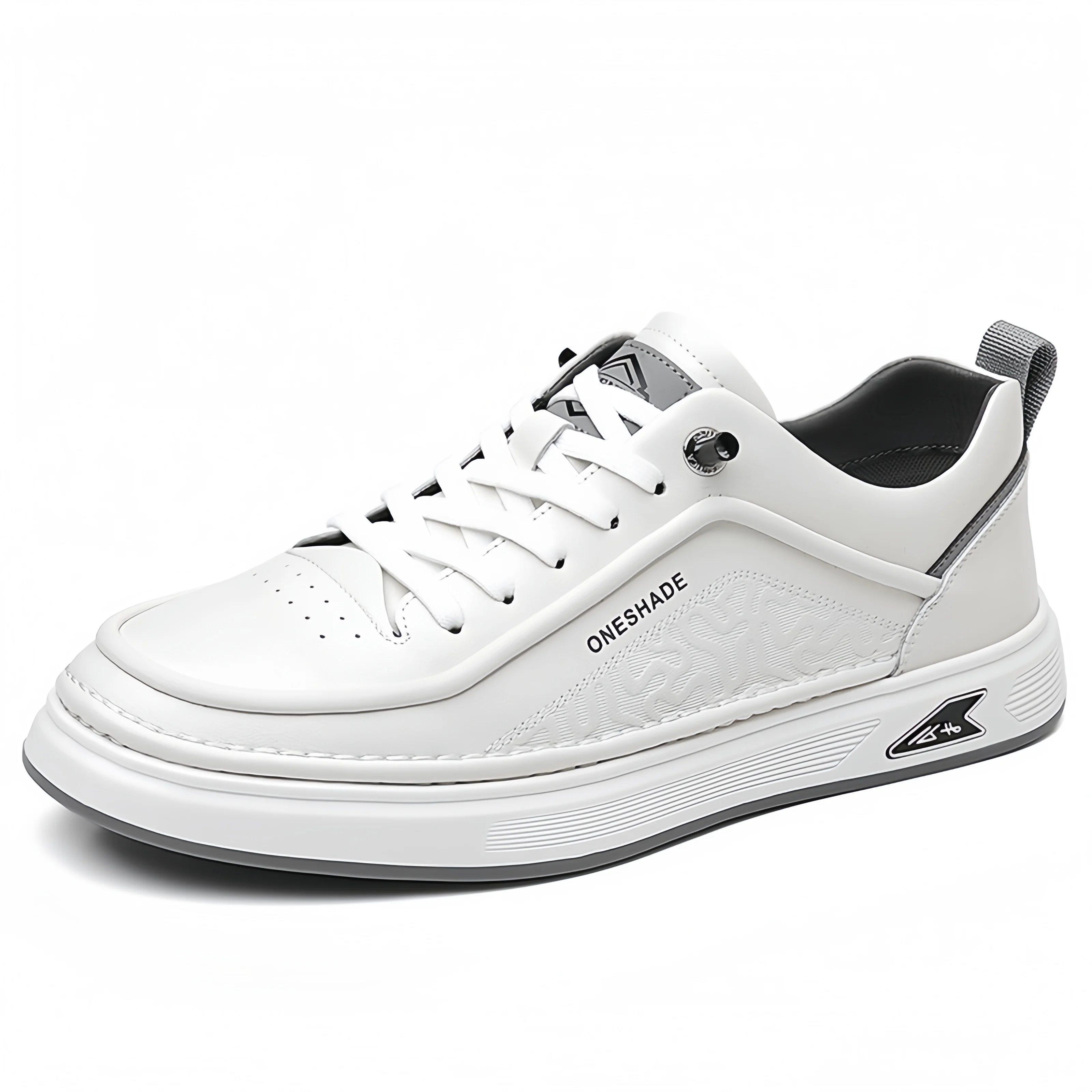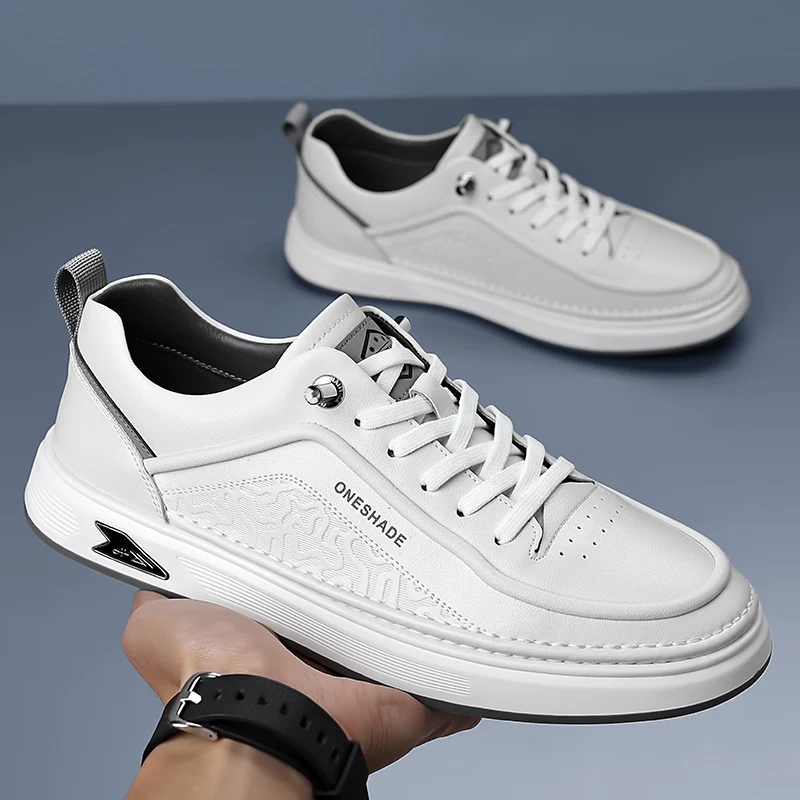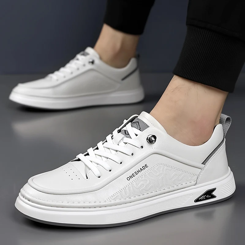 Men's Comfortable Anti-Slippery Black Leather Upper Sneakers Lace-Up Closure Skateboard and Running Walking Shoes