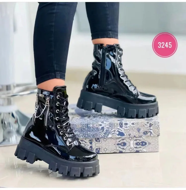Wholesale Womens Black Fashion Winter Patent Leather Waterproof Luxury Designer Platform Chunky Heel Boots Women Shoes 2023