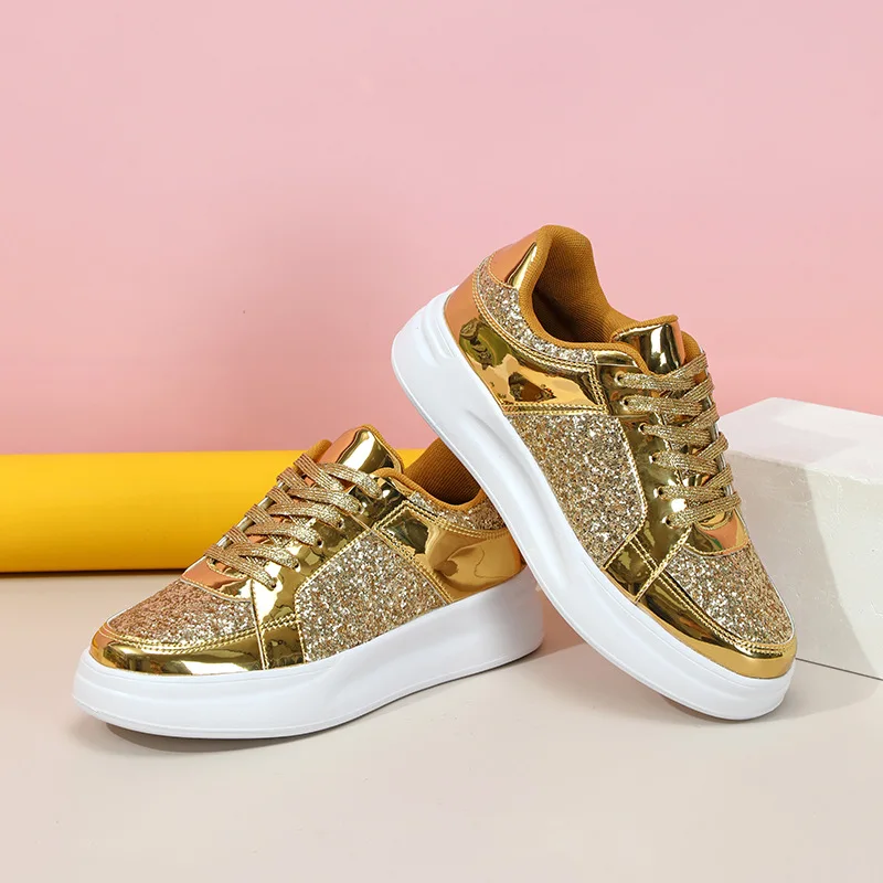 Women Luxury 2026 Sequins Gold Leather Sneakers Flat Non-slip Casual Shoes Ladies Sports Comfortable Walking Outdoors Shoes