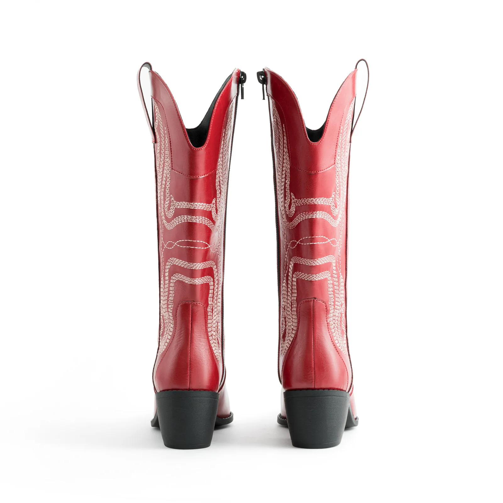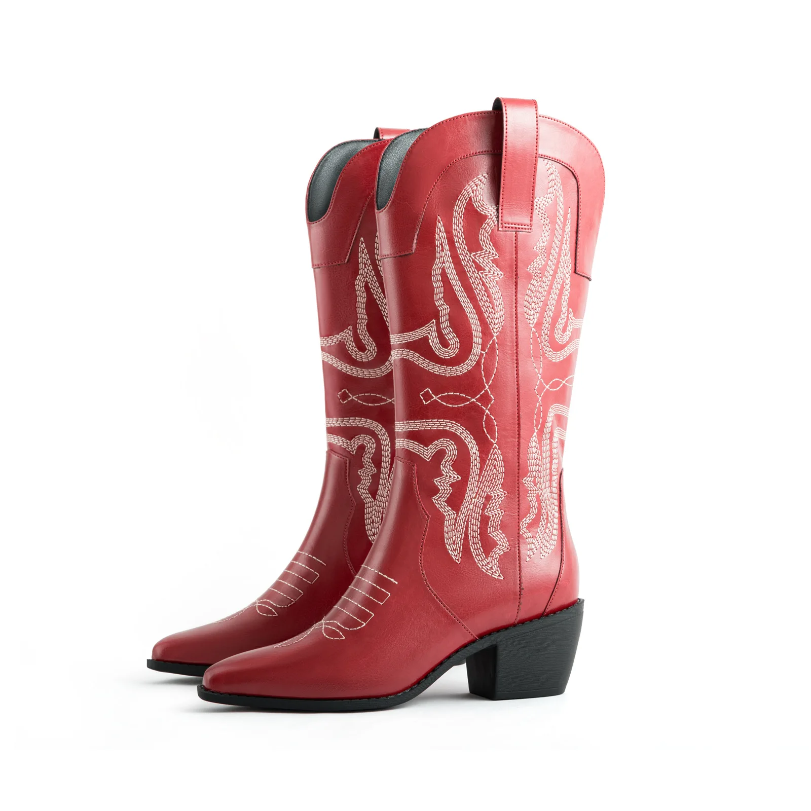 Comfort Fit Elegant Mid-Calf Cowboy Leather Casual Boots Block Heel Pointed Toe Denim Upper Height Increasing Boot for Female